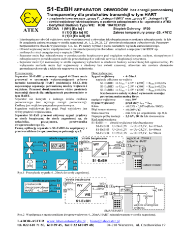 S1-ExBH SEPARATOR OBWODÓW bez energii pomocniczej Transparentny dla protokołów transmisji w tym HART - urządzenie towarzyszące „grupy I”, „kategorii (M1)” oraz „grupy II”. „kategorii (1)” - obwód wejściowy iskrobezpieczny o poziomie zabezpieczenia ia - zgodność z ATEX - Certyfikat Badania Typu WE: KDB 10ATEX129 CECHA I (M1) [Ex ia] I Stopień Ochrony IP20 II (1)G [Ex ia] IIC Zakres temperatury pracy -25..+70°°C II (1)D [Ex iaD] 20 ATEX - Iskrobezpieczny obwód wyjściowy może współpracować z obwodem iskrobezpiecznym o poziomie zabezpieczenia ia lub ib urządzenia zainstalowanego w strefie zagrożonej „0, 1, 2, 20, 21, 22” dowolnych mieszanin wybuchowych. Parametry bezpieczeństwa obwodu wyjściowego Uo, Io, Po należy wybrać z pięciu wariantów wg kodu zamówieniowego. - Obwód wejściowy może współpracować z nieiskrobezpiecznymi obwodami urządzeń o napięciu Um=253V np. zasilanych z sieci energetycznej o napięciu 230Vac. - Separator może być zainstalowany w pomieszczeniu bezpiecznym pod względem wybuchowym, suchym, niezapylonym i zabezpieczonym przed dostępem osób nie przeszkolonych w zakresie serwisu i eksploatacji separatora. - Separator może być montowany w strefie zagrożonej wybuchem w obudowie budowy wzmocnionej lub ognioszczelnej. Po wyłączeniu zasilania może być wyjmowany z obudowy bez zwłoki czasowej, albowiem nie zawiera elementów gromadzących energie a także nie nagrzewa się nadmiernie. Przeznaczenie: Separator S1-ExBH przenosząc sygnał 4÷20mA może pracować w systemach wykorzystujących cyfrowe techniki komunikacji HART (modulacja BELL 202) zapewniając separację galwaniczną miedzy wejściem i wyjściem. Przenosi dwukierunkowo różne protokoły transmisji danych dla inteligentnych przetworników w tym HART. Separator nie korzysta z żadnego źródła zasilania pomocniczego (nie wymaga energii pomocniczej). Zasilany jest wejściowym prądem pomiarowym. Sygnałem wejściowym jest prąd. Prąd wyjściowy jest równy prądowi wejściowemu. Separator S1-ExB przenosi aktywny sygnał prądowy ze strefy bezpiecznej do strefy zagrożonej np. do wskaźnika, pozycjonera, przetwornika dwuprzewodowego itp. Cenną aplikację separatora S1-ExBH do współpracy z przetwornikiem dwuprzewodowym pokazuje rys.2. 4...20mA + - 5 6 strefa zagrożona Ex + 5 87.45 - strefa bezpieczna 5 WY+ WY 4...20mA 6 Dane techniczne: Sygnał wejściowy - 4÷20mA napięcie odłożone na wejściu S1-ExBH1 ⇒ UWE = 2,5V + (260Ω + ROBC) • 0,02A S1-ExBH3 ⇒ UWE = 2,5V + (340Ω + ROBC) • 0,02A S1-ExBH4 ⇒ UWE = 2,5V + (290Ω + ROBC) • 0,02A Każdorazowo należy wybrać wykonanie szacując potrzebną maksymalną Robc. napięcie wejściowe - max 30V Sygnał wyjściowy - prąd stały IWY = IWE Klasa - ±0.05% - 0,05%•(Robc/100Ω) Błąd temperaturowy - ±0.005%/°C Stała czasowa - min 5ms po uzgodnieniu np. 0,1s Napięcie próby izolacji - 2,5 kV, 50 Hz lub równoważne Kod zamówieniowy S1-ExBH- -- obwód wyjściowy iskrobezpieczny S1-ExBH1 U=24±1,2V ⇒ Uo=25,2V, Io=121mA S1-ExBH3 U=24±1,2V ⇒ Uo=25,2V, Io=89mA S1-ExBH4 U=22±1,1V ⇒ Uo=23,1V, Io=98mA 6 WY- WE+ 1 4...20mA 2 WE- WE 5 + P 6 I - wyjście 4...20mA z systemu HART 1 + 2 - S1-ExBH 5 SMART/HART 6 Rys.1 Przesyłanie sygnału 4...20mA do strefy zagrożonej. strefa zagrożona Ex przetwornik + 5 dwuprzewodowy 4...20mA HART 4...2mA 6 strefa bezpieczna 5 WY+ WY 6 WY- WE WE+ 1 4...20mA 2 WE- 1 + 2 - + - 24V R>250Ω Pomiar S1-ExBH wejście analogowe systemu SMART/HART Rys.2 Współpraca z przetwornikiem dwuprzewodowym 4...20mA HART zainstalowanym w strefie zagrożonej. LABOR-ASTER www.labor-automatyka.pl , [email protected] tel. 022 610 71 80, 610 89 45, fax 0 22 610 89 48; 04-218 Warszawa, ul. Czechowicka 19 Parametry iskrobezpieczeństwa dla S1-ExBH – obwód wyjściowy o poziomie zabezpieczenia „ia”: Zasila i przetwarza sygnał z przetworników dwuprzewodowych 4÷20mA z transmisją Hart, zainstalowanych w strefie zagrożonej na sygnał prądowy wymuszany w obwodzie wejściowym współpracującym ze strefą bezpieczną. separator jest przeźroczysty (transparentny) dla transmisji Hart. a) Iskrobezpieczny obwód wyjściowy „Wyjście”- zaciski „5-6” o poziomie zabezpieczenia „ia”: Wartości Co, Lo oraz parametry kabla podłączeniowego L/R należy przyjąć wg niżej przedstawionej tabeli: Po L/R [µ µH/Ω Ω] [W] I i IIA IIB IIC Typ Uo [V] Io [mA] S1-ExBH1 25,2 121 0,76 374 187 46 S1-ExBH3 25,2 89 0,56 510 255 63 S1-ExBH4 23,1 98 0,57 506 253 63 Lo [mH] I i IIA IIB 14 8,4 0,5 1 0,05 0,1 29 17 10 1 0,02 0,1 24 15 10 1 0,05 0,05 IIC 0,64 0,2 0,1 2,6 1 0,2 2,5 0,5 0,1 Co [µ µF] I i IIA IIB 0,55 0,35 0,7 0,41 2,9 0,81 0,45 0,38 0,72 0,43 1,8 0,82 0,54 0,45 0,8 0,52 1,6 1,02 IIC 0,067 0,1 0,107 0,047 0,064 0,107 0,062 0,093 0,14 Liniowa charakterystyka obwodu. Uwaga: W przypadku elementów skupionych należy przyjąć połowę wartości Lo, Co odczytanych z tabeli. b) Parametry nieiskrobezpiecznego obwodu wejściowego: „Wejście”- zaciski „1, 2”: Um=253V Warunki stosowania: Maksymalne wartości pojemności i indukcyjności dołączone do zacisków iskrobezpiecznych „5-6” separatora dobrać uwzględniając parametry bezpieczeństwa obwodów dołączonych (podane w warunkach stosowania urządzenia które będzie zasilane przez wyjście separatora S1-ExBH) jednakże nie mogą one przekroczyć wartości tabeli powyżej. Iskrobezpieczny wyjściowy obwód zasilająco-pomiarowy separatora typu S1-ExBH o poziomie zabezpieczenia „ia” może współpracować z obwodami o poziomie ochrony „ia” lub ib" urządzeń zainstalowanych w strefie 0, 1, 2 mieszanin wybuchowych z powietrzem, zaliczanych do grupy wybuchowości IIA, IIB, IIC oraz w strefie 20, 21 i 22 zagrożenia wybuchem pyłu. Zaciski wejściowe „1-2” mogą współpracować z obwodami nieiskrobezpiecznymi urządzeń o napięciu Um=253V np. zasilanych z sieci energetycznej o napięciu 230Vac. Separator u