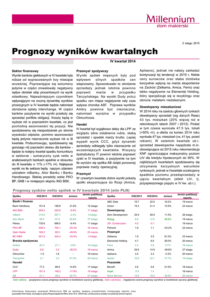 2 lutego 2015 Prognozy wynik€w kwartalnych IV kwartał 2014 Sektor finansowy Wyniki bank‚w giełdowych w IV kwartale były niższe od wypracowanych trzy miesiące wcześniej. Poprawiające się wolumeny jedynie w części zniwelowały negatywny wpływ obniżek st‚p procentowych na wynik odsetkowy. Najważniejszym czynnikiem wpływającym na roczną dynamikę wynik‚w prowizyjnych w IV kwartale będzie natomiast obniżenie opłaty interchange. W części bank‚w pozytywnie na wyniki przełoży się sprzedaż portfela obligacji. Koszty będą w wyższe niż w poprzednim kwartale, co jest pochodną sezonowości tej pozycji. Nie spodziewamy się niespodzianek po stronie wysokości odpis‚w, pomimo sezonowości będą jedynie nieznacznie wyższe niż w III kwartale. Podsumowując, spodziewamy się gorszego niż poprzedni okresu dla bank‚w będzie to kolejny kwartał spadku koniunktury w sektorze - sumaryczny zysk netto w analizowanych bankach spadnie w stosunku do III kwartału o 11% (-17% r/r). Najlepsze wyniki na tle sektora będą naszym zdaniem udziałem mBanku, Alior Banku i Banku Handlowego. Słabiej poradziły sobie PKO BP, GNB i w mniejszym stopniu ING BSK. Przemysł spożywczy W yniki sp‚łek mięsnych były pod wpływem silnych spadk‚w cen wieprzowiny. Spowodowało to obniżenie sprzedaży jednak istotnie powinno poprawić marże w przypadku Tarczyńskiego. Na wyniki Dudy pr‚cz spadku cen mięsa negatywnie cały czas wpływa choroba ASF. Poprawa wynik‚w Ambry powinna być nieznaczna, natomiast wyraźna w przypadku Otmuchowa. Handel IV kwartał był wyjątkowo słaby dla LPP ze względu silne osłabienie rubla, słabą sprzedaż i spadek marży brutto. Lepiej wypadł wynik CCC, gdyż dynamiki sprzedaży odbiegały tylko nieznacznie od wcześniejszych kwartał‚w. W szyscy dystrybutorzy IT powinni istotnie poprawić zyski w IV kwartale, a pozytywnie na tym tle wyr‚żni się sp‚łka AB dzięki ponownej poprawie marży operacyjnej. Przemysł W czwartym kwartale dobre wyniki pokażą sp‚łki eksportujące do Rosji (Amica, Aplisens), jednak nie należy zakładać kontynuacji tej tendencji w 2015 r. Niskie ceny surowc‚w oraz słaba złot‚wka korzystnie wpłyną na marże eksporter‚w na Zach‚d (Zetkama, Amica, Ferro) oraz lekko negatywnie na Elemental Holding, kt‚ry specjalizuje się w recyklingu oraz obrocie metalami nieżelaznymi. Deweloperzy mieszkaniowi W 2014 roku na sześciu gł‚wnych rynkach deweloperzy sprzedali (wg danych Reas) 43 tys. mieszkań (20% więcej niż w rekordowych latach 2007 i 2013). Podaż w tym czasie wyniosła 47.5 tys. lokali (+50% r/r), a oferta na koniec 2014 roku wyniosła 47 tys. mieszkań (vs. 41 tys. przed rokiem). W ostatnim kwartale ub.r. sprzedaż deweloper‚w napędzała m.in. obowiązująca od 2015 roku rekomendacja KNF ograniczająca maksymalny poziom LtV dla kredytu hipotecznych do 90%. W najbliższych kwartałach spodziewamy się utrzymania korzystnych warunk‚w rynkowych, jednak w I kwartale oczekujemy spadk‚w poziomu przedsprzedaży w ujęciu kwartalnym (efekt LtV, tj. przyspieszonego popytu w IV kw. ub.r.). Prognozy zysk€w netto sp€łek w IV kwartale 2014 (mln PLN) IVQ'2013 IVQ'2014 zmiana termin publikacji raportu Bank Handlowy 151.8 199.8 31.6% 12 lutego ING BSK 250.5 225.8 -9.9% 11 lutego Deweloperzy mBank 314.8 307.1 -2.4% 5 lutego Sp‚łka Banki i finanse IVQ'2013 IVQ'2014 zmiana termin publikacji raportu ABC Data 19.7 22.9 16.2% 19 marca Action 19.3 21.4 10.9% 23 marca Dom Development 25.9 28.9 11.5% 26 lutego Sp‚łka Alior Bank 58.0 87.5 50.8% 27 lutego Robyg 8.6 12.5 45.6% 19 marca Pekao 735.6 688.5 -6.4% 11 lutego JW. Construction 4.0 -0.1 - 19 marca PKO BP 938.3 700.1 -25.4% 16 marca Polnord 1.9 1.1 -43.2% 23 marca Getin Noble 160.2 80.5 -49.8% 23 marca Przemysł BZ WBK 651.8 424.4 -34.9% 3 lutego Zetkama 1.9 3.5 81.0% 23 marca Elemental Holding 4.7 6.0 28.0% 20 marca 19 marca Branża spożywcza Ambra 20.3 21.1 3.9% 16 lutego Ferro 4.4 4.6 5.7% Duda 6.8 4.2 -38.2% 19 marca Amica 29.6 14.9 -49.6% 27 lutego Otmuch‚w -1.0 1.6 - 18 marca Aplisens 3.5 3.3 -3.3% 20 marca Tarczyński 2.1 3.4 61.9% 20 marca Apator 16.8 23.1 37.7% 19 lutego 4.6 5.6 21.6% 18 marca Handel Pozostałe CCC 77.2 88.6 14.8% 17 lutego Benefit LPP 181.4 149.2 -17.8% 19 lutego Impel -3.9 1.4 - 18 marca AB 21.1 28.0 32.7% 27 lutego Work Service 13.8 19.3 39.9% 20 marca kolor zielony - pozytywna ocena prognozy wynik€w w kontekście wyceny giełdowej, kolor czerwony - negatywna ocena prognozy wynik€w w kontekście wyceny giełdowej Informacje dotyczące powiązań Millennium DM ze sp‚łką, będącą przedmiotem niniejszego raportu oraz pozostałe informacje, wymagane przez Rozporządzenie RM z dnia 19.X. 2005 roku umieszczone zostały na ostatniej stronie raportu. SPIS TREŚCI Banki i finanse........................................................................................3 Przemysł spożywczy......................................................................... 7 Handel ................................................................................................ 9 Deweloperzy...................................................................................... 12 Przemysł ........................................................................................... 14 Pozostałe ............................................................................................ 17 Rekomendacje .................................................................................... 18 Prognozy wynik‚w kwartalnych - IV kwartał 2014 2 Sektor bankowy Bank Handlowy akumuluj Cena docelowa: 114.9 Wynik odsetkowy Wynik z Zysk tytułu Przychody operacyjny prowizji Zysk netto EPS DPS BVPS P/E P/BV Koszty /WNB (%) ROA (%) ROE (%) 2014p 1 179 620 2 393 1 155 936 7.2 7.2 55.4 14.9 1.9 52.1 2.0% 12.9% 2015p 1 180 625 2 297 1 049 827 6.3 7.1 54.8 16.9 2.0 54.7 1.7% 11.5% 2016p 1 263 668 2 435 1 212 949 7.3 6.3 55.9 14.7 1.9 50.6 1