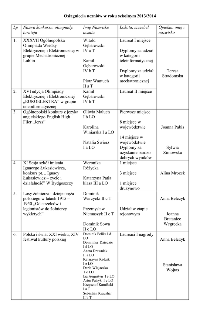 Osiągniecia uczniów w roku szkolnym 2013/2014 Lp Nazwa konkursu, olimpiady, turnieju Imię Nazwisko ucznia Lokata, szczebel 1. XXXVII Ogólnopolska Olimpiada Wiedzy Elektrycznej i Elektronicznej w grupie Mechatronicznej Lublin Witold Gębarowski IV a T Laureat I miejsce 2. 3. XVI edycja Olimpiady Elektrycznej i Elektronicznej „EUROELEKTRA” w grupie teleinformatycznej Ogólnopolski konkurs z języka angielskiego English High Flier „Jersz” Kamil Gębarowski IV b T Piotr Wantuch II a T Kamil Gębarowski IV b T Oliwia Małuch I b LO Karolina Winiarska I a LO Natalia Świerz I a LO 4. 5. XI Sesja szkół imienia Ignacego Łukasiewicza, konkurs pt. „ Ignacy Łukasiewicz – życie i działalność” W Bydgoszczy Weronika Różycka Losy żołnierza i dzieje oręża polskiego w latach 1915 – 1950 „Od strzelców i legionistów do żołnierzy wyklętych” Dominik Warzycki II c T Dyplomy za udział w kategorii teleinformatycznej Dyplomy za udział w kategorii mechatronicznej Przemysław Niemaszyk II c T Pierwsze miejsce 8 miejsce w województwie 14 miejsce w województwie Dyplomy za uzyskanie bardzo dobrych wyników 1 miejsce Polska i świat XXI wieku, XIV Dominik Feliks I d LO festiwal kultury polskiej Dominika Dziedzic I d LO Aneta Drewniak II a LO Katarzyna Radzik I e LO Daria Wiejaczka I e LO Iza Augustyn I e LO Artur Patryk I e LO Krzysztof Kamiński IaT Sebastian Kraushar II b T Joanna Pabis Sylwia Zimowska Alina Mrozek 1 miejsce drużynowo Anna Belczyk Udział w etapie rejonowym Dominik Sowa II c LO 6. Teresa Stradomska Laureat II miejsce 3 miejsce Katarzyna Patla klasa III a LO Opiekun imię i nazwisko Joanna Brataniec Węgrecka Laureaci I nagrody Anna Belczyk Stanisława Wojtas 7. 8. II etap ogólnopolskiej olimpiady o państwie i prawie Katarzyna Stępnień III c LO XIV powiatowy konkurs recytatorski imienia Jana Pawła II Marcin Tokarz III e LO 9. XIV powiatowy konkurs recytatorsko – teatralny im. Jana Pawła II w Gorlicach. Sztuka „Być dobrym jak chleb” wg. Karola Wojtyły 10. IX ogólnopolskie spotkanie twórczości chrześcijańskiej „Szukałem Was …” w Zakopanem spektakl „Być dobrym jak chleb” 11. Powiatowy konkurs czytelniczy „Literacki szlak powiatu gorlickiego” 12. V Finał konkursu „Elektron” Wrocław Zespół teatralny „Ziemia gorlicka 1915” III miejsce Zespół teatralny Grand Prix – nagroda główna festiwalu Katarzyna Radzik, Daria Wiejaczka I e LO Przemysław Zarzycki II aT Wyróżnienie za prezentację multimedialną. Dyplom za udział w konkursie Dyplomy za bardzo dobre miejsca w Konkursie Śliwa Aleksandra III b LO Finalistki Patryk Kalisz I a LO Laureat II stopnia Laureat III stopnia Laureat IV stopnia Laureat IV stopnia Laureat IV stopnia Laureat V stopnia Przemysław Niemaszyk II c T Jakub Woźniak II b T, 15. IV edycja konkursu historycznego „Żołnierze wyklęci – bohaterowie komunistycznego podziemia” 16. Powiatowy konkurs historyczny Anna Belczyk Halina Osińska Witold Gębarowski IV aT Łukasz Nowak IV aT 13. Małopolski konkurs czytelniczy - Bohaterowie „Granicy” Z. Nałkowskiej Kraków 14. XII edycja olimpiady Archimedes Plus – Historia Zakwalifikowała się do drugiego etapu Wyróżnienie Kamila Sarnecka II b LO, Kamil Bania II b T Krzysztof Habaj II c LO Natalia Kafel II c LO Oliwia Małuch I d LO Teresa Stradomska Małgorzata Zimirska Stanisława Wojtas Anna Belczyk Maria Liana Pasińska Joanna Brataniec Węgrecka Laureatka Stanisława Wojtas II miejsce Joanna Brataniec Węgrecka 17. Wojewódzki konkurs wiedzy chemicznej - Kraków 18. Powiatowy konkurs z Języka Niemieckiego „Meine Schprachfertigkeiten” dla uczniów szkół ponadgimnazjalnych 19. IV Edycja ogólnopolskiego konkursu T.I.K? TAK 20. IV Edycja konkursu edukacji z panem T.I.K. – iem „Pomyśl zanim wrzucisz – Dbaj o swoją tożsamość” 21. Konkurs „Zachować dla przyszłych pokoleń – poszukujemy miejsc związanych o niepodległość Polski” 22. Konkurs „Polacy na Syberii” Sylwia wyróżnienie Myszkowska II d LO Tomasz Martauz I I miejsce b LO Marek Pawlak IV bT Kamil Gębarowski IV bT Seweryn Bogusz kl III bT Igor Gierat II e LO Piotr Wojtas II a LO 2 miejsce i zakwalifikowanie się do finału w Warszawie 12 miejsce Wyróżnienie za historyjkę obrazkową – Warszawa I miejsce, tytuł laureata II miejsce, tytuł Katarzyna Radzik laureata I e LO Daria Wiejaczka I Finaliści e LO Dominik Ludwin II a LO Paweł Serwoński II e LO Witek Soczek II a LO Karolina Ćwiklik Finalistka II a LO Marta Pikor Maria Szymańska Mariusz Gogola Marcin Alibożek Stanisława Wojtas