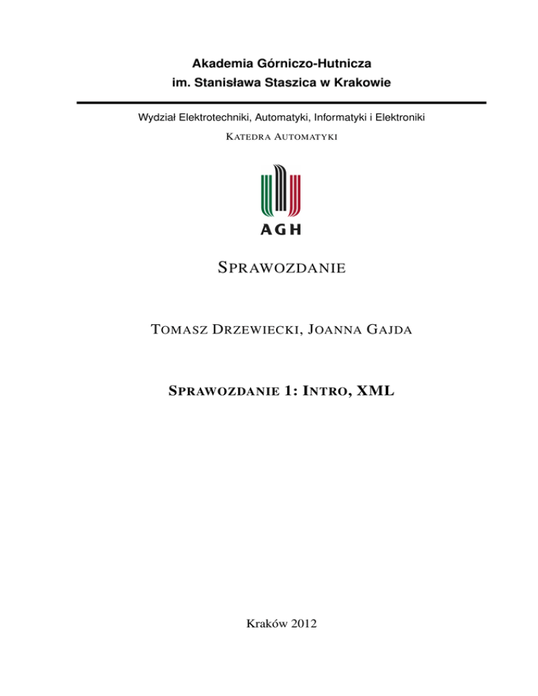 Akademia Górniczo-Hutnicza im. Stanisława Staszica w Krakowie Wydział Elektrotechniki, Automatyki, Informatyki i Elektroniki K ATEDRA AUTOMATYKI S PRAWOZDANIE T OMASZ D RZEWIECKI , J OANNA G AJDA S PRAWOZDANIE 1: I NTRO , XML Kraków 2012 Spis treści 1. Intro................................................................................................................................................. 3 1.1. Extracting RDF metadata ...................................................................................................... 3 1.2. Common Vocabularies........................................................................................................... 5 1.2.1. SKOS.......................................................................................................................... 5 1.2.2. Dublin Core................................................................................................................ 5 1.2.3. FOAF.......................................................................................................................... 6 1.2.4. DOAP ......................................................................................................................... 6 1.3. FOAF ..................................................................................................................................... 6 1.4. Schemas ................................................................................................................................. 8 1.5. Ontology visualisation........................................................................................................... 8 1.6. Ontology reasoning ............................................................................................................... 8 1.7. Linked Open Data.................................................................................................................. 10 1.8. Semantic Web tools ............................................................................................................... 10 1.8.1. RDFizers .................................................................................................................... 10 1.8.2. Semantic Web browsers ............................................................................................. 10 1.8.3. Semantic Web Search Engines................................................................................... 10 1.8.4. Applications of the Linked Data ................................................................................ 10 1.9. Control Questions .................................................................................................................. 11 1.9.1. How one can add semantic annotation to a web page?.............................................. 11 1.9.2. Explain the Semantic Web Stack of technologies...................................................... 11 1.9.3. What is the main syntax for RDF? What are its advantages over other syntaxes? .... 11 1.9.4. What is the role of the ontologies in the Semantic Web? .......................................... 11 1.9.5. What are the 4 principles of Linked Data? ................................................................ 11 2. XML ................................................................................................................................................ 12 2.1. Warm-up ................................................................................................................................ 12 2.2. Creating XML Document...................................................................................................... 16 2.3. DTD ....................................................................................................................................... 16 2.4. XSD ....................................................................................................................................... 16 2 1. Intro 1.1. Extracting RDF metadata Wynik walidatora: „Your RDF document validated successfully.” Trójki: Number Subject Predicate Object 1 http://www.w3.org/RDF/- http://www.w3.org/2000/10/- http://www.kanzaki.com/- Validator/run/1336492199211 annotation-ns#annotates works/2004/imgdsc/miniduck_by_ccc.jpg 2 3 4 http://www.w3.org/RDF/- http://www.w3.org/2000/10/- “Asia i Tomek” Validator/run/1336492199211 annotation-ns#author http://www.w3.org/RDF/- http://www.w3.org/2000/10/- Validator/run/1336492199211 annotation-ns#created http://www.kanzaki.com/- http://www.w3.org/1999/02/22- http://xmlns.com/foaf/0.1/- works/2004/imgdsc/- rdf-syntax-ns#type Image http://www.kanzaki.com/- http://purl.org/dc/elements/1.1/- “Sztuczne kaczki” works/2004/imgdsc/- title “2012-05-08T15:45:04Z” miniduck_by_ccc.jpg 5 miniduck_by_ccc.jpg 6 http://www.kanzaki.com/- http://purl.org/dc/elements/1.1/- “Zdj˛ecie przedstawia trzy works/2004/imgdsc/- description sztuczne kaczki.” http://www.kanzaki.com/- http://purl.org/dc/elements/1.1/- “nieznany” works/2004/imgdsc/- creator miniduck_by_ccc.jpg 7 miniduck_by_ccc.jpg 8 http://www.kanzaki.com/- http://purl.org/dc/elements/1.1/- works/2004/imgdsc/- date “08.05.2012” miniduck_by_ccc.jpg 9 http://www.kanzaki.com/- http://jibbering.com/vocabs/- works/2004/imgdsc/- image/#width miniduck_by_ccc.jpg 3 “300” 4 1.1. Extracting RDF metadata 10 http://www.kanzaki.com/- http://jibbering.com/vocabs/- works/2004/imgdsc/- image/#height “225” miniduck_by_ccc.jpg 11 http://www.w3.org/- http://www.w3.org/1999/02/22- http://jibbering.com/vocabs/- RDF/Validator/run/- rdf-syntax-ns#type image/#Rectangle http://www.kanzaki.com/- http://jibbering.com/vocabs/- http://www.w3.org/- works/2004/imgdsc/- image/#hasPart RDF/Validator/run/- 1336492199211#p1 12 miniduck_by_ccc.jpg 13 1336492199211#p1 http://www.w3.org/- http://jibbering.com/vocabs/- RDF/Validator/run/- image/#points “44,30 150,110” 1336492199211#p1 14 http://www.w3.org/- http://purl.org/dc