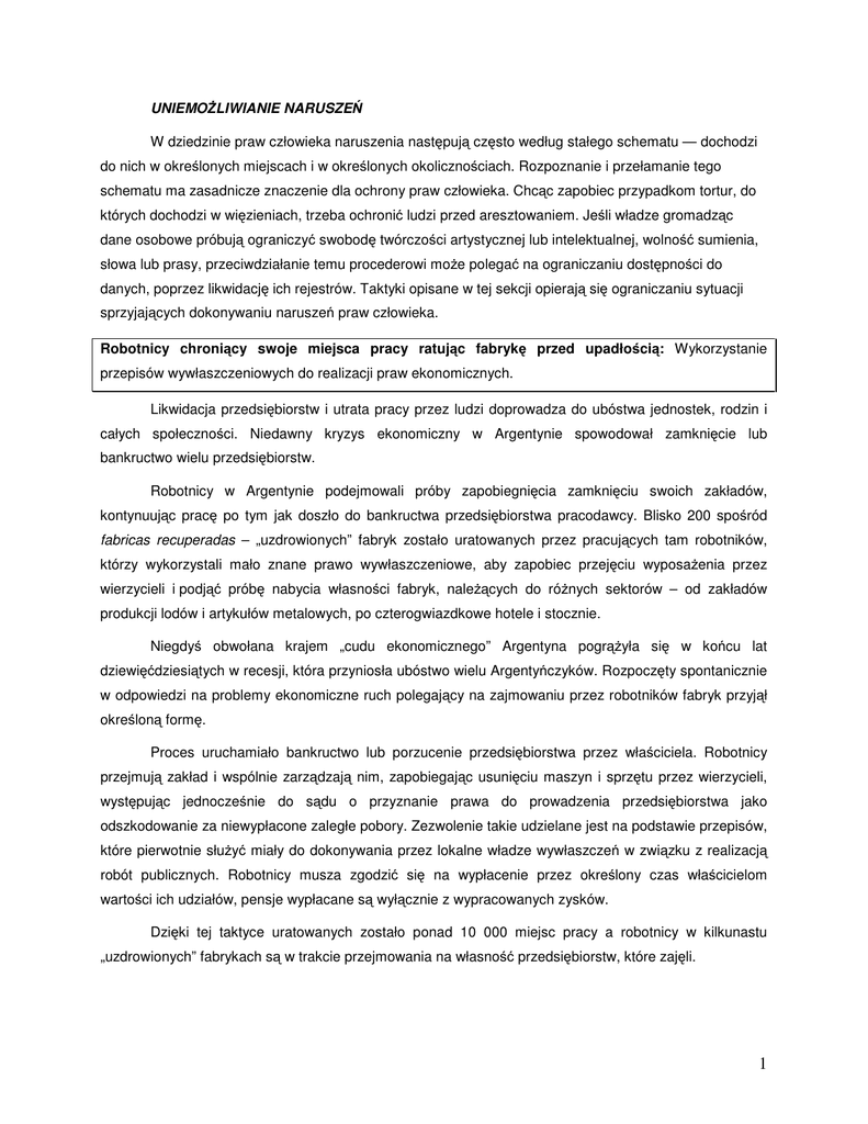 UNIEMOŻLIWIANIE NARUSZEŃ W dziedzinie praw człowieka naruszenia następują często według stałego schematu — dochodzi do nich w określonych miejscach i w określonych okolicznościach. Rozpoznanie i przełamanie tego schematu ma zasadnicze znaczenie dla ochrony praw człowieka. Chcąc zapobiec przypadkom tortur, do których dochodzi w więzieniach, trzeba ochronić ludzi przed aresztowaniem. Jeśli władze gromadząc dane osobowe próbują ograniczyć swobodę twórczości artystycznej lub intelektualnej, wolność sumienia, słowa lub prasy, przeciwdziałanie temu procederowi może polegać na ograniczaniu dostępności do danych, poprzez likwidację ich rejestrów. Taktyki opisane w tej sekcji opierają się ograniczaniu sytuacji sprzyjających dokonywaniu naruszeń praw człowieka. Robotnicy chroniący swoje miejsca pracy ratując fabrykę przed upadłością: Wykorzystanie przepisów wywłaszczeniowych do realizacji praw ekonomicznych. Likwidacja przedsiębiorstw i utrata pracy przez ludzi doprowadza do ubóstwa jednostek, rodzin i całych społeczności. Niedawny kryzys ekonomiczny w Argentynie spowodował zamknięcie lub bankructwo wielu przedsiębiorstw. Robotnicy w Argentynie podejmowali próby zapobiegnięcia zamknięciu swoich zakładów, kontynuując pracę po tym jak doszło do bankructwa przedsiębiorstwa pracodawcy. Blisko 200 spośród fabricas recuperadas – „uzdrowionych” fabryk zostało uratowanych przez pracujących tam robotników, którzy wykorzystali mało znane prawo wywłaszczeniowe, aby zapobiec przejęciu wyposażenia przez wierzycieli i podjąć próbę nabycia własności fabryk, należących do różnych sektorów – od zakładów produkcji lodów i artykułów metalowych, po czterogwiazdkowe hotele i stocznie. Niegdyś obwołana krajem „cudu ekonomicznego” Argentyna pogrążyła się w końcu lat dziewięćdziesiątych w recesji, która przyniosła ubóstwo wielu Argentyńczyków. Rozpoczęty spontanicznie w odpowiedzi na problemy ekonomiczne ruch polegający na zajmowaniu przez robotników fabryk przyjął określoną formę. Proces uruchamiało bankructwo lub porzucenie przedsiębiorstwa przez właściciela. Robotnicy przejmują zakład i wspólnie zarządzają nim, zapobiegając usunięciu maszyn i sprzętu przez wierzycieli, występując jednocześnie do sądu o przyznanie prawa do prowadzenia przedsiębiorstwa jako odszkodowanie za niewypłacone zaległe pobory. Zezwolenie takie udzielane jest na podstawie przepisów, które pierwotnie służyć miały do dokonywania przez lokalne władze wywłaszczeń w związku z realizacją robót publicznych. Robotnicy musza zgodzić się na wypłacenie przez określony czas właścicielom wartości ich udziałów, pensje wypłacane są wyłącznie z wypracowanych zysków. Dzięki tej taktyce uratowanych zostało ponad 10 000 miejsc pracy a robotnicy w kilkunastu „uzdrowionych” fabrykach są w trakcie przejmowania na własność przedsiębiorstw, które zajęli. 1 Pomysł wykorzystania przepisów prawa wywłaszczeniowego do uzasadnienia przejmowania zakładów narodził się z desperacji, potencjał tego rozwiązania wykracza jednak ponad utrzymanie działania przedsiębiorstwa. Stanowi ono krok na drodze do ograniczenia ubóstwa, które może rozprzestrzenić się wśród poszczególnych społeczności; przyczynia się także do wzrostu poziomu życia. Jest wyrazem prawa do pracy i należytego poziomu życia, zawartych w Powszechnej Deklaracji Praw Człowieka. Mediacja wewnątrz społeczności: Tworzenie alternatywnych mechanizmów rozwiązywania sporów bez udziału policji, będącej potencjalnym sprawcą naruszeń praw człowieka. Ta taktyka wywodzi się z przekonania, że można zapobiec przypadkom torturowania zatrzymanych na posterunkach policji, nie dopuszczając do tego, aby się tam znaleźli poprzez rozwiązywanie konfliktów drogą mediacji poza systemem sądowym. Działające w Nepalu Centrum Pomocy Ofiarom Tortur (Centre for Victims of Torture – CVICT) stworzyło procedurę mediacji społecznych, będącą alternatywą dla systemu sądownictwa karnego. Umożliwia to uchronienie ludzi przed pobytem w areszcie, gdzie 60 procent zatrzymanych jest zmuszanych poprzez tortury do zeznań. CVICT przeprowadziło badania nad rodzajami najczęstszych sporów i opracowało kurs treningowy dla przywódców lokalnych społeczności, w tym kobiet i Dalitów (należących do kasty niedotykalnych), dotyczący sposobu rozwiązywana sporów drogą mediacji społecznej opartej o przepisy prawa. Mediacja taka możliwa jest dla wszystkich niezależnie od wieku, płci, klasy czy kasty społecznej oraz we wszystkich sprawach poza przestępstwami dokonanymi przy użyciu przemocy. Żeby przeprowadzić rekrutację trenerów, CVICT zorganizował masowe spotkania w każdej społeczności, która miała wskazać kandydatów. Trenerzy przeszli potem przeszkolenie z zakresu praw człowieka, lokalnego prawa i metod rozwiązywania sporów. Wiele spośród trenerów, którzy mieli już doświadczenie w mediacji, mogło rozwinąć swoje umiejętności. Ci trenerzy szkolili później kolejne osoby. Spośród przeszkolonych tworzone były komitety prowadzące mediacje w poszczególnych okręgach. W składzie każdego z komitetów było przynajmniej 30 procent kobiet oraz przynajmniej jeden przedstawiciel mniejszości etnicznej, żyjącej w danej społeczności. Etapy i zasady postępowania mediacyjnego są jasno określone, począwszy od wniosku o mediację; strony występują we własnym imieniu. Podczas sesji mediacyjnych, pięciu do dziewięciu przeszkolonych mediatorów działa pomiędzy stronami sporu, które mogą także przyprowadzić wspierające je osoby. Komitet mediacyjny wyjaśnia zasady i przebieg mediacji, a strony i wspierające ich osoby przedstawiają swoją sprawę. Mediatorzy włączają strony w dyskusję nad dostępnymi drogami rozwiązania sporu. Najczęściej udaje się wypracować tą drogą