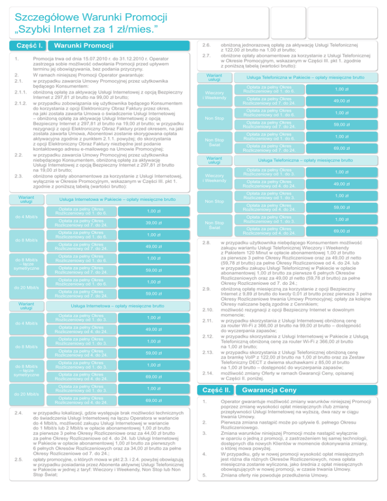 Szczegółowe Warunki Promocji „Szybki Internet za 1 zł/mies.” Część I. 1. 2. 2.1. 2.1.1. 2.1.2. 2.2. 2.3. do 4 Mbit/s do 8 Mbit/s do 8 Mbit/s – łącze symetryczne do 20 Mbit/s Wariant usługi do 4 Mbit/s do 8 Mbit/s do 8 Mbit/s – łącze symetryczne do 20 Mbit/s 2.5. 2.6. Promocja trwa od dnia 15.07.2010 r. do 31.12.2010 r. Operator zastrzega sobie możliwość odwołania Promocji przed upływem terminu jej obowiązywania, bez podania przyczyny. W ramach niniejszej Promocji Operator gwarantuje: w przypadku zawarcia Umowy Promocyjnej przez użytkownika będącego Konsumentem: obniżoną opłatę za aktywację Usługi Internetowej z opcją Bezpieczny Internet z 297,81 zł brutto na 99,00 zł brutto; w przypadku zobowiązania się użytkownika będącego Konsumentem do korzystania z opcji Elektroniczny Obraz Faktury przez okres, na jaki została zawarta Umowa o świadczenie Usługi Internetowej – obniżoną opłatę za aktywację Usługi Internetowej z opcją Bezpieczny Internet z 297,81 zł brutto na 19,00 zł brutto; w przypadku rezygnacji z opcji Elektroniczny Obraz Faktury przed okresem, na jaki została zawarta Umowa, Abonentowi zostanie skorygowana opłata aktywacyjna zgodnie z punktem 2.1.1. powyżej; do skorzystania z opcji Elektroniczny Obraz Faktury niezbędne jest podanie kontaktowego adresu e-mailowego na Umowie Promocyjnej; w przypadku zawarcia Umowy Promocyjnej przez użytkownika niebędącego Konsumentem, obniżoną opłatę za aktywację Usługi Internetowej z opcją Bezpieczny Internet z 297,81 zł brutto na 19,00 zł brutto; obniżone opłaty abonamentowe za korzystanie z Usługi Internetowej, wyłącznie w Okresie Promocyjnym, wskazanym w Części III. pkt 1. zgodnie z poniższą tabelą (wartości brutto): Wariant usługi 2.4. Warunki Promocji Usługa Internetowa w Pakiecie – opłaty miesięczne brutto Opłata za pełny Okres Rozliczeniowy od 1. do 6. 1,00 zł Opłata za pełny Okres Rozliczeniowy od 7. do 24. 39,00 zł Opłata za pełny Okres Rozliczeniowy od 1. do 6. 1,00 zł Opłata za pełny Okres Rozliczeniowy od 7. do 24. 49,00 zł Opłata za pełny Okres Rozliczeniowy od 1. do 6. 1,00 zł Opłata za pełny Okres Rozliczeniowy od 7. do 24. 59,00 zł Opłata za pełny Okres Rozliczeniowy od 1. do 6. 1,00 zł Opłata za pełny Okres Rozliczeniowy od 7. do 24. 59,00 zł 2.7. Wariant usługi Wieczory i Weekendy Non Stop Non Stop Świat Wariant usługi Wieczory i Weekendy Non Stop Non Stop Świat 2.8. 2.9. Usługa Internetowa – opłaty miesięczne brutto obniżoną jednorazową opłatę za aktywację Usługi Telefonicznej z 122,00 zł brutto na 1,00 zł brutto; obniżone opłaty abonamentowe za korzystanie z Usługi Telefonicznej w Okresie Promocyjnym, wskazanym w Części III. pkt 1. zgodnie z poniższą tabelą (wartości brutto): 2.10. 1,00 zł Opłata za pełny Okres Rozliczeniowy od 4. do 24. 49,00 zł Opłata za pełny Okres Rozliczeniowy od 1. do 3. 1,00 zł Opłata za pełny Okres Rozliczeniowy od 4. do 24. 59,00 zł Opłata za pełny Okres Rozliczeniowy od 1. do 3. 1,00 zł Opłata za pełny Okres Rozliczeniowy od 4. do 24. 69,00 zł Opłata za pełny Okres Rozliczeniowy od 1. do 3. 1,00 zł Część II. Opłata za pełny Okres Rozliczeniowy od 4. do 24. 69,00 zł 1. 2.12. w przypadku lokalizacji, gdzie występuje brak możliwości technicznych do świadczenia Usługi Internetowej na łączu Operatora w wariancie do 4 Mbit/s, możliwość zakupu Usługi Internetowej w wariancie do 1 Mbit/s lub 2 Mbit/s w opłacie abonamentowej 1,00 zł brutto za pierwsze 3 pełne Okresy Rozliczeniowe oraz za 44,00 zł brutto za pełne Okresy Rozliczeniowe od 4. do 24. lub Usługi Internetowej w Pakiecie w opłacie abonamentowej 1,00 zł brutto za pierwszych 6 pełnych Okresów Rozliczeniowych oraz za 34,00 zł brutto za pełne Okresy Rozliczeniowe od 7. do 24.; opłaty promocyjne, o których mowa w pkt 2.3. i 2.4. powyżej obowiązują w przypadku posiadania przez Abonenta aktywnej Usługi Telefonicznej w Pakiecie w jednej z taryf: Wieczory i Weekendy, Non Stop lub Non Stop Świat; 2.13. 2.14. 2. 3. 4. 5. Opłata za pełny Okres Rozliczeniowy od 1. do 6. 1,00 zł Opłata za pełny Okres Rozliczeniowy od 7. do 24. 49,00 zł Opłata za pełny Okres Rozliczeniowy od 1. do 6. 1,00 zł Opłata za pełny Okres Rozliczeniowy od 7. do 24. 59,00 zł Opłata za pełny Okres Rozliczeniowy od 1. do 6. 1,00 zł Opłata za pełny Okres Rozliczeniowy od 7. do 24. 69,00 zł Usługa Telefoniczna – opłaty miesięczne brutto Opłata za pełny Okres Rozliczeniowy od 1. do 3. 1,00 zł Opłata za pełny Okres Rozliczeniowy od 4. do 24. 49,00 zł Opłata za pełny Okres Rozliczeniowy od 1. do 3. 1,00 zł Opłata za pełny Okres Rozliczeniowy od 4. do 24. 59,00 zł Opłata za pełny Okres Rozliczeniowy od 1. do 3. 1,00 zł Opłata za pełny Okres Rozliczeniowy od 4. do 24. 69,00 zł w przypadku użytkownika niebędącego Konsumentem możliwość zakupu wariantu Usługi Telefonicznej Wieczory i Weekendy z Pakietem 120 Minut w opłacie abonamentowej 1,00 zł brutto za pierwsze 3 pełne Okresy Rozliczeniowe oraz za 49,00 zł netto (59,78 zł brutto) za pełne Okresy Rozliczeniowe od 4. do 24. lub w przypadku zakupu Usługi Telefonicznej w Pakiecie w opłacie abonamentowej 1,00 zł brutto za pierwsze 6 pełnych Okresów Rozliczeniowych oraz za 49,00 zł netto (59,78 zł brutto) za pełne Okresy Rozliczeniowe od 7. do 24.; obniżoną opłatę miesięczną za korzystanie z opcji Bezpieczny Internet z 9,89 zł brutto do kwoty 0,01 zł brutto przez pierwsze 3 pełne Okresy Rozliczeniowe trwania Umowy Promocyjnej; opłaty za kolejne Okresy naliczane będą zgodnie z Cennikiem; możliwość rezygnacji z opcji Bezpieczny Internet w dowolnym momencie; w przypadku skorzystania z Usługi Internetowej obniżoną cenę za router Wi-Fi z 366,00 zł brutto na 99,00 zł brutto – dostępność do wyczerpania zapasów; w przypadku skorzystania z Usługi Internetowej w Pakiecie z Usługą Telefonic