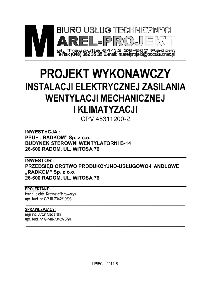 PROJEKT WYKONAWCZY INSTALACJI ELEKTRYCZNEJ ZASILANIA WENTYLACJI MECHANICZNEJ I KLIMATYZACJI CPV 45311200-2 INWESTYCJA : PPUH „RADKOM” Sp. z o.o. BUDYNEK STEROWNI WENTYLATORNI B-14 26-600 RADOM, UL. WITOSA 76 INWESTOR : PRZEDSIĘBIORSTWO PRODUKCYJNO-USŁUGOWO-HANDLOWE „RADKOM” Sp. z o.o. 26-600 RADOM, UL. WITOSA 76 PROJEKTANT: techn. elektr. Krzysztof Krawczyk upr. bud. nr GP-III-7342/10/93 SPRAWDZAJĄCY: mgr inż. Artur Metlerski upr. bud. nr GP-III-7342/73/91 LIPIEC – 2011 R. Zawartość projektu: I. Opis techniczny II. Załączniki III. Rysunki 1E. Instalacje elektryczne wewnętrzne - rzut przyziemia 2E. Schemat zasilania wentylacji i klimatyzacji 2 1:50 I. OPIS TECHNICZNY. 1.1. Przedmiot opracowania: Przedmiotem opracowania jest projekt wykonawczy instalacji elektrycznych zasilania wentylacji mechanicznej i klimatyzacji w pomieszczeniu sterowni wentylatorni w budynku B-14 na terenie PPUH „RADKOM” przy ul. Witosa 76 w Radomiu. 1.2. Podstawa opracowania: - uzgodnienia z Inwestorem, - rzut architektoniczny w skali 1:50, - projekt wentylacji i klimatyzacji, - wizja lokalna w obiekcie, - warunki techniczne jakim powinny odpowiadać budynki i ich usytuowanie, - przepisy dotyczące zakresu opracowania oraz normy elektryczne. 1.3. Zakres opracowania: Projekt swym zakresem obejmuje wykonanie: - obwodu zasilania centrali wentylacyjnej 400/230 V, - obwodu zasilania klimatyzatora 230 V, - zainstalowanie zabezpieczeń w istn. szafie zasilania wentylacji, - demontaż i ponowny montaż istniejących opraw oświetleniowych, 1.4. Zasilanie centrali wentylacyjnej 400/230 V. W pomieszczeniu wentylatorni będzie zainstalowana centrala wentylacyjna nawiewno-wywiewna z nagrzewnicą elektryczną: - VS-15-R-ME/HC-T – nawiew, 0,75 kW; 3 A; 3x230 V, - VS-15-R-FN/EM-T – wyciąg, 0,75 kW; 3 A; 3x230 V, - VS-15-HE-36-AT - nagrzewnica elektryczna, 5,1 kW; 3x400 V. W komplecie z centralą jest dostarczana szafka automatyki VS 21-150 CG ACX 36 EVO SUP, którą należy zainstalować na ścianie na wys. 1,4 m. Obwód zasilający z istn. szafy „zasilania wentylatorów” wykonać przewodem kabelkowym YDYżo 5 x 4 mm2, który należy wprowadzić pod podłogę techniczną, a przy podejściu do szafki automatyki w rurze ochronnej SV50 mocowanej uchwytami VF30 na ścianie. Do sterowania pracą centrali jest dostarczany w komplecie z nią panel sterowniczy VS 00 HMI Adwanced EVO z przewodem o długości 3 m. Panel zainstalować na ścianie na wys. 1,5 m od podłogi. 1.5. Zasilanie klimatyzatora 230 V. Jednostka zewnętrzna klimatyzatora MHA/K 25 będzie zainstalowana na ścianie zewnętrznej budynku. Obwód zasilający jednostkę zewnętrzną z istn. szafy „zasilania wentylatorów” 3 wykonać przewodem kabelkowym YDYżo 3 x 2,5 mm2, który należy wprowadzić pod podłogę techniczną, oraz w listwie instalacyjnej LN 25x16 mocowanej na ścianie. Połączenie pomiędzy jednostkami zewnętrzną klimatyzatora i centralą wentylacyjną VS wykonuje instalator klimatyzacji i wentylacji. 1.6. Montaż aparatów w szafie zasilania wentylacji. W istniejącej szafie „zasilania wentylatorów” należy zainstalować zabezpieczenia projektowanych obwodów zasilających: - wyłącznik nadmiarowo-prądowy S301, C20A (1 szt.), - wyłącznik nadmiarowo-prądowy S303, C50A (1 szt.), - wyłącznik różnicowo-prądowy NFI 63. 030.4 (1 szt.), 1.7. Instalacja oświetleniowa. Istniejące oprawy oświetleniowe w pomieszczeniu należy zdemontować w związku z montażem sufitu podwieszonego. Po wykonaniu instalacji wentylacji i klimatyzacji oraz montażu nowego sufitu z płyt warstwowych należy zainstalować na zwieszakach w tych samych miejscach uprzednio zdemontowane oprawy oświetleniowe poniżej proj. kanałów wentylacyjnych. Oprawy przyłączyć do istniejących obwodów przy pomocy puszek odgałęźnych 4x2,5 mm2, IP44. Proj. odcinki przewodów YDYżo 3/4x1,5 mm2 od puszek do opraw prowadzić w listwach instalacyjnych LN 25x16 na proj. suficie w pom. wentylatorni. 1.8. Uwagi końcowe. - Po zakończeniu robót instalacyjnych należy dokonać pomiarów instalacji wymaganych przepisami. - Przy przejściach instalacji przez ściany należy zastosować przepusty ochronne. - Całość prac wykonać zgodnie z PN-E i Prawem Budowlanym. 4 OŚWIADCZENIE: Zgodnie z art. 20 ust. 4 Prawa budowlanego (Dz. U. Nr 207 z 2003 r. poz. 2016 z późniejszymi zmianami) oświadczam jako projektant / sprawdzający, że „Projekt wykonawczy instalacji elektrycznej zasilania wentylacji mechanicznej i klimatyzacji” obiektu. INWESTYCJA : Budynek sterowni wentylatorni B-14 w Radomiu, ul. Witosa 76, INWESTOR : PPUH „RADKOM” Sp. z o.o. w Radomiu, ul. Witosa 76, sporządzono zgodnie z obowiązującymi przepisami oraz zasadami wiedzy technicznej. 5