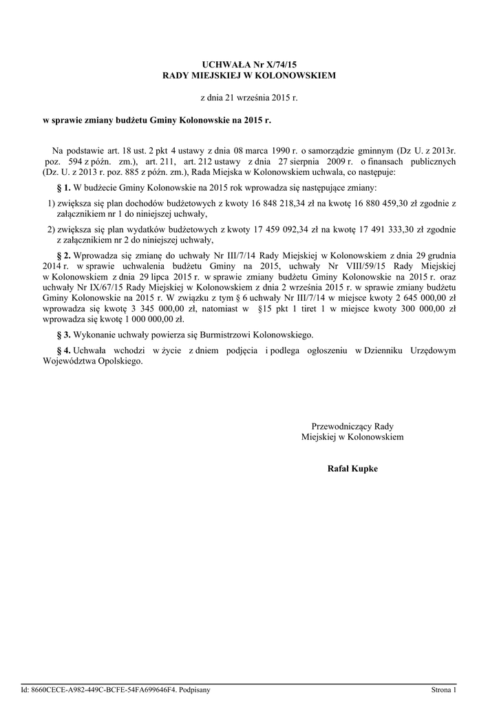 Uchwała Nr X.74.15 w sprawie zmiany budżetu Gminy Kolonowskie