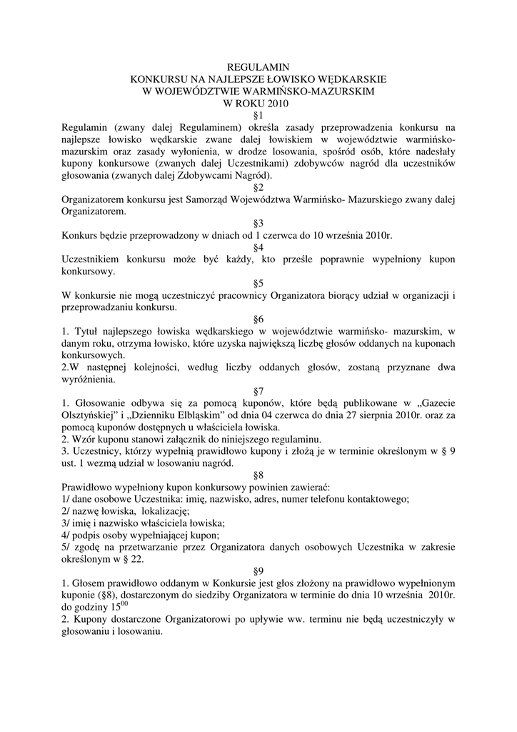REGULAMIN KONKURSU NA NAJLEPSZE ŁOWISKO WĘDKARSKIE W WOJEWÓDZTWIE WARMIŃSKO-MAZURSKIM W ROKU 2010 §1 Regulamin (zwany dalej Regulaminem) określa zasady przeprowadzenia konkursu na najlepsze łowisko wędkarskie zwane dalej łowiskiem w województwie warmińskomazurskim oraz zasady wyłonienia, w drodze losowania, spośród osób, które nadesłały kupony konkursowe (zwanych dalej Uczestnikami) zdobywców nagród dla uczestników głosowania (zwanych dalej Zdobywcami Nagród). §2 Organizatorem konkursu jest Samorząd Województwa Warmińsko- Mazurskiego zwany dalej Organizatorem. §3 Konkurs będzie przeprowadzony w dniach od 1 czerwca do 10 września 2010r. §4 Uczestnikiem konkursu może być każdy, kto prześle poprawnie wypełniony kupon konkursowy. §5 W konkursie nie mogą uczestniczyć pracownicy Organizatora biorący udział w organizacji i przeprowadzaniu konkursu. §6 1. Tytuł najlepszego łowiska wędkarskiego w województwie warmińsko- mazurskim, w danym roku, otrzyma łowisko, które uzyska największą liczbę głosów oddanych na kuponach konkursowych. 2.W następnej kolejności, według liczby oddanych głosów, zostaną przyznane dwa wyróżnienia. §7 1. Głosowanie odbywa się za pomocą kuponów, które będą publikowane w „Gazecie Olsztyńskiej” i „Dzienniku Elbląskim” od dnia 04 czerwca do dnia 27 sierpnia 2010r. oraz za pomocą kuponów dostępnych u właściciela łowiska. 2. Wzór kuponu stanowi załącznik do niniejszego regulaminu. 3. Uczestnicy, którzy wypełnią prawidłowo kupony i złożą je w terminie określonym w § 9 ust. 1 wezmą udział w losowaniu nagród. §8 Prawidłowo wypełniony kupon konkursowy powinien zawierać: 1/ dane osobowe Uczestnika: imię, nazwisko, adres, numer telefonu kontaktowego; 2/ nazwę łowiska, lokalizację; 3/ imię i nazwisko właściciela łowiska; 4/ podpis osoby wypełniającej kupon; 5/ zgodę na przetwarzanie przez Organizatora danych osobowych Uczestnika w zakresie określonym w § 22. §9 1. Głosem prawidłowo oddanym w Konkursie jest głos złożony na prawidłowo wypełnionym kuponie (§8), dostarczonym do siedziby Organizatora w terminie do dnia 10 września 2010r. do godziny 1500 2. Kupony dostarczone Organizatorowi po upływie ww. terminu nie będą uczestniczyły w głosowaniu i losowaniu. §10 1. Uczestnik biorący udział w głosowaniu może oddać tylko jeden głos na wybrane łowisko. 2. Składając kupon Uczestnicy wyrażają zgodę na udział w głosowaniu na zasadach określonych w niniejszym Regulaminie. §11 Liczenie głosów zostanie udokumentowane protokołem. §12 Protokół powinien zawierać: 1/ datę rozpoczęcia i zakończenia czynności; 2/ ilość prawidłowo wypełnionych kuponów; 3/ ilość kuponów, które nie brały udziału w losowaniu z podaniem przyczyny; 4/ ilość głosów oddanych na poszczególne łowiska; 5/ podpisy osób wykonujących czynność. §13 Po zakończeniu liczenia głosów kupony prawidłowo wypełnione zostaną zabezpieczone w sposób, który zagwarantuje ich nienaruszalność. §14 Ogłoszenie wyników Konkursu oraz losowanie nagród dla jego uczestników odbędzie się najpóźniej do końca 2010r. §15 1. Nad prawidłowością przebiegu Konkursu, w szczególności nad liczeniem głosów oraz losowaniem czuwać będzie komisja w składzie: 1/ Dyrektor Departamentu Rozwoju Obszarów Wiejskich i Rolnictwa. 2/ Pracownicy departamentu z Biura d/s rybactwa, (dwie osoby). §16 1. Dziesięciu wylosowanych Uczestników Konkursu otrzyma równorzędne nagrody rzeczowe w postaci zestawów wędkarskich. 2.Właściciel najlepszego łowiska wędkarskiego zostanie nagrodzony przez Samorząd Województwa Warmińsko- Mazurskiego. 3. Właścicielom łowisk, które otrzymają kolejno największą ilość głosów, przyznane zostaną dwa wyróżnienia. §17 1. Zdobywców Nagród uznaje się za zawiadomionych o wygranej po nawiązanym kontakcie telefonicznym lub pisemnym. §18 Dane właściciela najlepszego łowiska oraz osób wyróżnionych w zakresie wskazanym w § 16 pkt 2 i 3 zostaną opublikowane w „Gazecie Olsztyńskiej” i „Dzienniku Elbląskim,” a także na stronie internetowej Organizatora. §19 1. Nagrody wydane będą za pokwitowaniem. 2. W celu dokonania identyfikacji Zdobywcy Nagród winni okazać dokument tożsamości. 3. Prawa do żądania wydania nagrody nie można przenosić na inne osoby. 4. Wyklucza się możliwość zamiany nagrody na ekwiwalent pieniężny lub na inną nagrodę rzeczową. §20 W przypadku nie odebrania nagród w terminie 30 dni od zawiadomienia o jej przyznaniu przez Organizatora prawo do nagrody wygasa. §21 1. Dane osobowe przekazywane Organizatorowi przez Uczestników w związku z Konkursem będą przetwarzane przez Administratora Danych Osobowych Organizatora w celu: - wyłonienia Laureata Konkursu, - przyznania dwóch wyróżnień, - wydania nagród dla dziesięciu wylosowanych Uczestników konkursu. 2. Administratorem Danych Osobowych przetwarzanych w związku z Konkursem jest Organizator. §22 Uczestnicy biorący udział w głosowaniu zgodnie z treścią ustawy z dnia 29 sierpnia 1997r. o ochronie danych osobowych (Dz. U. z 2002r., Nr 101, poz. 926) wyrażają dobrowolną, pisemną zgodę na przetwarzanie swoich danych osobowych poprzez złożenie własnoręcznego podpisu na kuponie konkursowym oraz wyrażają zgodę na ujawnienie swoich danych w zakresie wskazanym w § 8 ust. 1 oraz mają prawo do wglądu do swoich danych. §23 Organizator nie ponosi odpowiedzialności za: 1/ problemy w funkcjonowaniu Konkursu, jeżeli nastąpiły one wskutek zdarzeń, których Organizator przy zachowaniu należytej staranności nie był w stanie przewidzieć, lub którym nie mógł zapobiec, w szczególności w przypadku problemów związanych ze zdarzeniami losowymi o charakterze siły wyższej; 2/ przerwy w funkcjonowaniu Konkursu zaistniałej z przyczyn technicznych lub niezależnych od Organizatora; 3/ udział w Konkursie 