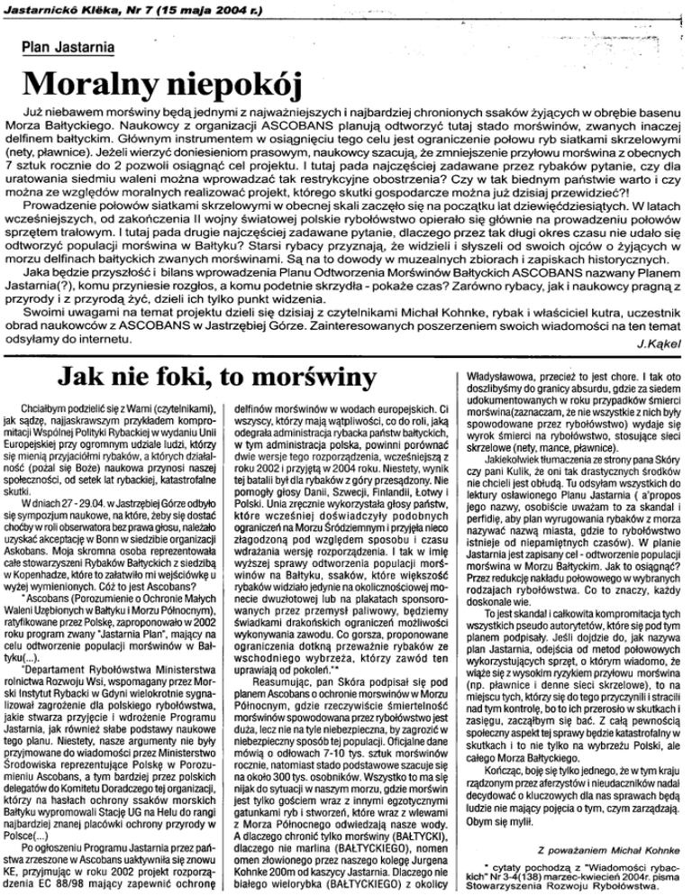 Jastarnickó Kleka, Nr 7 (15 maja 2004 r.) _. f .. j. .'." I '\,"",'"-'C~"""'" PlanJastarnia : Moralny niepokój Ju¿ niebawem morœwiny bêd¹jednymi z najwa¿niejszych i najbardziej chronionych ssaków ¿yj¹cych w obrêbie basenu Morza Ba³tyckiego. Naukowcy z organizacji ASCOBANS planuj¹ odtworzyæ tutaj stado morœwinów, zwanych inaczej delfinem ba³tyckim. G³ównym instrumentem w osi¹gniêciu tego celu jest ograniczenie po³owu ryb siatkami skrzelowymi (nety, p³awnice). Je¿eli wierzyæ doniesieniom prasowym, naukowcy szacuj¹, ¿e zmniejszenie przy³owu morœwina z obecnych 7 sztuk rocznie do 2 pozwoli osi¹gn¹æ cel projektu. I tutaj pada najczêœciej zadawane przez rybaków pytanie, czy dla uratowania siedmiu waleni mo¿na wprowadzaæ tak restrykcyjne obostrzenia? Czy w tak biednym pañstwie warto i czy mo¿na ze wzglêdów moralnych realizowaæ projekt, którego skutki gospodarcze mo¿na ju¿ dzisiaj przewidzieæ?! Prowadzenie po³owów siatkami skrzelowymi w obecnej skali zaczê³o siê na pocz¹tku lat dziewiêædziesi¹tych. W latach wczeœniejszych, od zakoñczenia II wojny œwiatowej polskie rybo³ówstwo opiera³o siê g³ównie na prowadzeniu po³owów sprzêtem tra³owym. I tutaj pada drugie najczêœciej zadawane pytanie, dlaczego przez tak d³ugi okres czasu nie uda³o siê odtworzyæ populacji morœwina w Ba³tyku? Starsi rybacy przyznaj¹, ¿e widzieli i s³yszeli od swoich ojców o ¿yj¹cych w morzu delfinach ba³tyckich zwanych morœwinami. S¹ na to dowody w muzealnych zbiorach i zapiskach historycznych. Jaka bêdzie przysz³oœæi bilans wprowadzenia Planu Odtworzenia Morœwinów Ba³tyckich ASCOBANS nazwany Planem Jastarnia(?), komu przyniesie rozg³os, a komu podetnie skrzyd³a - poka¿e czas? Zarówno rybacy, jak i naukowcy pragn¹z przyrody i z przyrod¹ ¿yæ,dzieli ich tylko punkt widzenia. Swoimi uwagami na temat projektu dzieli siê dzisiaj z czytelnikami Micha³ Kohnke, rybak i w³aœciciel kutra, uczestnik obrad naukowców z ASCOBANS w Jastrzêbiej Górze. Zainteresowanych poszerzeniem swoich wiadomoœci na ten temat odsy³amy do internetu. J.K¹kel Jak o³ e ~ oki to mOr s' Wl8o y 8 ³' , Chcia³bympodzieliæ siê zWami (czytelnikami), delfinów morœwinóww wodach europejskich. Ci W³adys³awowa, przecie¿ to jest chore. I tak oto doszlibyœmy dogranicy absurdu, gdzie za siedem udokumentowanych w roku przypadkówœmierci morœwina(zaznaczam, ¿enie wszystkiez nich by³y jak s¹dzê,najjaskrawszym przyk³adem kompro- wszyscy,którzymaj¹ w¹tpliwoœci, co do roli,jak¹ spowodowaneprzezrybo³ówstwo)wydajesiê mitacjiWspólnejPolitykiRybackiej w wydaniuUnii odegra³a administracja rybackapañstwba³tyckich, wyrok œmiercina rybo³ówstwo,stosuj¹cesieci Europejskiej przyogromnymudzialeludzi,którzy w tym administracjapolska,powinniporównaæ skrzelowe(nety,mance,p³awnice). siêmieni¹przyjació³mi rybaków,a którychdzia³al- dwiewersjetegorozporz¹dzenia, wczeœniejsz¹ z Jakiekolwiek t³umaczenia zestronypanaSkóry noœæ (po¯al siê Bo¿e)naukowaprzynosinaszej roku2002i przyjêt¹w 2004roku.Niestety, wynik czy paniKulik,¿eoni tak drastycznych œrodków spo³ecznoœci, od seteklat rybackiej,katastrofalne tej bataliiby³dlarybakówz góryprzes¹dzony. Nie niechcielijestob³ud¹.Tuodsy³amwszystkichdo skutki. pomog³yg³osyDanii,Szwecji,Finlandii,£otwy i lekturyos³awionegoPlanuJastarnia( a'propos Wdniach27-29.04.wJastrzêbiejGórzeodbyio Polski.Uniazrêczniewykorzysta³a g³osypañstw, jego nazwy,osobiœcie uwa¿amto za skandali siêsympozjum naukowe, naktóre,¿ebysiêdostaæ które wczeœniejdgœwiadczy³ypodobnych perfidiê,abyplanwyrugowania rybakówz morza choæby w roliobserwatora bezprawag³osu,nale¿a³o ograniczeñ naMorzuSródziemnym i przyjê³a nieco nazywaæ nazw¹ miasta, gdzieto rybo³ówstwo uzyskaæ akceptacjê w Bonnw siedzibie organizacji z³agodzon¹ pod wzglêdem sposobu i czasu istnieje od niepamiêtnychczasów).W planie Askobans.Mojaskromnaosobareprezentowa³a wdra¿aniawersjê rozporz¹dzenia.I tak w imiê Jastarniajestzapisanycel- odtworzenie populacji ca³estowarzyszeni RybakówBa³tyckich z siedzib¹ wy¿szejsprawy odtworzeniapopulacji morœ- morœwina w MorzuBa³tyckim.Jakto osi¹gn¹æ? w Kopenhadze, któreto za³atwi³o mi wejœciówkê u winów na Ba³tyku,ssaków, które wiêkszoœæ Przezredukcjênak³adu po³owowego w wybranych wy¿ejwymienionych. Có¿to jestAscobans? rybakówwidzia³o jedynienaokolicznoœciowej mo- rodzajachrybo³ówstwa.Co to znaczy,ka¿dy , Ascobans (Porozumienie o OchronieMa³ych neciedwuz³otowejlub na plakatachsponsoro- doskonale wie. WaleniUzêbionych w Ba³tyku i MorzuPó³nocnym), ratyfikowane przezPolskê, zaproponowa³o w 2002 rokuprogramzwany"JastarniaPlan",maj¹cyna celu odtworzeniepopulacjimorœwinów w Ba³tyku(...). "DepartamentRybo³ówstwaMinisterstwa rolnictwaRozwojuWsi,wspomagany przezMorski InstytutRybackiw Gdyniwielokrotniesygnalizowa³zagro¿enie dla polskiegorybo³ówstwa, jakie stwarzaprzyjêciei wdro¿enieProgramu Jastarnia, jak równie¿s³abepodstawynaukowe tego planu.Niestety,naszeargumentynie by³y ~rzyjmowane do wiadomoœci przezMinisterstwo Srodowiskareprezentuj¹ceP?I.skêw Poro~umieniuAscobans,a tym bardziejprzezpolskich delegatów doKomitetuDoradczego tej organi~cji, którzy na has³acho.chro~yssaków morsklc~ wanych przez przemys³paliwowy, bêdziemy Tojestskandali ca³kowita kompromitacja tych œwiadkami drakoñskichograniczeñmo¿liwoœci wszystkichpseudoautorytetów, któresiêpodtym wykonywania zawodu.Cogorsza,proponowane planempodpisa³y.Jeœlidojdziedo, jak nazywa ograniczeniadotkn¹ przewa¿nierybaków ze plan Jastarnia,odejœcia od metodpo³owowych wschodniego wybrze¿a, którzy zawód ten wykorzystuj¹cych sprzêt,o którymwiadomo,¿e uprawiaj¹od pokoleñ.'" wi¹¿esiêz wysokimryzykiemprzy³owumorœwina Reasumuj¹c,pan Skóra podpisa³siê pod (np. p³awnicei dennesieci skrzelowe),to na planemAscobans o ochroniemorswinów w Morzu miejscutych