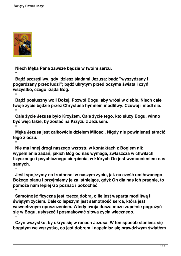 Święty Paweł uczy: Niech Męka Pana zawsze będzie w twoim sercu. * Bądź szczęśliwy, gdy idziesz śladami Jezusa; bądź "wyszydzany i pogardzany przez ludzi"; bądź ukrytym przed oczyma świata i czyń wszystko, czego rząda Bóg. * Bądź posłuszny woli Bożej. Pozwól Bogu, aby wrósł w ciebie. Niech całe twoje życie będzie przez Chrystusa hymnem modlitwy. Czuwaj i módl się. * Całe życie Jezusa było Krzyżem. Całe życie tego, kto służy Bogu, winno być więc takie, by zostać na Krzyżu z Jezusem. * Męka Jezusa jest całkowicie dziełem Miłości. Nigdy nie powinieneś stracić tego z oczu. * Nie ma innej drogi naszego wzrostu w kontaktach z Bogiem niż wypełnienie zadań, jakich Bóg od nas wymaga, zwłaszcza w chwilach fizycznego i psychicznego cierpienia, w których On jest wzmocnieniem nas samych. * Jeśli spojrzymy na trudności w naszym życiu, jak na część umiłowanego Bożego planu i przyjmiemy je za istniejące, gdyż On dla nas ich pragnie, to pomoże nam lepiej Go poznać i pokochać. * Samotność fizyczna jest rzeczą dobrą, o ile jest wsparta modlitwą i świętym życiem. Daleko lepszym jest samotność serca, która jest wewnętrznym opuszczeniem. Wtedy twoja dusza może zupełnie pogrążyć się w Bogu, usłyszeć i posmakować słowa życia wiecznego. * Czyń wszystko, by ukryć się w ranach Jezusa. W ten sposób staniesz się bogatym we wszystko, co jest dobrem i napełnisz się prawdziwym światłem 1/4 Święty Paweł uczy: Bożym. Wówczas będziesz mógł dążyć ku doskonałej świętości. * Kochaj swego brata w Bogu. Kochaj Boga w Twoim bracie. Dziel się z innymi: bądź z nimi w cierpieniach, w radościach, w ich nadziejach. Niech twoimi ulubionymi braćmi będą najubożsi. Niech wszystkie stworzenia prowadzą ciebie do Miłości Boga. * Największym darem od Pana jest zdolność pokochania całym sercem tych, których uważamy za nieprzyjaciół naszych, a będących wspaniałym narzędziem jakiego Bóg używa, aby pomóc nam we wzroście w świętości. * Przyjaciele biednych są najbardziej ukochanymi przyjaciółmi Boga. * Idź przed twym Bogiem w pokorze, prostocie i pokoju. * Czynić dobro i wiedzieć, że nic nie robimy z własnej woli jest znakiem niemałej pokory. * Bóg kocha tych, którzy stają się jak dzieci; jest to po to, aby na nich objawił swoje cuda. * Wszystko sprowadza się do jednego: wiedzieć jak dać Bogu to, co jest Boże i zachować dla siebie to, co jest nasze własne, tzn. naszą rzeczywistą nicość. Kto o tym wie, ten poznał mądrość świętych. * Ktokolwiek pragnie odnaleźć całą Prawdę, która jest Bogiem, ten musi zanurzyć się w swojej nicości. * Nie skuteczniejszego sposobu przygotowania się do walki i włożenia zbroi Bożej, niż przyznanie się przed Bogiem do naszej biedy i próżności, niezbicie wierząc, że nie możemy być pokonani póki Bóg jest po naszej stronie. * Ten, kto może prawdziwie i szczerze przyznać się do swej nicości, jest jak drzewo rosnące przy płynących wodach, które wyda owoce w odpowiednim czasie. * Ten, kto umniejsza się do pyłku i popiołu, będzie podniesiony przez Ducha Świętego. 2/4 Święty Paweł uczy: * Pokładaj nadzieję... nawet wtedy , gdy wokół są same nieszczęścia. Źródłem twej radości jest wieczne szczęście Boże. * Pamiętaj, że prawdziwej świętości niezmiennie towarzyszą: bóle i udręki zarówno wewnętrzne, jak i zewnętrzne; zagrożenia ze strony nieprzyjaciół zarówno jawne jak i ukryte; fizyczne i duchowe cierpienia; spustoszenia i niekończąca się jałowość; Ponieważ "wszystkich, którzy chcą pobożnie żyć w Chrystusie Jezusie, spotkają prześladowania". * Nie po to służymy Bogu, by otrzymać łaskę pociechy. Po prostu czynimy to, ponieważ On jest wart tego, aby mu służyć. Jeśli przychodzi choroba, jest to wielki dar cierpienia. Wtedy to naprawdę, człowiek może zobaczyć, czy jest cierpliwy, pokorny i bezinteresowny. * Czasami na jakiś okres, Bóg odbierze tym, którzy Mu służą, wszystkie łaski pocieszenia. Czyni to, aby uczyć ich jak mają służyć czystą miłością i tą drogą oni stają się naprawdę wiernymi Jego sługami. * Jezus modlił się trzy godziny na Krzyżu. Była to prawdziwa modlitwa krzyżowa, pozbawiona wszelkiej pociechy z jakiejkolwiek strony. Jakże to wspaniała lekcja! * Chcę mówić o wielkich rzeczach, ale tylko jedynie ten, który kocha, wie jak mówić o miłości. Miłość sam uczy nas języka. * Chcę całkowicie być w płomieniach Miłości. Jeszcze bardziej tym mnie obdarzaj: chcę śpiewać w płomieniu Miłości i głosić wielkość łaski , którą On, niestworzona Miłość, nam ukazuje. * Czyż nie jest naszym obowiązkiem dziękować Bogu za Jego dary? Tak, oczywiście, ale nie wiem jak Mu dziękować! Chciałbym Mu dziękować, lecz nie wiem w jaki sposób. * Być męczonym pragnieniem wielbienia naszego Boga, to ciągle niewystarczające. Nawet spalić się w pragnieniu Boga nie jest za dużo. Cóż więc powinniśmy czynić? * Żyjmy życiem, w którym stale będziemy umierać z miłości do Bożego 3/4 Święty Paweł uczy: Oblubieńca. * TESTAMENT DUCHOWY ŚW. PAWŁA OD KRZYŻA WYGŁOSZONY NA ŁOŻU ŚMIERCI: "Przede wszystkim, jak najusilniej zalecam wam przestrzeganie świętego nakazu danego przez Jezusa Chrystusa swym uczniom: Po tym poznają wszyscy, żeście uczniami moimi, jeżeli miłość mieć będziecie jeden ku drugiemu. Oto moi umiłowani bracia, czego z całą miłością mego biednego serca żądam od was tu obecnych, od innych noszących habit pokuty i żałoby na pamiątkę męki i śmierci naszego umiłowanego Boskiego Odkupiciela, i od wszystkich, których w przyszłości Miłosierdzie Boże powoła do tej małej trzódki Chrystusowej. Następnie zalecam wam wszystkim, ale zwłaszcza przełożonym, aby stale podtrzymywali i pielęgnowali w zgromadzeniu ducha modlitwy, ducha samotności, ducha ubóstwa. B