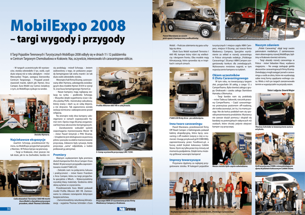 MobilExpo 2008 – targi wygody i przygody II Targi Pojazdów Terenowych i Turystycznych MobilExpo 2008 odbyły się w dniach 11 i 12 października w Centrum Targowym Chemobudowa w Krakowie. Nas, oczywiście, interesowało ich caravaningowe oblicze. - W targach uczestniczyło 60 wystawców, stoiska odwiedziło 5 tys. osób, czyli dużo więcej niż w roku ubiegłym – mówi Mieczysław Trojan, zastępca kierownika Centrum Targowego. – Przyjazd przedstawicieli marek, takich jak: Hymer, Arca Camper, Eura Mobil czy Camos świadczy o tym, że MobilExpo zyskuje na randze. Stoisko Hymera. Najciekawsze ekspozycje Joachim Schorpp, przedstawiciel Hymera, na MobilExpo przyjechał specjalnie z Niemiec. W Polsce był po raz pierwszy. - Targi w Krakowie, choć jeszcze nie tak duże, jak te na Zachodzie, bardzo mi Cała okazałość Terrestry I 660 HB marki Eura Mobil z charakterystycznym przodem, obok Thomas Schröder. 14 się podobają - mówił Schorpp. - Jestem zadowolony z tego, że pokazano pojazdy kempingowe tak wielu marek i że tak dużo osób odwiedziło stoiska. Wewnątrz hali firma Elcamp, autoryzowany diler Hymera, udostępniła zwiedzającym dwa modele Hymer: B 614 w wersji SL oraz busa kempingowego HymerCar. - Nasze kampery mają najlepszą izolację na rynku – podkreśla Schorpp. – Wszystko dzięki wypełnieniu ścian i dachu pianką PUAL i konstrukcji zabudowy, której ściany i dach są ze sobą klejone, a nie skręcane. Tak zapewniona została izolacja termiczna i zabezpieczenie przed wilgocią. Na zewnątrz stały dwa kampery udostępniane w ramach wypożyczalni Hymer-rent. Oprócz tego Elcamp zorganizował kiermasz akcesoriów kempingowych. - Zaciekawienie wzbudził system wspomagania manewrowania Mover SE – mówi Paweł Gmytryk z PHU Elcamp. – Urządzenie jest obsługiwane za pomocą pilota i pozwala na zdalne manewrowanie przyczepą. Zabawne były sytuacje, kiedy przyczepa „sama” odjeżdżała, a ludzie próbowali ją zatrzymać. Premiery Ważnym wydarzeniem była premiera dwóch kamperów firm Arca Camper i Eura Mobil. W pierwszym przypadku zaprezentowano model P 680 LSX. - Zależało nam na połączeniu luksusu i praktyczności – mówi Karen Frandsen z Arca Camper, która na targi przyjechała specjalnie z Włoch. – Wykorzystaliśmy wysokiej klasy materiały. Siedzenia obite skórą są łatwe w czyszczeniu. Przedstawiciele Eura Mobil pokazali model Profila Alkoven 685 VB. Zastosowano tu ciekawe rozwiązanie dotyczące bezpieczeństwa. - Zamontowaliśmy ratunkową klimatyzację – wyjaśnia Thomas Schröder z Eura Pawel Marataew ze swoim pick-upem z kamperową nadbudówką. Mobil. – Podczas ulatniania się gazu uchylają się okna. Obok Eura Mobil wystawił Terrestra I 660 HB, kamper który różni się wielkością i designem frontu. Oba modele mają klimatyzację, która sprawdza się w tropikach i ostrych zimach. W tym roku stoiska off-roadowe wyglądały dużo ciekawiej. turystycznych I miejsce zajęła ABM Campers, miejsce II Elcamp, zaś trzecie firma Wadowscy Campery. Specjalne wyróżnienie za wkład w rozwój caravaningu w Polsce otrzymała redakcja „Polskiego Caravaningu”. Elcamp i ABM Campers zorganizowały konkurs dla zwiedzających. Wylosowano mnóstwo nagród, w tym wypożyczenie kampera na tydzień. Okiem uczestników II Zlotu Caravaningowego Profila Alkoven 685 VB w całej krasie. P 680 LSX firmy Arca - po odsłonięciu. Inna twarz caravaningu S-Camp wystawiła przyczepę LMC 725K. Pawel Marataew, przedstawiciel firmy Off Road Camper z Kaliningradu pokazał kabinę ekspedycyjną, która łączy caravaning z off-roadem (więcej o niej w numerze). Uwagę przykuwał grill COBB BBQ, zaprezentowany przez Foodlovers.pl, a furorę zrobił brykiet kokosowy Cobble Stone. Dymi się tylko przez trzy minuty od momentu podpalenia. Dzięki temu możemy grillować wewnątrz kampera! W tym roku, na towarzyszący targom zlot, przyjechało 30 załóg, z czego 12 z CamperTeamu. Była również załoga z grupy Ondraszek i czeska załoga Stanislava Hamaka z Ołomuńca. - Targi bardzo nam się podobały – mówi Tadeusz Sakowski, rzecznik prasowy CamperTeamu. – Część caravaningowa przewyższa poziomem off-roadową, ale trzeba zauważyć, że i tu, i tu mamy postęp. Nie do końca podobał nam się sposób prezentowania produktów. Wystawcy nie zawsze służyli pomocą i skupiali się bardziej na potencjalnych nabywcach niż osobach, które chciały jedynie obejrzeć kamper czy przyczepę. Naszym zdaniem „Polski Caravaning” objął targi swoim patronatem medialnym. Z zainteresowaniem obserwujemy rozwój MobilExpo, byliśmy w Krakowie również rok temu. - Targi ukazały rozwój caravaningu w Polsce - mówi Sebastian Klauz, wydawca magazynu. – Na uwagę zasługuje giełda akcesoriów caravaningowych firmy Elcamp. Zwiedzający mogli zasięgać porad o caravaningu u osób ze zlotu, które nie wyobrażają sobie innej formy spędzania wolnego czasu. Wielu z nich po targach zarezerwowało termin w wypożyczalni na przyszły sezon. Tekst i zdjęcia: Dawid Majer Thomas Schröder w towarzystwie autora artykułu. Imprezy towarzyszące Przyznano dyplomy za najlepiej przygotowane stoiska. W kategorii pojazdów Nasze stoisko było często odwiedzane. Grill turystyczny COBB z niewydzielającym dymu brykietem kokosowym Cobble Stone. Przyczepa Wilk S3 wystawiona przez firmę Wadowscy Campery z Krakowa. Najlepsi wystawcy MobilExpo z redaktorem „Polskiego Caravaningu”. 15 Zwycięzcy losowania na tle głównej nagrody.