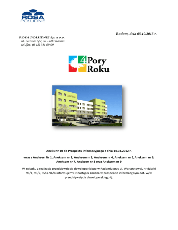 Radom, dnia 05.10.2015 r. ROSA POŁUDNIE Sp. z o.o. ul. Gazowa 5/7, 26 – 600 Radom tel./fax. (0 48) 384 69 09 Aneks Nr 10 do Prospektu informacyjnego z dnia 14.03.2012 r. wraz z Aneksem Nr 1, Aneksem nr 2, Aneksem nr 3, Aneksem nr 4, Aneksem nr 5, Aneksem nr 6, Aneksem nr 7, Aneksem nr 8 oraz Aneksem nr 9 W związku z realizacją przedsięwzięcia deweloperskiego w Radomiu przy ul. Warsztatowej, nr działki 96/1, 96/2, 96/3, 96/4 informujemy iż nastąpiła zmiana w prospekcie informacyjnym dot. w/w przedsięwzięcia deweloperskiego tj. Punkt III. INFORMACJE DOTYCZĄCE NIERUCHOMOŚCI I PRZEDSIĘWZIĘCIA DEWELOPERSKIEGO W części: INFORMACJE DOTYCZĄCE GRUNTU Adres i nr działki ewidencyjnej Nr ewid. działek: 96/1, 96/2, 96/3, 96/4 Przy ul. Warsztatowej w Radomiu (powstałe po podziale działek 5/2, 6/4, 7/4, 92/30) Właścicielem działki o numerze 96/1, na której realizowany jest budynek A - Wiosna, jest spółka ROSA POŁUDNIE, natomiast działek o numerach 96/2, 96/3, na których realizowany będzie odpowiednio budynek B1 i B2 – Lato/Jesień, budynek C - Zima oraz działki 96/4 na której będzie realizowany budynek przedszkola nie wchodzący w skład przedsięwzięcia deweloperskiego, jest spółka RO.SA.-INVEST. Otrzymuje on brzmienie: INFORMACJE DOTYCZĄCE GRUNTU Adres i nr działki ewidencyjnej Nr ewid. działek: 96/1, 96/2, 96/3, 96/4 Przy ul. Warsztatowej 9 w Radomiu (powstałe po podziale działek 5/2, 6/4, 7/4, 92/30) Współwłaścicielem działki o numerze 96/1, na której wybudowany został budynek A - Wiosna, jest spółka ROSA POŁUDNIE, natomiast działek o numerach 96/2, 96/3, na których realizowany będzie odpowiednio budynek B1 i B2 – Lato/Jesień, budynek C - Zima oraz działki 96/4 na której będzie realizowany budynek przedszkola nie wchodzący w skład przedsięwzięcia deweloperskiego, właścicielem jest spółka RO.SA.-INVEST. W części: Istniejące obciążenia hipoteczne nieruchomości lub wnioski o wpis w dziale czwartym księgi wieczystej Hipoteka umowna w KW nr RA1R/00128439/3 w wysokości 7 650 000,00 zł na rzecz Banku Spółdzielczego w Iłży oddział w Radomiu Otrzymuje on brzmienie: Istniejące obciążenia hipoteczne nieruchomości lub wnioski o wpis w dziale czwartym księgi wieczystej Hipoteka umowna w KW nr RA1R/00128439/3 w wysokości 7 650 000,00 zł na rzecz Banku Spółdzielczego w Iłży oddział w Radomiu Hipoteka umowna w KW nr RA1R/00157340/4 w wysokości 9 450 000,00 zł na rzecz banku PKO BP SA – zobowiązanie wykonawcy z tytułu kredytu na częściowe sfinansowanie budowy Zadania II W części: Informacje zawarte w pub-licznie dostępnych dokumentach dotyczących prze-widzianych inwestycji w promieniu 1 km od przedmiotowej nieruchomości, w szczególności o budowie lub rozbudowie dróg, bu-dowie linii szynowych oraz przewidzianych korytarzach powietrznych, a także znanych innych inwestycjach komunalnych, w szczególności oczyszczalniach ścieków, spalarniach śmieci, wysypiskach, cmentarzach Zostało wydane pozwolenie na budowę obwodnicy południowej III etap – od terenów PKP do ul. Wierzbickiej i Potkanowskiej wraz z infrastrukturą techniczną w liniach rozgraniczenia i poza tymi liniami. Otrzymuje on brzmienie: Informacje zawarte w pub-licznie dostępnych dokumentach dotyczących prze-widzianych inwestycji w promieniu 1 km od przedmiotowej nieruchomości, w szczególności o budowie lub rozbudowie dróg, budowie linii szynowych oraz przewidzianych korytarzach powietrznych, a także znanych innych inwestycjach komunalnych, w szczególności oczyszczalniach ścieków, spalarniach śmieci, wysypiskach, cmentarzach Zostało wydane pozwolenie na budowę obwodnicy południowej III etap – od terenów PKP do ul. Wierzbickiej i Potkanowskiej wraz z infrastrukturą techniczną w liniach rozgraniczenia i poza tymi liniami – inwestycja zrealizowana, droga oddana od użytku. W części: Planowany termin rozpoczęcia i zakończenia prac budowlanych Rozpoczęcie całego przedsięwzięcia oraz etapu I – X.2012 Zakończenie etapu I – V.2015 Zakończenie etapu II – VI.2016 Zakończenie etapu III oraz całego przedsięwzięcia – XII.2017 Termin, do którego nastąpi przeniesienie prawa własności nieruchomości 30.09.2015 (dla zadania I) 31.12.2016 (dla zadania II) 30.06.2018 (dla zadania III) Harmonogram przedsięwzięcia deweloperskiego, w etapach ZADANIE NUMER I – BUDYNEK „A” WIOSNA Etap pierwszy - płyta fundamentowa – 31.03.2014 – 16% Etap drugi - stan „zero” – 31.05.2014 – 24% Etap trzeci - stan surowy – 31.12.2014 – 25% Etap czwarty-roboty wykończeniowe – 31.07.2015 – 25% Przeniesienie własności – 30.09.2015 – 10% ZADANIE NUMER II – BUDYNEK „B1” i „B2” LATO i JESIEŃ Etap pierwszy - płyta fundamentowa – 31.07.2015 – 16% Etap drugi - stan „zero” – 30.11.2015 – 24% Etap trzeci - stan surowy – 30.09.2016 – 25% Etap czwarty-roboty wykończeniowe – 31.12.2016 – 25% Przeniesienie własności – 30.06.2017 – 10% ZADANIE NUMER III – BUDYNEK „C” ZIMA Etap pierwszy - płyta fundamentowa – 30.09.2016 – 16% Etap drugi - stan „zero” – 31.12.2016 – 24% Etap trzeci - stan surowy – 30.09.2017 – 25% Etap czwarty-roboty wykończeniowe – 31.12.2017 – 25% Przeniesienie własności – 30.06.2018 – 10% Otrzymuje on brzmienie: Planowany termin rozpoczęcia i zakończenia prac budowlanych Rozpoczęcie całego przedsięwzięcia oraz etapu I – X.2012 Zakończenie etapu I – pozwolenie na użytkowanie budynku AWiosna nr 89/15 z dnia 04.08.2015 Zakończenie etapu II – III.2017 Zakończenie etapu III oraz całego przedsięwzięcia – III.2018 Termin, do którego nastąpi przeniesienie prawa własności nieruchomości Od 14.09.2015 własność przenoszona sukcesywnie dla kolejnych lokali (dla zadania I) 30.09.2017 (dla zadania II) 30.09.2018 (dla zadania III) Harmonogram przedsięwzięcia deweloperskiego, w etapach ZADANIE NUMER I – BUDY
