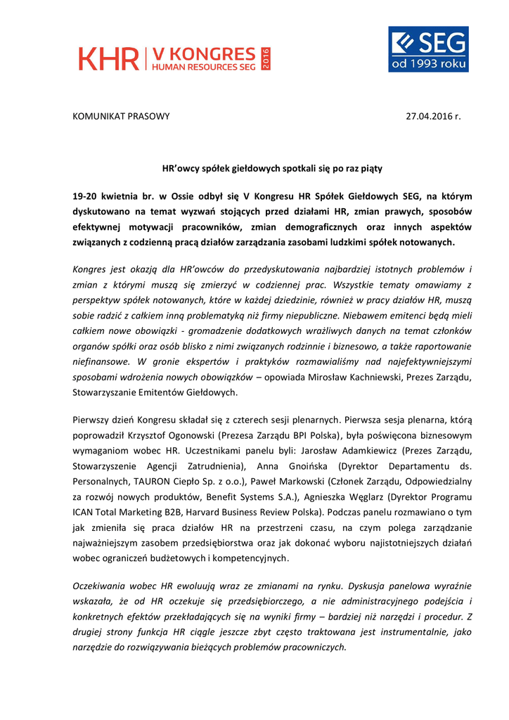 KOMUNIKAT PRASOWY 27.04.2016 r. HR’owcy spółek giełdowych spotkali się po raz piąty 19-20 kwietnia br. w Ossie odbył się V Kongresu HR Spółek Giełdowych SEG, na którym dyskutowano na temat wyzwań stojących przed działami HR, zmian prawych, sposobów efektywnej motywacji pracowników, zmian demograficznych oraz innych aspektów związanych z codzienną pracą działów zarządzania zasobami ludzkimi spółek notowanych. Kongres jest okazją dla HR’owców do przedyskutowania najbardziej istotnych problemów i zmian z którymi muszą się zmierzyć w codziennej prac. Wszystkie tematy omawiamy z perspektyw spółek notowanych, które w każdej dziedzinie, również w pracy działów HR, muszą sobie radzić z całkiem inną problematyką niż firmy niepubliczne. Niebawem emitenci będą mieli całkiem nowe obowiązki - gromadzenie dodatkowych wrażliwych danych na temat członków organów spółki oraz osób blisko z nimi związanych rodzinnie i biznesowo, a także raportowanie niefinansowe. W gronie ekspertów i praktyków rozmawialiśmy nad najefektywniejszymi sposobami wdrożenia nowych obowiązków – opowiada Mirosław Kachniewski, Prezes Zarządu, Stowarzyszanie Emitentów Giełdowych. Pierwszy dzień Kongresu składał się z czterech sesji plenarnych. Pierwsza sesja plenarna, którą poprowadził Krzysztof Ogonowski (Prezesa Zarządu BPI Polska), była poświęcona biznesowym wymaganiom wobec HR. Uczestnikami panelu byli: Jarosław Adamkiewicz (Prezes Zarządu, Stowarzyszenie Agencji Zatrudnienia), Anna Gnoińska (Dyrektor Departamentu ds. Personalnych, TAURON Ciepło Sp. z o.o.), Paweł Markowski (Członek Zarządu, Odpowiedzialny za rozwój nowych produktów, Benefit Systems S.A.), Agnieszka Węglarz (Dyrektor Programu ICAN Total Marketing B2B, Harvard Business Review Polska). Podczas panelu rozmawiano o tym jak zmieniła się praca działów HR na przestrzeni czasu, na czym polega zarządzanie najważniejszym zasobem przedsiębiorstwa oraz jak dokonać wyboru najistotniejszych działań wobec ograniczeń budżetowych i kompetencyjnych. Oczekiwania wobec HR ewoluują wraz ze zmianami na rynku. Dyskusja panelowa wyraźnie wskazała, że od HR oczekuje się przedsiębiorczego, a nie administracyjnego podejścia i konkretnych efektów przekładających się na wyniki firmy – bardziej niż narzędzi i procedur. Z drugiej strony funkcja HR ciągle jeszcze zbyt często traktowana jest instrumentalnie, jako narzędzie do rozwiązywania bieżących problemów pracowniczych. Zarówno paneliści, jak i słuchacze byli zgodni, że HR potrzebuje zwrócić się w stronę pragmatycznych i prostych rozwiązań, które wszyscy użytkownicy, a zwłaszcza menedżerowie będą mogli łatwo stosować na co dzień. W szczególności HR powinien być aktywnym architektem i moderatorem procesów zmian w organizacji oraz dostarczać standardów i metod w tym zakresie. Jest to trend światowy, który do polskich firm dopiero zaczyna docierać- mówi Krzysztof Ogonowski, Prezesa Zarządu BPI Polska. W drugiej dyskusji nt. „Nowe wyzwania HR spółek giełdowych od 2017 roku” poprowadzonej przez mec. Czesława Sadkowskiego (Radca Prawny, Partner Zarządzający Kancelarią Sadkowski i Wspólnicy) wzięli udział: Jacek Kowalski (Członek Zarządu ds. Zasobów Ludzkich, Orange Polska S.A.), Marzena Łabędź (Radca prawny, Dyrektor Działu Prawa Pracy, Partner w Kancelarii Sadkowski i Wspólnicy S.K.A.) oraz prof. nadzw. dr hab. Mirosław Włodarczyk (Uniwersytet Łódzki). Mówiono między innymi o: powiązaniu wymogu raportowania CSR z wielkością zatrudnienia; pojęciu pracownika w prawie polskim i unijnym – podobieństwa i różnice; podmiotach objętych obowiązkiem raportowania – jak rozumieć kryterium średniej liczby 500 pracowników; problematyce współpracy w oparciu o umowy cywilnoprawne. W trzeciej sesji „Zmiany demograficzne – nowa rola i wyzwania dla HR” pod batutą Pawła Oksanowicza (Redaktor MUZO.FM, Prowadzący program BIZON, Biznes Odpowiedzialny i Nowoczesny) rozmawiali Jacek Jaczyński (Dyrektor Personalny i Administracji, Lotte Wedel Sp. z o.o.), Anna Karaszewska (Prezes Zarządu, INGEUS Sp. z o.o. ), prof. UW dr hab. Jacek Męcina (Doradca Zarządu Konfederacji Lewiatan), Małgorzata Rusewicz (Prezes Izby Gospodarczej Towarzystw Emerytalnych). Przedyskutowane zostały takie zagadnienia jak: rynek pracy i zabezpieczenie emerytalne w przyszłości; zagrożenia, szanse i wyzwanie dla pracodawców; jak optymalizować strategię HR, by zyskać na nadchodzących zmianach; edukacja ekonomiczna, jako narzędzie CSR i HR. Dyskusja panelowa w gronie praktyków i teoretyków pozwoliła określić wyzwania i możliwości, jakie pracodawcom przyniosą nadchodzące zmiany demograficzne. Wobec prognoz Komisji Europejskiej określających relację emerytury do ostatniej pensji dla osób wchodzących obecnie na rynek pracy w Polsce na poziomie niecałych 30%, zdecydowaliśmy się stworzyć edukacyjny program CSR, którego celem jest wyposażenie młodych osób w wiedzę pozwalającą na świadome podjęcie decyzji w zakresie zabezpieczenia emerytalnego. Do programu, który nie generuje kosztów, a odpowiada na ważny społecznie problem i pozwala na pogłębienie relacji z pracownikiem zaprosiliśmy wszystkich pracodawców – tłumaczy Małgorzata Rusewicz, prezes Izby Gospodarczej Towarzystw Emerytalnych. Tematem czwartej sesji moderowanej przez Mirosława Kachniewskiego (Prezes Zarządu Stowarzyszenia Emitentów Giełdowych) były zagadnienia dotyczące motywacji kluczowych pracowników firmy w tym m.in. pozafinansowe systemy motywacyjne, profilaktyka medyczna jako czynnik podnoszący motywację i wydajność pracowników. W dyskusji zabrali głos: Agnieszka Lechman-Filipiak (Radca prawny, Partner kierująca praktyką prawa pracy, DLA Piper), Piotr Madej (Wiceprezes Zarządu, Dyrektor Działu Rozwoju Rozwiązań Telemedycznych, Comarch Healthcare), Wojciech Sularz