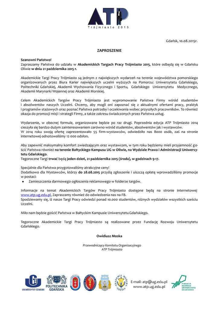 Gdańsk, 10.08.2015r. ZAPROSZENIE Szanowni Państwo! Zapraszamy Państwa do udziału w Akademickich Targach Pracy Trójmiasto 2015, które odbędą się w Gdańsku Oliwie w dniu 21 października 2015 r. Akademickie Targi Pracy Trójmiasto są jednym z największych wydarzeń na terenie województwa pomorskiego organizowanych przez Biura Karier największych uczelni wyższych na Pomorzu: Uniwersytetu Gdańskiego, Politechniki Gdańskiej, Akademii Wychowania Fizycznego i Sportu, Gdańskiego Uniwersytetu Medycznego, Akademii Marynarki Wojennej oraz Akademii Morskiej. Celem Akademickich Targów Pracy Trójmiasto jest wypromowanie Państwa Firmy wśród studentów i absolwentów naszych Uczelni. Chcemy, aby mogli oni zapoznać się z aktualnymi ofertami pracy, praktyk i programów stażowych oraz poznać Państwa potrzeby i oczekiwania wobec przyszłych pracowników. To również okazja do promocji misji i strategii Firmy, a także zakresu świadczonych przez Państwa usług. Wydarzenie, w obecnej formule, organizowane będzie po raz drugi. Poprzednia edycja ATP Trójmiasto 2014 cieszyła się bardzo dużym zainteresowaniem zarówno wśród studentów, absolwentów jak i wystawców. W 2014 roku swoją ofertę zaprezentowało 55 firm-wystawców, odwiedziło nas 8000 osób, zaś na stronie internetowej odnotowaliśmy 12 000 odsłon. Aby zapewnić maksymalny komfort zwiedzającym oraz wystawcom, w tym roku będziemy mieli przyjemność gościć Państwa również na terenie Bałtyckiego Kampusu UG w Oliwie, na Wydziale Prawa i Administracji Uniwersytetu Gdańskiego. Tegoroczne Targi trwać będą jeden dzień, 21 października 2015 (środa), w godzinach 9-17. Specjalnie dla Państwa przygotowaliśmy atrakcyjne ceny! Dodatkowo dla Wystawców, którzy do 28.08.2015 przyślą zgłoszenie i uiszczą opłatę wprowadziliśmy promocje w postaci: Zamieszczenia darmowego ogłoszenia reklamowego w folderze targów. Informacje na temat Akademickich Targów Pracy Trójmiasto dostępne będą na stronie internetowej www.atp.ug.edu.pl. Zapraszamy również do odwiedzenia nas na FB. Spodziewamy się, iż nasze Targi Pracy odwiedzi ponad 10.000 studentów, różnych wydziałów wszystkich sześciu Uczelni. Miło nam będzie gościć Państwa w Bałtyckim Kampusie Uniwersytetu Gdańskiego. Tegoroczne Akademickie Targi Pracy Trójmiasto są realizowane przez Fundację Rozwoju Uniwersytetu Gdańskiego. Owidiusz Moska Przewodniczący Komitetu Organizacyjnego ATP Trójmiasto FORMULARZ ZGŁOSZENIOWY – ZAMÓWIENIE Termin przyjmowania zgłoszeń: do 11 września 2015 r. na adres e-mail: [email protected] lub fax: 58/ 552-37-06 Dane do faktury: Nazwa wystawcy:……………………………………………………………………………………………………….………… NIP: ………………………………………………………. ul………………………………………………………….. Kod: ……………………………………….. Miejscowość: ……………………………………….………………………....... Dane dodatkowe: Osoba upoważniona do kontaktu: ………………………………………………www………………………………………………………… Nr tel.:………………………………… Nr faksu: ………………………….… E-mail:…………………………………..……… Napis na fryzie (nazwa firmy):…………………………………………………………………………………………………… Nazwa wystawcy: *stoisko niezabudowane może posiadać ścianki boczne wynikające z ustawienia pozostałych stoisk 2 Stoisko: (minimalna powierzchnia 4 m ) zabudowane z wyposażeniem wg standardu niezabudowane – wg standardu (bez wyposażenia)* 230 zł netto 190 zł netto za 1 m2 za 1 m2 2 stolik i 4 krzesła / 4m Proszę zakreślić wybrany zestaw: lub (tylko w przypadku stoisk zabudowanych!) lada i 2 krzesła / 4m2 Ogłoszenie reklamowe w folderze wystawców: obowiązkowy wpis do folderu: Nazwa firmy – ta sama jak na fryzie, adres, telefon- do 1400 zn. czarno-biały Tekst do katalogu należy przesłać na adres e-mail [email protected] A5 kolor do dnia 30 września 2015r (dokument WORD). Nazwa dokumentu A5 kolor, pier./ost str powinna zawierać nazwę firmy. A5 kolor, wew okładki Dodatkowe zamówienia: (co, ilość, cena, koszt) – informacje w cenniku Stoisko szeregowe Wybór: zabudowane / niezabudowane Cena netto za 1 m2 Wartość netto ...................m2 .................. = ................. zł ………………. ………………. ………………. ………………. = = = = 365 zł netto 550 zł netto 690 zł netto 800 zł netto = RAZEM (netto) INTERNET Imię i nazwisko osoby odpowiedzialnej za dostęp do Internetu na stoisku: zł = ………….......................zł …………………………………………………………………….. Oświadczamy, że zapoznawaliśmy się w warunkami uczestnictwa w ATP Trójmiasto i akceptujemy je w całości. Data, pieczątka instytucji, podpis prawnie wiążący INFORMACJE OGÓLNE: Organizator: Biura Karier: Uniwersytetu Gdańskiego, Politechniki Gdańskiej, Akademii Wychowania Fizycznego i Sportu, Gdańskiego Uniwersytetu Medycznego, Akademii Marynarki Wojennej oraz Akademii Morskiej. Realizator: Fundacja Rozwoju Uniwersytetu Gdańskiego – Akademickie Targi Pracy Trójmiasto ul. Polanki 66, 80-306 Gdańsk tel. 058 / 552-03-53, fax.: 058 / 552-37-06, e-mail: [email protected] Termin i miejsce Targów: 21 października 2015 r. Bałtycki Kampus Uniwersytetu Gdańskiego Wydział Prawa i Administracji Uniwersytetu Gdańskiego ul. Jana Bażyńskiego 6, 80-952 Gdańsk Godziny otwarcia dla zwiedzających: 21 października 2015 r. (środa): godz. 09:00 - 17:00 Internet Specjalnie dla wystawców organizator przygotuje dostęp do Internetu. Prosimy o podanie osoby odpowiedzialnej w formularzu zgłoszeniowym. Imprezy głów