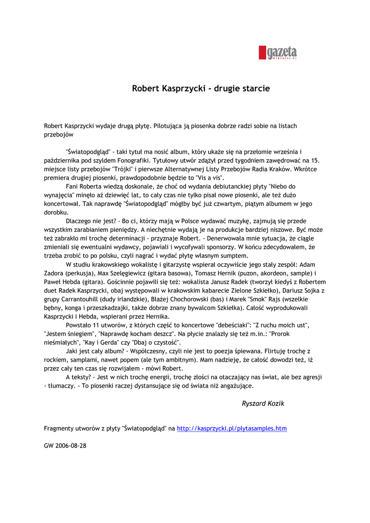 Robert Kasprzycki - drugie starcie Robert Kasprzycki wydaje drugą płytę. Pilotująca ją piosenka dobrze radzi sobie na listach przebojów "Światopodgląd" - taki tytuł ma nosić album, który ukaże się na przełomie września i października pod szyldem Fonografiki. Tytułowy utwór zdążył przed tygodniem zawędrować na 15. miejsce listy przebojów "Trójki" i pierwsze Alternatywnej Listy Przebojów Radia Kraków. Wkrótce premiera drugiej piosenki, prawdopodobnie będzie to "Vis a vis". Fani Roberta wiedzą doskonale, że choć od wydania debiutanckiej płyty "Niebo do wynajęcia" minęło aż dziewięć lat, to cały czas nie tylko pisał nowe piosenki, ale też dużo koncertował. Tak naprawdę "Światopodgląd" mógłby być już czwartym, piątym albumem w jego dorobku. Dlaczego nie jest? - Bo ci, którzy mają w Polsce wydawać muzykę, zajmują się przede wszystkim zarabianiem pieniędzy. A niechętnie wydają je na produkcje bardziej niszowe. Być może też zabrakło mi trochę determinacji - przyznaje Robert. - Denerwowała mnie sytuacja, że ciągle zmieniali się ewentualni wydawcy, pojawiali i wycofywali sponsorzy. W końcu zdecydowałem, że trzeba zrobić to po polsku, czyli nagrać i wydać płytę własnym sumptem. W studiu krakowskiego wokalistę i gitarzystę wspierał oczywiście jego stały zespół: Adam Zadora (perkusja), Max Szelęgiewicz (gitara basowa), Tomasz Hernik (puzon, akordeon, sample) i Paweł Hebda (gitara). Gościnnie pojawili się też: wokalista Janusz Radek (tworzył kiedyś z Robertem duet Radek Kasprzycki, obaj występowali w krakowskim kabarecie Zielone Szkiełko), Dariusz Sojka z grupy Carrantouhill (dudy irlandzkie), Błażej Chochorowski (bas) i Marek "Smok" Rajs (wszelkie bębny, konga i przeszkadzajki, także dobrze znany bywalcom Szkiełka). Całość wyprodukowali Kasprzycki i Hebda, wspierani przez Hernika. Powstało 11 utworów, z których część to koncertowe "debeściaki": "Z ruchu moich ust", "Jestem śniegiem", "Naprawdę kocham deszcz". Na płycie znalazły się też m.in.: "Prorok nieśmiałych", "Kay i Gerda" czy "Dbaj o czystość". Jaki jest cały album? - Współczesny, czyli nie jest to poezja śpiewana. Flirtuję trochę z rockiem, samplami, nawet popem (ale tym ambitnym). Mam nadzieję, że całość dowodzi też, iż przez cały ten czas się rozwijałem - mówi Robert. A teksty? - Jest w nich trochę energii, trochę złości na otaczający nas świat, ale bez agresji - tłumaczy. - To piosenki raczej dystansujące się od świata niż angażujące. Ryszard Kozik Fragmenty utworów z płyty "Światopodgląd" na http://kasprzycki.pl/plytasamples.htm GW 2006-08-28