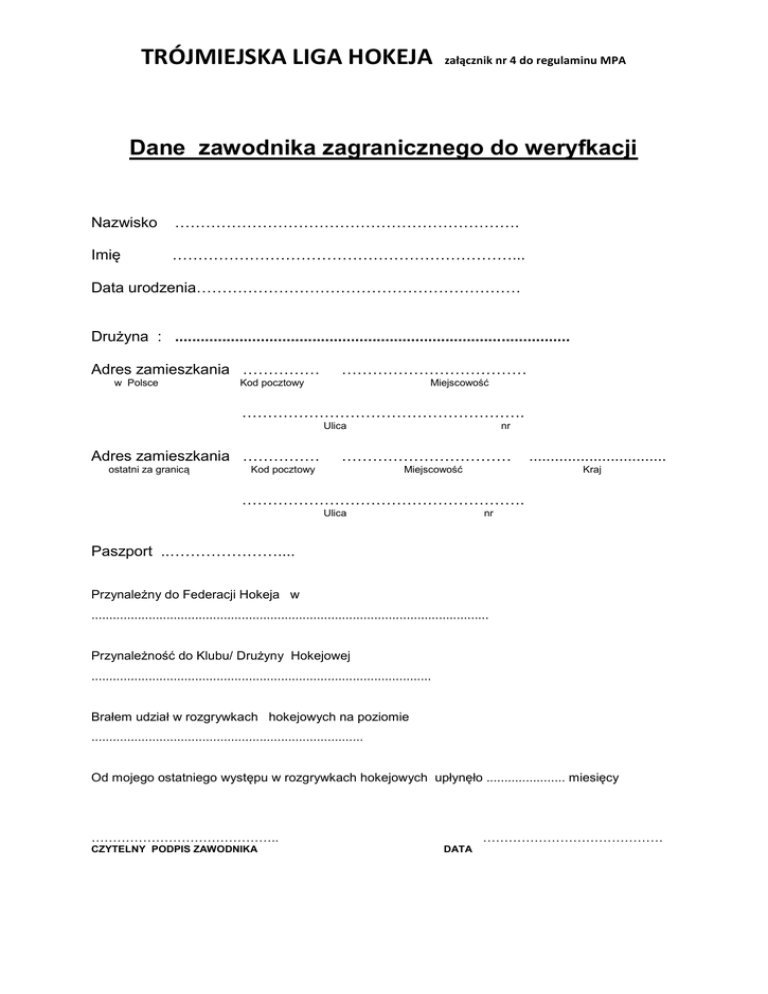 TRÓJMIEJSKA LIGA HOKEJA załącznik nr 4 do regulaminu MPA Dane zawodnika zagranicznego do weryfkacji Nazwisko …………………………………………………………. Imię …………………………………………………………... Data urodzenia……………………………………………………… Drużyna : ............................................................................................ Adres zamieszkania …………… w Polsce ……………………………… Kod pocztowy Miejscowość ………………………………………………. Ulica Adres zamieszkania …………… ostatni za granicą nr …………………………… Miejscowość Kod pocztowy ................................ Kraj ………………………………………………. Ulica nr Paszport ..………………….... Przynależny do Federacji Hokeja w ............................................................................................................... Przynależność do Klubu/ Drużyny Hokejowej ............................................................................................... Brałem udział w rozgrywkach hokejowych na poziomie ............................................................................ Od mojego ostatniego występu w rozgrywkach hokejowych upłynęło ...................... miesięcy …………………………………….. CZYTELNY PODPIS ZAWODNIKA …………………………………… DATA