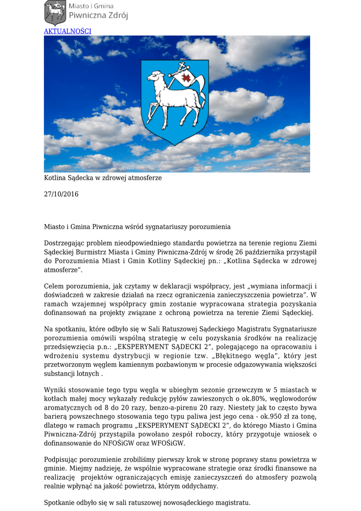 AKTUALNOŚCI Kotlina Sądecka w zdrowej atmosferze 27/10/2016 Miasto i Gmina Piwniczna wśród sygnatariuszy porozumienia Dostrzegając problem nieodpowiedniego standardu powietrza na terenie regionu Ziemi Sądeckiej Burmistrz Miasta i Gminy Piwniczna-Zdrój w środę 26 października przystąpił do Porozumienia Miast i Gmin Kotliny Sądeckiej pn.: „Kotlina Sądecka w zdrowej atmosferze”. Celem porozumienia, jak czytamy w deklaracji współpracy, jest „wymiana informacji i doświadczeń w zakresie działań na rzecz ograniczenia zanieczyszczenia powietrza”. W ramach wzajemnej współpracy gmin zostanie wypracowana strategia pozyskania dofinansowań na projekty związane z ochroną powietrza na terenie Ziemi Sądeckiej. Na spotkaniu, które odbyło się w Sali Ratuszowej Sądeckiego Magistratu Sygnatariusze porozumienia omówili wspólną strategię w celu pozyskania środków na realizację przedsięwzięcia p.n.: „EKSPERYMENT SĄDECKI 2”, polegającego na opracowaniu i wdrożeniu systemu dystrybucji w regionie tzw. „Błękitnego węgla”, który jest przetworzonym węglem kamiennym pozbawionym w procesie odgazowywania większości substancji lotnych . Wyniki stosowanie tego typu węgla w ubiegłym sezonie grzewczym w 5 miastach w kotłach małej mocy wykazały redukcję pyłów zawieszonych o ok.80%, węglowodorów aromatycznych od 8 do 20 razy, benzo-a-pirenu 20 razy. Niestety jak to często bywa barierą powszechnego stosowania tego typu paliwa jest jego cena - ok.950 zł za tonę, dlatego w ramach programu „EKSPERYMENT SĄDECKI 2”, do którego Miasto i Gmina Piwniczna-Zdrój przystąpiła powołano zespół roboczy, który przygotuje wniosek o dofinansowanie do NFOŚiGW oraz WFOŚiGW. Podpisując porozumienie zrobiliśmy pierwszy krok w stronę poprawy stanu powietrza w gminie. Miejmy nadzieję, że wspólnie wypracowane strategie oraz środki finansowe na realizację projektów ograniczających emisję zanieczyszczeń do atmosfery pozwolą realnie wpłynąć na jakość powietrza, którym oddychamy. Spotkanie odbyło się w sali ratuszowej nowosądeckiego magistratu. (ALP)