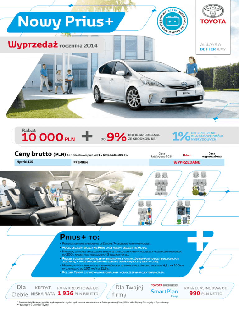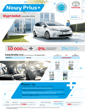 Nowy Prius+ Wyprzedaż rocznika 2014 Rabat 10 000 PLN DO 9% DOFINANSOWANIA ZE ŚRODKÓW UE** Ceny brutto (PLN) Cennik obowiązuje od 15 listopada 2014 r. Hybrid 135 1% Cena katalogowa 2014 UBEZPIECZENIE DLA SAMOCHODÓW HYBRYDOWYCH Rabat Cena wyprzedażowa WYPRZEDANE PREMIUM + P rius + to : •Pierwsze seryjnie oferowane w Europie 7-osobowe auto hybrydowe. •Model dłuższy i wyższy niż Prius oraz niższy i dłuższy niż Verso. •Hybryda, w której umieszczenie baterii w tunelu centralnym powiększa przestrzeń bagażową do 200 l nawet przy rozłożonych 3 rzędach foteli. •Pojazd z dachem panoramicznym wykonanym z materiałów kompozytowych obniżających jego masę, a także wyposażonym w zdalnie zamykaną roletę elektryczną. •Minivan, który pomimo swoich rozmiarów jest w stanie spalić średnio zaledwie 4,1 l na 100 km i przyspieszyć do 100 km/h w 11,3 s. •Kolejna Toyota z wyjątkowo oryginalnym i nowoczesnym projektem wnętrza. Dla Ciebie KREDYT RATA KREDYTOWA OD NISKA RATA 1 936 PLN BRUTTO Dla Twojej firmy * Gwarancja tylko w przypadku wykonywania regularnych testów akumulatora w Autoryzowanej Stacji Dilerskiej Toyoty. Szczegóły u Sprzedawcy. ** Szczegóły u Dilerów Toyoty. RATA LEASINGOWA OD 990 PLN NETTO Wyposażenie PREMIUM Składany trzeci rząd siedzeń (7 miejsc) STD 7 poduszek powietrznych STD ABS + EBD + BA STD VSC+ (system stabilizacji pojazdu) STD E-TRC (elektroniczna kontrola trakcji) STD HAC (system wspomagający pokonywanie podjazdów) STD Felgi aluminiowe 16" (opony 205/60 R16) STD Felgi aluminiowe 17" (opony 215/50 R17) Pakiet Comfort Tempomat STD Przednie światła przeciwmgielne STD Przednie światła mijania halogenowe STD System „Inteligentny kluczyk” (otwieranie i uruchamianie bez użycia kluczyka drzwi kierowcy/pasażera/klapy bagażnika) STD/STD/STD Światła do jazdy dziennej typu LED STD Skórzana kierownica z przyciskami do obsługi klimatyzacji, telefonu i systemu audio STD Touch Tracer – wyświetlacz pomocniczy przycisków na kierownicy STD Gniazda USB i Aux-In STD System multimedialny Toyota Touch (6 głośników) z ekranem dotykowym 6,1" /kamerą cofania STD/STD System audio JBL z 8 głośnikami Pakiet Comfort Składane i podgrzewane lusterka z kierunkowskazami STD Czujnik deszczu STD Klimatyzacja automatyczna STD Roleta przestrzeni bagażowej STD Schowek na okulary STD Kieszenie w oparciach foteli kierowcy i pasażera STD Elektryczna regulacja podparcia lędźwiowego oraz manualna wysokości fotela kierowcy STD Przyciemniana szyba tylna i tylne boczne STD Rolety przeciwsłoneczne w tylnych drzwiach STD Dach panoramiczny wykonany z żywicy z funkcją automatycznego zamykania rolety 3 900 PLN Podświetlenie przestrzeni na nogi kierowcy i pasażera STD Wyświetlacz projekcyjny HUD na przedniej szybie, wyświetlający informacje o prędkości i trybie jazdy/o manewrach podczas jazdy z włączoną nawigacją STD/– Podgrzewane siedzenia STD Lakier metalik 2 300 PLN Lakier biały perłowy 3 200 PLN Nawigacja Toyota Touch&Go z menu w języku polskim oraz z systemem multimedialnym (6 głośników), ekranem dotykowym 6,1" i kamerą cofania 3 210 PLN Pakiet Comfort: 8 głośników systemu audio JBL, 17" felgi aluminiowe z oponami 215/50 R17 2 900 PLN Pakiet Protection1: wykładzina bagażnika, listwy ochronne zderzaków, aluminiowe nakładki progów drzwi przednich z logo Hybrid 1 050 PLN Elektroniczny system zabezpieczenia antykradzieżowego komputera i złącza diagnostycznego z możliwością dodatkowego zwiększenia jego stopnia ochrony2 STD Rozszerzenie zabezpieczenia pojazdu o elektroniczny system antykradzieżowy: ochrony wnętrza, dźwiękowej sygnalizacji włamania oraz identyfikację kierowcy poprzez kartę PROXY w przypadku kradzieży kluczyków samochodu3 880 PLN 1 3 Montowany u Dilera, cena brutto zawiera koszt montażu. 2 Bezobsługowy system renomowanej firmy Cobra AT, światowego lidera w branży samochodowych zabezpieczeń elektronicznych. Klasa skuteczności PIMOT: profesjonalna. Tapicerki Tapicerka materiałowa w kolorze morskim Standard w wersji Premium Tapicerka materiałowa w kolorze ciemnoszarym Standard w wersji Premium Pakiet Comfort 2 900 PLN 8 głośników systemu audio JBL, felgi aluminiowe 17" ( opony 215/50 R17) Systemy multimedialne Toyota Touch E lementy dodatkowe w T oyota T ouch &G o : • nawigacja satelitarna i menu w języku polskim • k atalog miejsc użyteczności publicznej POI • komunik aty drogowe TMC or a z informacje o ogr aniczeniach prędkości • integr acja z G oogle L ocal S earch • wysyłanie do nawigacji samochodu adresów z mapy . google . pl • aplikacje multimedialne ( m . in .: SMS, prognoza pogody , aplikacja „ szklanka wody ” ułatwiająca ekonomiczną ja zdę ) T oyota T ouch : • dotykowy wyświetl acz 6,1" • k amer a cofania 1 • r adio CD + MP3 + WMA + USB • zestaw głośnomówiący B luetooth • integr acja z odtwarzaczem i P od •B luetooth audio 2 1 E lementy dodatkowe w T oyota T ouch &G o PRO: • dotykowy wyświetl acz 7" • mapy nawigacji na dysku twardym • trójwymiarowe mapy • cyfrowe r adio (DAB/DAB+/DMB) • obsługa e - mail 2 • funkcja odczytywania SMS- ów i e - maili przez lektor a 2 • rozpoznawanie mowy (7 języków ) • synchronizacja z k alendarzem spotk ań 2 Opis w języku polskim dostępny w systemie Toyota Touch&Go. 2 Lista kompatybilnych modeli telefonów dostępna w stacjach dilerskich. Pakiet Protection 1 050 PLN wykładzina bagażnika , listwy ochronne zderzaków , aluminiowe nakładki progów drzwi przednich z logo Hybrid Kolory 040 Biały 070 Biały perłowy metalik 1G3 Grafitowy metalik 202 Czarny 3R3 Czerwony metalik 8T5 Ciemnoniebieski metalik 1F7 Jasnosrebrny metalik Dane techniczne Hybrid 135 ZUŻYCIE PALIWA (dyrektywa UE 80/1268-1999/100 WE) Miasto [litry/100 km] koła 16"/17" 3,8/4,3 Poza miastem [litry/100 km] koła 16"/17" 4,2/4,3 Średnio [litry/100 km] koła 16"/17" 4,1/4,4 Zalecane paliwo bezołowiowa 95 lu