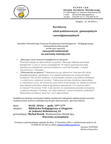 PCPPP i DN Ośrodek Doradztwa Metodycznego 67-200 Głogów ul. Jedności Robotniczej 38 e-mail: sekretariat @pcpppidn.eu tel./fax (76) 833 32 11 (76) 838 42 93 Głogów, 21. 04.2016 r. Dyrektorzy szkół podstawowych, gimnazjalnych i ponadgimnazjalnych Dyrektor Powiatowego Centrum Poradnictwa Psychologiczno – Pedagogicznego i Doskonalenia Nauczycieli serdecznie zaprasza nauczycieli matematyki na warsztaty metodyczne: „Dlaczego warto stosować łamigłówki na lekcjach” Warsztaty starają się odpowiedzieć na pytanie: Dlaczego edukacja potrzebuje łamigłówek? I czym w istocie są łamigłówki? W trakcie prezentowane będą najciekawsze łamigłówki zarówno książkowe z serii Pan Pytajnik, wybrane zręcznościowe i manualne. „Matematyka na planszy” Matematyczne gry planszowe i karciane dla szkoły ponadgimnazjalnej i gimnazjum. Czy zadanie matematyczne można przenieść na planszę? Nie od dziś wiadomo, że matematyka uchodzi za przedmiot nielubiany w szkole przez większość uczniów. Traktowana jest jako dziedzina nieprzydatna w codziennym życiu, zło konieczne, przez które trzeba przejść, by zakończyć pewien etap edukacji pomyślnie zdanym egzaminem maturalnym. Czy możemy jakoś to zmienić? Oczywiście TAK! A jak sprawić, by matematyka przestała się kojarzyć z nudnymi lekcjami i liczbami, czy nieprzydatnymi i niezrozumiałymi symbolami? Matematyka na planszy może być na to odpowiedzią! Dodatkową atrakcją warsztatów będzie możliwość zakupienia edukacyjnych nowości wydawniczych, pomocy dydaktycznych, gier planszowych, gier karcianych. data: miejsce: 04.05. 2016r. – godz. 1500-1700 Biblioteka Pedagogiczna w Głogowie ul. Jedności Robotniczej 10 prowadzący: Michał Nowik Wydawnictwo Nowik Sp.j. Warsztaty są bezpłatne Prosimy o potwierdzanie udziału do dnia 27 kwietnia 2016 r. telefonicznie pod nr tel. 76-838-42-93 lub na adres [email protected] Dyrektor PCPPPiDN Barbara Krzywulicz