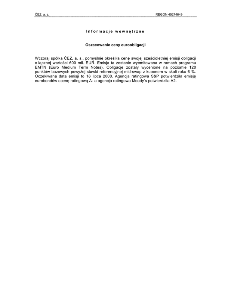 ČEZ, a. s. REGON 45274649 Informacje wewnętrzne Oszacowanie ceny euroobligacji Wczoraj spółka ČEZ, a. s., pomyślnie określiła cenę swojej sześcioletniej emisji obligacji o łącznej wartości 600 mil. EUR. Emisja ta zostanie wyemitowana w ramach programu EMTN (Euro Medium Term Notes). Obligacje zostały wycenione na poziomie 120 punktów bazowych powyżej stawki referencyjnej mid-swap z kuponem w skali roku 6 %. Oczekiwana data emisji to 18 lipca 2008. Agencja ratingowa S&P potwierdziła emisję eurobondów ocenę ratingową A- a agencja ratingowa Moody’s potwierdziła A2.
