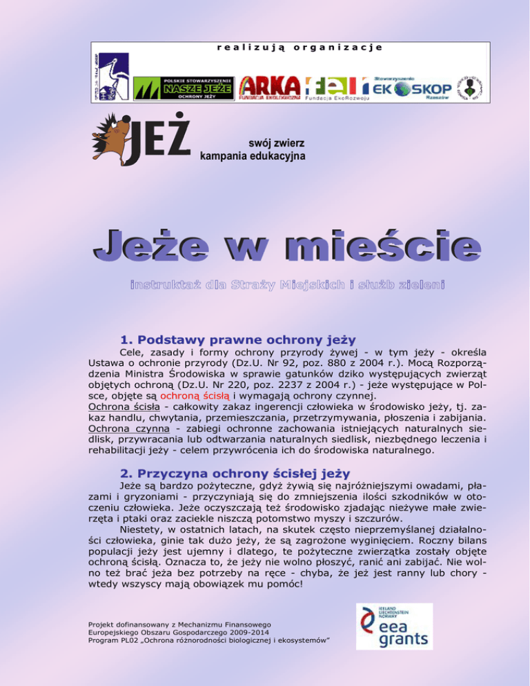 realizują organizacje swój zwierz kampania edukacyjna Jeże w mieście 1. Podstawy prawne ochrony jeży Cele, zasady i formy ochrony przyrody żywej - w tym jeży - określa Ustawa o ochronie przyrody (Dz.U. Nr 92, poz. 880 z 2004 r.). Mocą Rozporządzenia Ministra Środowiska w sprawie gatunków dziko występujących zwierząt objętych ochroną (Dz.U. Nr 220, poz. 2237 z 2004 r.) - jeże występujące w Polsce, objęte są ochroną ścisłą i wymagają ochrony czynnej. Ochrona ścisła - całkowity zakaz ingerencji człowieka w środowisko jeży, tj. zakaz handlu, chwytania, przemieszczania, przetrzymywania, płoszenia i zabijania. Ochrona czynna - zabiegi ochronne zachowania istniejących naturalnych siedlisk, przywracania lub odtwarzania naturalnych siedlisk, niezbędnego leczenia i rehabilitacji jeży - celem przywrócenia ich do środowiska naturalnego. 2. Przyczyna ochrony ścisłej jeży Jeże są bardzo pożyteczne, gdyż żywią się najróżniejszymi owadami, płazami i gryzoniami - przyczyniają się do zmniejszenia ilości szkodników w otoczeniu człowieka. Jeże oczyszczają też środowisko zjadając nieżywe małe zwierzęta i ptaki oraz zaciekle niszczą potomstwo myszy i szczurów. Niestety, w ostatnich latach, na skutek często nieprzemyślanej działalności człowieka, ginie tak dużo jeży, że są zagrożone wyginięciem. Roczny bilans populacji jeży jest ujemny i dlatego, te pożyteczne zwierzątka zostały objęte ochroną ścisłą. Oznacza to, że jeży nie wolno płoszyć, ranić ani zabijać. Nie wolno też brać jeża bez potrzeby na ręce - chyba, że jeż jest ranny lub chory wtedy wszyscy mają obowiązek mu pomóc! Projekt dofinansowany z Mechanizmu Finansowego Europejskiego Obszaru Gospodarczego 2009-2014 Program PL02 „Ochrona różnorodności biologicznej i ekosystemów” realizują organizacje 3. Gatunki jeży w Polsce Na świecie żyje 15 gatunków jeży w Europie, Azji, Afryce i Nowej Zelandii - z czego w Polsce występują dwa gatunki: zachodni (Erinaceus europaeus europaeus) - żyjący w województwach zachodnich oraz wschodni (Erinaceus europaeus roumanicus) - żyjący w środkowej i wschodniej strefie kraju. Jeż zachodni ma brązowe kolce i brązowe futerko na brzuszku. Jeż wschodni ma ciemnoszare kolce i jasnoszare futerko na brzuszku oraz wyraźną plamę białego futerka na piersi. Jeże zamieszkują tereny zakrzewione i porośnięte chaszczami, obrzeża lasów, a także w parkach i ogrodach w miastach i miasteczkach oraz cmentarze i tereny Jeż zachodnioeuropejski. wiejskie. Jeże nie żyją w górach, na terenach podmokłych ani w lasach. Unikają terenów, gdzie jest duży hałas, silne zapachy oraz wibracje. Jeże są samotnikami - zarówno samce, jak i samice nie żyją w stadach. Każdy jeż wędruje sam, a po urodzeniu małych jeżątek ich wychowaniem i karmieniem zajmuje się wyłącznie matka. Jeż wschodnioeuropejski. 4. Roczny cykl życia jeży Zrozumienie rocznego cyklu życia jeży, jest podstawą do przyjęcia poprawnej postawy i zachowań wobec nich. Cykl życia jeży jest powtarzalny i taki sam we wszystkich rejonach Polski - różnice występują jedynie w terminach porodów oraz początku i końca snu zimowego. Jeże są zwierzętami nocnymi, tzn. zdrowe osobniki latem żerują od zmierzchu przez noc do świtu, zaś przez cały dzień śpią ukryte w legowiskach - niezależnie od pogody. Chore lub osłabione osobniki zwykle wychodzą w dzień szukać pomocy. Projekt dofinansowany z Mechanizmu Finansowego Europejskiego Obszaru Gospodarczego 2009-2014 Program PL02 „Ochrona różnorodności biologicznej i ekosystemów” realizują organizacje Æ wrzesień Matki karmią młode i potrzebują dużo pożywienia, wychodząc na żerowanie nie tylko od zmierzchu do rana, ale też w dzień. Dlatego, można spotkać w dzień nie tylko osobniki chore, ale także dorosłe i zdrowe - właśnie samice karmiące potomstwo. Z tego powodu, ważna jest poprawna ocena: czy spotkany jeż w dzień jest zdrową samicą karmiącą potomstwo i jest nietykalny, czy jest to jeż chory, ranny lub osłabiony, któremu należy pomóc? We wrześniu coraz częściej matki wyprowadzają karmione potomstwo poza legowisko i uczą je zdobywania pożywienia oraz właściwego zachowania w środowisku naturalnym - najpierw czynią to w dzień i w nocy, ale w miarę dorastania jeżyków - tylko w nocy. Æ październik Wszystkie jeże intensywnie żerują, by zwiększyć tkankę tłuszczową przed zbliżającą się zimą. Samice kończą karmienie młodych i w połowie miesiąca pozostawiają je, by dalej radziły już samodzielnie, a same ruszają na aktywne łowy, gdyż mają już niewiele czasu na zgromadzenie rezerw energetycznych na zimę. Młode jeże desperacko szukają pożywienia także w dzień, by osiągnąć odpowiednią wagę gwarantującą im przeżycie zimy. Æ listopad Jeże są zwierzętami nocnymi. Jeże jeszcze żerują w miarę możliwości, ale już pracowicie znoszą suche trawy oraz liście i budują kryjówki i legowiska na czas mrozów. Młode jeże intensywnie szukają jeszcze pożywienia, by zgromadzić zapas tłuszczu na zimę. Jeże, które nie osiągnęły wagi przynajmniej 700 G (w zachodniej i środkowej części Polski) oraz 800 G (we wschodniej części Polski), nie mają większych szans na przeżycie zimy bez pomocy człowieka. Noce są już coraz chłodniejsze i brak jest pokarmu naturalnego. Rozpoczynają się pierwsze hibernacje jeży. Æ grudzień Trwa zimowa hibernacja. Jeże w legowiskach śpią silnie zwinięte w kłębek. Nie reagują na bodźce otoczenia, temperatura ich ciała obniża się do 5 oC (zamiast 37 oC), serce uderza 8-20 razy na minutę (zamiast 180), a oddychają zaledwie 1-4 razy na minutę (zamiast 50 razy). Zdarza się, że w tym czasie psy znajdują i wyciągają jeże z legowisk - zginą, jeśli im człowiek nie pomoże zabierając jeża do zimnego pomieszczenia gospodarczego lub ostatecz