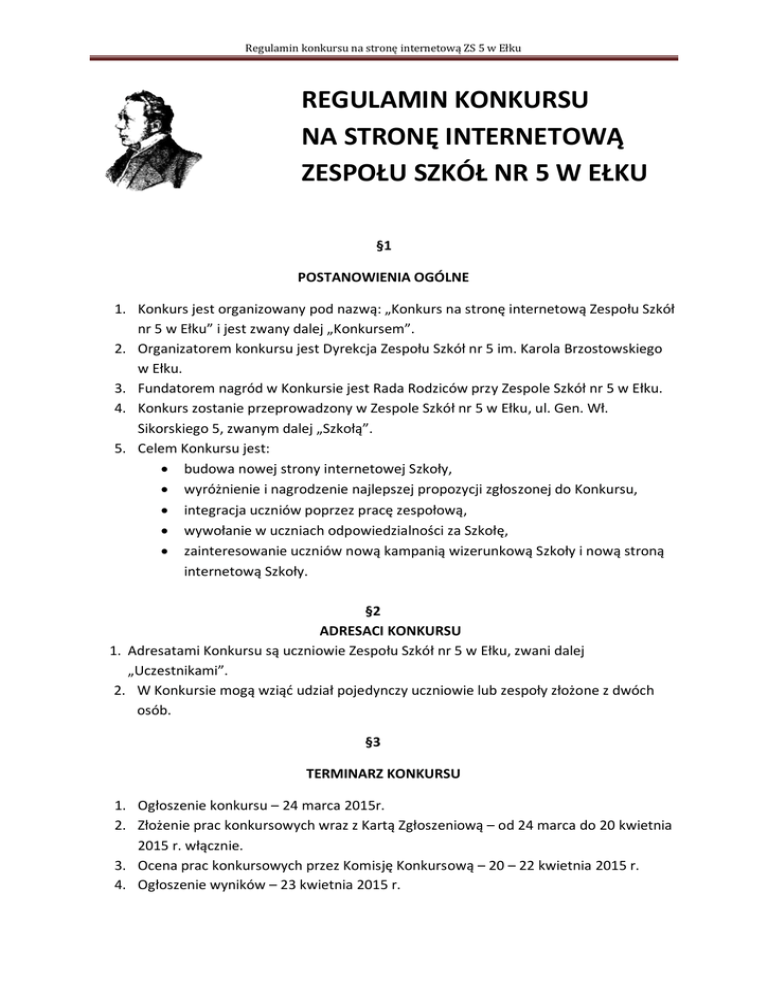 Regulamin konkursu na stronę internetową ZS 5 w Ełku REGULAMIN KONKURSU NA STRONĘ INTERNETOWĄ ZESPOŁU SZKÓŁ NR 5 W EŁKU §1 POSTANOWIENIA OGÓLNE 1. Konkurs jest organizowany pod nazwą: „Konkurs na stronę internetową Zespołu Szkół nr 5 w Ełku” i jest zwany dalej „Konkursem”. 2. Organizatorem konkursu jest Dyrekcja Zespołu Szkół nr 5 im. Karola Brzostowskiego w Ełku. 3. Fundatorem nagród w Konkursie jest Rada Rodziców przy Zespole Szkół nr 5 w Ełku. 4. Konkurs zostanie przeprowadzony w Zespole Szkół nr 5 w Ełku, ul. Gen. Wł. Sikorskiego 5, zwanym dalej „Szkołą”. 5. Celem Konkursu jest: budowa nowej strony internetowej Szkoły, wyróżnienie i nagrodzenie najlepszej propozycji zgłoszonej do Konkursu, integracja uczniów poprzez pracę zespołową, wywołanie w uczniach odpowiedzialności za Szkołę, zainteresowanie uczniów nową kampanią wizerunkową Szkoły i nową stroną internetową Szkoły. §2 ADRESACI KONKURSU 1. Adresatami Konkursu są uczniowie Zespołu Szkół nr 5 w Ełku, zwani dalej „Uczestnikami”. 2. W Konkursie mogą wziąć udział pojedynczy uczniowie lub zespoły złożone z dwóch osób. §3 TERMINARZ KONKURSU 1. Ogłoszenie konkursu – 24 marca 2015r. 2. Złożenie prac konkursowych wraz z Kartą Zgłoszeniową – od 24 marca do 20 kwietnia 2015 r. włącznie. 3. Ocena prac konkursowych przez Komisję Konkursową – 20 – 22 kwietnia 2015 r. 4. Ogłoszenie wyników – 23 kwietnia 2015 r. Regulamin konkursu na stronę internetową ZS 5 w Ełku §4 ZASADY KONKURSU 1. W Konkursie mogą wziąć udział prace indywidualne lub zespołowe. 2. Zadaniem Uczestników jest opracowanie i budowa szkolnej strony internetowej. 3. Strona internetowa Szkoły powinna zawierać: a) kolory: szary, czarny, biały i pomarańczowy (użycie ostatniego koloru jest warunkiem koniecznym). Kolorystyka powinna nawiązywać do plakatu promującego szkołę. Plakat do pobrania TUTAJ, b) hasło szkoły: EKONOMIAK – drzwi do cyfrowego świata, c) dopuszczalne jest wykorzystanie CMS (systemy zarządzania treścią), takie jak Wordpress, Joomla, itp. zawierające panel administracyjny, w którym administrator będzie mógł dodawać treści, ogłoszenia, zdjęcia, itp. lub stworzenie strony z wykorzystaniem języków HTML, CSS, Java Script, PHP lub innych, d) elementy obowiązkowe, takie jak: nazwa Szkoły, dane adresowe, logo Szkoły, zakładki tematyczne, itp., e) strona konkursowa musi być opublikowana na dowolnym darmowym hostingu, którego adres należy zawrzeć na Karcie Zgłoszeniowej, 4. Treści merytoryczne zawarte w pracy konkursowej muszą być opracowane w języku polskim. 5. Elementy graficzne, redakcyjne i programistyczne powinny być autorskie, chyba że sposób wykorzystania ich z innych źródeł pozostaje w zgodzie z Ustawą z dnia 4 lutego 1994 r. o prawie autorskim i prawach pokrewnych, z późniejszymi zmianami. 6. Organizatorzy zastrzegają sobie prawo do wykorzystania rozwiązań zawartych w pracach konkursowych. §5 UCZESTNICTWO W KONKURSIE 1. Uczestnikiem Konkursu może być każdy uczeń Zespołu Szkół nr 5 w Ełku. 2. Uczestnicy mogą zgłosić do Konkursu prace wykonane samodzielnie lub w dwuosobowym zespole. 3. Warunkiem uczestnictwa w Konkursie jest dostarczenie w terminie do 20 kwietnia 2015 r. Karty Zgłoszeniowej (do pobrania TUTAJ lub w sekretariacie) do sekretariatu Szkoły. 4. Wszyscy zgłaszający się do Konkursu Uczestnicy są zobowiązani do przestrzegania niniejszego Regulaminu. 5. Autor/autorzy zwycięskiej pracy zobowiązani są do współpracy z Organizatorem w celu dostosowania strony do potrzeb szkolnej witryny internetowej. Regulamin konkursu na stronę internetową ZS 5 w Ełku 1. 2. 3. 4. 5. §6 OCENA PRAC KONKURSOWYCH Prace konkursowe będą oceniane przez Komisję Konkursową powołaną przez Dyrekcję Zespołu Szkół nr 5 w Ełku. Komisja Konkursowa jest zobowiązana do zapoznania się ze wszystkimi dostarczonymi na Konkurs pracami i ocenienia ich. Ocenie będą podlegać: a) szata graficzna (estetyka, przejrzystość, czytelność, oryginalność), b) panel administracyjny (możliwość wprowadzania zmian, konfiguracja strony), c) obsługa (nawigacja, funkcjonalność komunikacji z użytkownikiem, złożoność wykorzystanych mechanizmów i aplikacji), d) treść (struktura organizacji i informacji, kompleksowość i oryginalność ujęcia tematu, poprawność językowa, itp.). Komisja Konkursowa przyzna trzy pierwsze miejsca. Decyzja Komisji Konkursowej jest ostateczna i nie przysługuje od niej odwołanie. §7 NAGRODY 1. Zdobywcy trzech pierwszych miejsc otrzymają nagrody rzeczowe. 2. Nagrodą z zajęcia I miejsca będzie równowartość 200 zł oraz możliwość umieszczenia jej we własnym portfolio. 3. Zwycięska praca zachowuje informacje o autorze/autorach za jego/ich pisemną zgodą. 4. Wszyscy Uczestnicy otrzymają dyplomy uczestnictwa w konkursie. 1. 2. 3. 4. §8 POSTANOWIENIA KOŃCOWE Niewypełnienie lub złamanie przez Uczestnika któregokolwiek z wymogów niniejszego Regulaminu stanowi podstawę do wykluczenia z udziału w Konkursie. Decyzję o wykluczeniu podejmie Komisja Konkursowa. Odpowiedzi na pytania związane z Konkursem udziela Dyrekcja Zespołu Szkół nr 5 w Ełku. W kwestiach spornych nieobjętych tym Regulaminem głos decydujący ma Komisja Konkursowa. Informacje o przebiegu Konkursu będą publikowane na stronie internetowej Szkoły.
