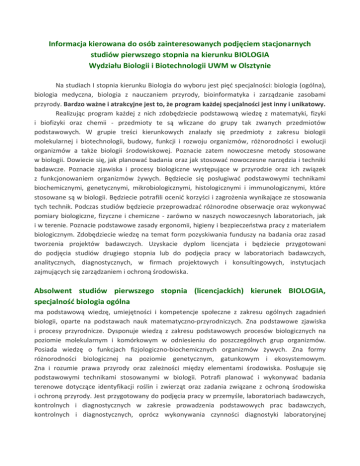 Informacja kierowana do osób zainteresowanych podjęciem stacjonarnych studiów pierwszego stopnia na kierunku BIOLOGIA Wydziału Biologii i Biotechnologii UWM w Olsztynie Na studiach I stopnia kierunku Biologia do wyboru jest pięć specjalności: biologia (ogólna), biologia medyczna, biologia z nauczaniem przyrody, bioinformatyka i zarządzanie zasobami przyrody. Bardzo ważne i atrakcyjne jest to, że program każdej specjalności jest inny i unikatowy. Realizując program każdej z nich zdobędziecie podstawową wiedzę z matematyki, fizyki i biofizyki oraz chemii - przedmioty te są wliczane do grupy tak zwanych przedmiotów podstawowych. W grupie treści kierunkowych znalazły się przedmioty z zakresu biologii molekularnej i biotechnologii, budowy, funkcji i rozwoju organizmów, różnorodności i ewolucji organizmów a także biologii środowiskowej. Poznacie zatem nowoczesne metody stosowane w biologii. Dowiecie się, jak planować badania oraz jak stosować nowoczesne narzędzia i techniki badawcze. Poznacie zjawiska i procesy biologiczne występujące w przyrodzie oraz ich związek z funkcjonowaniem organizmów żywych. Będziecie się posługiwać podstawowymi technikami biochemicznymi, genetycznymi, mikrobiologicznymi, histologicznymi i immunologicznymi, które stosowane są w biologii. Będziecie potrafili ocenić korzyści i zagrożenia wynikające ze stosowania tych technik. Podczas studiów będziecie przeprowadzać różnorodne obserwacje oraz wykonywać pomiary biologiczne, fizyczne i chemiczne - zarówno w naszych nowoczesnych laboratoriach, jak i w terenie. Poznacie podstawowe zasady ergonomii, higieny i bezpieczeństwa pracy z materiałem biologicznym. Zdobędziecie wiedzę na temat form pozyskiwania funduszy na badania oraz zasad tworzenia projektów badawczych. Uzyskacie dyplom licencjata i będziecie przygotowani do podjęcia studiów drugiego stopnia lub do podjęcia pracy w laboratoriach badawczych, analitycznych, diagnostycznych, w firmach projektowych i konsultingowych, instytucjach zajmujących się zarządzaniem i ochroną środowiska. Absolwent studiów pierwszego stopnia (licencjackich) kierunek BIOLOGIA, specjalność biologia ogólna ma podstawową wiedzę, umiejętności i kompetencje społeczne z zakresu ogólnych zagadnień biologii, oparte na podstawach nauk matematyczno-przyrodniczych. Zna podstawowe zjawiska i procesy przyrodnicze. Dysponuje wiedzą z zakresu podstawowych procesów biologicznych na poziomie molekularnym i komórkowym w odniesieniu do poszczególnych grup organizmów. Posiada wiedzę o funkcjach fizjologiczno-biochemicznych organizmów żywych. Zna formy różnorodności biologicznej na poziomie genetycznym, gatunkowym i ekosystemowym. Zna i rozumie prawa przyrody oraz zależności między elementami środowiska. Posługuje się podstawowymi technikami stosowanymi w biologii. Potrafi planować i wykonywać badania terenowe dotyczące identyfikacji roślin i zwierząt oraz zadania związane z ochroną środowiska i ochroną przyrody. Jest przygotowany do podjęcia pracy w przemyśle, laboratoriach badawczych, kontrolnych i diagnostycznych w zakresie prowadzenia podstawowych prac badawczych, kontrolnych i diagnostycznych, oprócz wykonywania czynności diagnostyki laboratoryjnej w rozumieniu Ustawy o diagnostyce laboratoryjnej. Jest przygotowany do podjęcia studiów drugiego stopnia na kierunku biologia lub na kierunkach pokrewnych. Szczegółowe plany studiów, opracowane dla poszczególnych specjalności, znajdują się na stronie internetowej Wydziału Biologii i Biotechnologii w zakładce Rekrutacja i oferta kształcenia