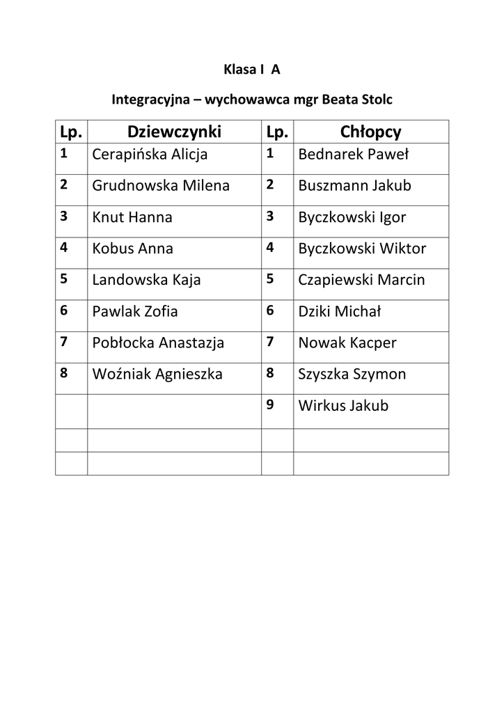 Klasa I A Integracyjna – wychowawca mgr Beata Stolc Lp. Dziewczynki Lp. Chłopcy 1 Cerapińska Alicja 1 Bednarek Paweł 2 Grudnowska Milena 2 Buszmann Jakub 3 Knut Hanna 3 Byczkowski Igor 4 Kobus Anna 4 Byczkowski Wiktor 5 Landowska Kaja 5 Czapiewski Marcin 6 Pawlak Zofia 6 Dziki Michał 7 Pobłocka Anastazja 7 Nowak Kacper 8 Woźniak Agnieszka 8 Szyszka Szymon 9 Wirkus Jakub Klasa I B - (sześciolatki) Wychowawca – mgr Urszula Sobczak Lp. Dziewczynki 1 Ciżmowska Gabriela Lp. Chłopcy 1 Fenkanin Borys Jan Jaworski Radosław Benedykt 2 Dybka Aleksandra 2 3 Fabiszewska Julia 3 Korobowicz Michał Zygmunt Kuczkowski Paweł Mateusz 4 Korobowicz Maja 4 5 Litwińska Noemi 5 Kuźmin Jakub Artur 6 Lubetzka Agata 6 Prach Wiktor 7 Pawelczyk Natalia 7 Szwarc Ksawier 8 Prądzińska Martyna Lena 8 Tarasiewicz Sebastian 9 Roda Nadia 9 Wnuk – Lipiński Krzysztof 10 Rychter Inga 11 Szczęśniak Aleksandra 12 Ziembowska Ida 10 Zadworny Antoni Klasa I C (sześciolatki) Wychowawca – Marzena Peplińska Dziewczynki 1 Borowska Anna Magdalena Chłopcy 1 Flis Oskar Jan 4 Kalisz Martyna 5 Kwasigroch Maja 2 Jutrzenka Trzebiatowski Bartosz 3 Kiżewski Jan 4 Lewandowski Mateusz 5 Łapiński Aleksander Piotr 6 Mańczak Nadia 6 Marciniak Damian 7 Metel Lena Karolina 7 Sałak Tymon Jan 8 Pawlak Julia Marta 9 Pela Milena Krystyna 8 Treder Aleksander Ryszard 9 Treder Dawid Roman 2 Brzeska Julia Aniela 3 Fligiel Łucja 10 Treder Magdalena 11 Treder Marta 12 Truskolawska Marta 13 Tyborska Martyna 10 Turzyński Kacper Klasa I D (sześciolatki) Wychowawca – mgr Joanna Wrzesińska Dziewczynki Chłopcy 1 Bazal Weronika 1 Bartusz Maksymilian 2 Duda Hanna 2 Domińczak Jakub 3 Harasiuk Patrycja 3 Grabowski Mateusz 4 Hering Paulina Joanna 4 Klonczyński Norbert 5 Kirdzik Amelia 5 Kosznik Jan 6 Sikorska Zofia 6 Krzemiński Dominik 7 Smolarek Victoria 7 Pieńkowski Igor 8 Stolc Wiktoria Agata 8 Tyborczyk Sebastian 9 Szymańska Beata 9 10 Wanta Antonina 10 Zientarski Igor 11 Wantoch Rekowska Weronika 12 Waśkowiak Julia Martyna Waśko Piotr 11 Glazik Aleksander Klasa I E (sześciolatki) Wychowawca – mgr Irena Zahoroda Dziewczynki Chłopcy 1 Bartczak Julia 1 Bożek Aleksander 2 Gliszczyńska Paulina 2 Garski Piotr 3 Gralak Aleksandra 3 Itrich Hubert 4 Liszewska Oliwa 4 Komkowski Juliusz 5 Matuszyńska Agata 5 Kudlik Jakub 6 6 Lass Robert Riopka Edyta 7 Stępnakowska Hanna 7 Sawicki Maksymilian 8 Stunża Hanna 8 Turowski Rafał 9 Sylka Róża 9 Wroński Kacper 10 Trocha Roksana Małgorzata 11 Wardach Amelia 12 Wardach Magdalena 13 Wnuk – Lipińska Hanna 10 Żebrowski Karol Klasa I F (siedmiolatki) Wychowawca – wolny wakat Lp Lp 1 Dziewczynki Chac Anita Magdalena 1 Chłopcy Chadacz Fabian 2 Chrzan Adela 2 Fijałkowski Witold Tomasz 3 Flis Aleksandra 3 Grabowski Filip 4 Kalkowska Julia Weronika 4 Kamiński Igor Aleksander 5 Kaszewska Marta 5 Mielewczyk Oskar 6 Kowalska Natalia Magdalena 6 Pobłocki Radosław 7 Nosek Laura 7 Popowicz Wojciech 8 Okroy Anastazja 8 Sabina Witold 9 Rzeszutek Kinga Sonia 9 Soldatke Gracjan Kazimierz 10 Stoltmann Małgorzata 10 Stenka Kacper 11 Treder Bartosz Radosław 12 Wiktorowicz Wiktor Witold 13 Winiecki Jastin Dominik 14 Wnuk – Lipiński Jakub Klasa I G (siedmiolatki) Wychowawca – mgr Marzena Lemańczyk Lp. Dziewczynki 1 Bargańska Lena Anna Chłopcy 1 Czapiewski Igor Robert 2 Gostkowska Zuzanna 2 Dakiniewicz Patryk 3 Klinkosz Patrycja 3 Dąbrowski Adrian 4 Kloskowska Nadia 4 Dębski Paweł Jan 5 Maszk Justyna 5 6 Mohr Sara Anna 6 Kaiser Jakub Jerzy 7 Nowakowska Maja 7 Kauczoch Mateusz Jankowski Jakub Przemysław 8 Prądzinska Maja Natalia 8 Knuth Maksymilian 9 Przewłocka Julia 9 Kuźnicki Jakub Adam 10 Treder Aleksandra Anna 10 Liszewski Aleksander 11 Misiura Jan 12 Sikora Łukasz 13 Sikorski Radosław 14 Treder Krzysztof Wojciech Klasa I H ( siedmiolatki ) Wychowawca – wolny wakat Lp. Dziewczynki Lp. Chłopcy 1 Berbeć Nadia 1 Cyra Alan Paweł 2 Bielecka Maja Danuta 2 Cyrzan Konrad Piotr 3 Boniecka Justyna 3 Daszkiewicz Dominik Łukasz 4 Ciżmowska – Kozłowska Katarzyna 4 Kaszewski Bartłomiej Kossak Główczewski Marek Szymon 5 Jenczyk Lena Aleksandra 5 6 Płotka Aleksandra 6 Kreczmer Oskar Adam 7 Pupka – Lipińska Magdalena 7 Łojek Miłosz Marcin 8 Ruszer Agata Anna 8 Mohr Wiktor Andrzej 9 Zwara Magdalena Anna 9 Orlikowski Marek Piotr 10 Paczkowski Witold Bartosz 11 Sieradzki Michał 12 Skowronek Mateusz 13 Soja Błażej 14 Stolc Artur Patryk
