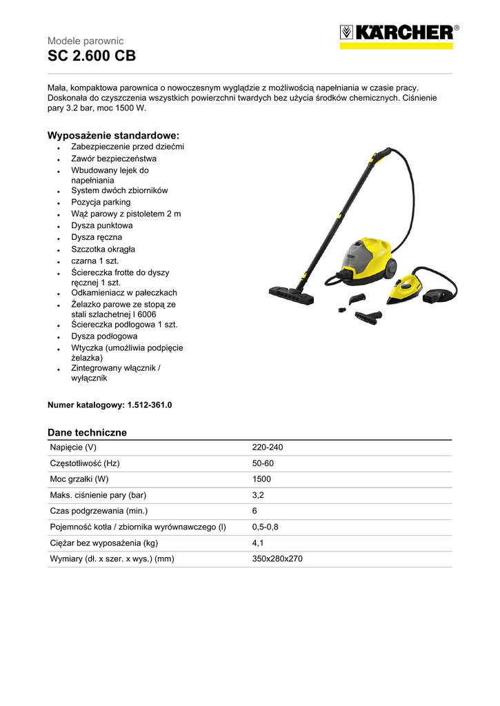 Modele parownic SC 2.600 CB Mała, kompaktowa parownica o nowoczesnym wyglądzie z możliwością napełniania w czasie pracy. Doskonała do czyszczenia wszystkich powierzchni twardych bez użycia środków chemicznych. Ciśnienie pary 3.2 bar, moc 1500 W. Wyposażenie standardowe: • • • • • • • • • • • • • • • • • Zabezpieczenie przed dziećmi Zawór bezpieczeństwa Wbudowany lejek do napełniania System dwóch zbiorników Pozycja parking Wąż parowy z pistoletem 2 m Dysza punktowa Dysza ręczna Szczotka okrągła czarna 1 szt. Ściereczka frotte do dyszy ręcznej 1 szt. Odkamieniacz w pałeczkach Żelazko parowe ze stopą ze stali szlachetnej I 6006 Ściereczka podłogowa 1 szt. Dysza podłogowa Wtyczka (umożliwia podpięcie żelazka) Zintegrowany włącznik / wyłącznik Numer katalogowy: 1.512-361.0 Dane techniczne Napięcie (V) 220-240 Częstotliwość (Hz) 50-60 Moc grzałki (W) 1500 Maks. ciśnienie pary (bar) 3,2 Czas podgrzewania (min.) 6 Pojemność kotła / zbiornika wyrównawczego (l) 0,5-0,8 Ciężar bez wyposażenia (kg) 4,1 Wymiary (dł. x szer. x wys.) (mm) 350x280x270 Szczegóły Opis Parownica S.C. 2.600 to urządzenie nowej generacji. Dzięki zdejmowanemu zbiornikowi na wodę, może stale wytwarzać parę do ekologicznego czyszczenia bez użycia środków chemicznych. Urządzenie jest gotowe do pracy po 6 minutach nagrzewania. Dodatkowo parownica może być użyta również do prasowania. Posiada nowoczesny wygląd, jest łatwa w użyciu i wydajna energetycznie. Zbiornik o pojemności 0,8 litra może być napełniany w czasie pracy, bez potrzeby wyłączania urządzenia. Ciśnienie pary 3,2 bar oraz moc 1500 W gwarantują świetny efekt czyszczenia. Osady wapienne, tłuszcz i inne uporczywe zabrudzenia w łazience, kuchni i innych pomieszczeniach zostaną w łatwy sposób usunięte w sposób bezpieczny dla środowiska. Parownica SC 2.600 C czyści okna, kabiny prysznicowe, szkło, krany, płytki, fugi oraz płyty grzewcze. Kompaktowa parownica Kärcher wyróznia się następującymi cechami: czytelne kontrolki, zdejmowany zbiornik na wodę, uchwyty na wyposażenie na urządzeniu, pozycja parking dla dyszy podłogowej, duże koła ułatwiające transport, schowek na przewód elektryczny oraz gniazdo do podłączenia żelazka parowego (żelazko zawarte w zestawie) umożliwiającego 50% krótszy czas prasowania., zdejmowany zbiornik na wodę, uchwyty na wyposażenie na urządzeniu, pozycja parking dla dyszy podłogowej, duże koła ułatwiające transport, schowek na przewód elektryczny oraz gniazdo do podłączenia żelazka parowego (żelazko zawarte w zestawie) umożliwiającego 50% krótszy czas prasowania., zdejmowany zbiornik na wodę, uchwyty na wyposażenie na urządzeniu, pozycja parking dla dyszy podłogowej, duże koła ułatwiające transport, schowek na przewód elektryczny oraz gniazdo do podłączenia żelazka parowego (żelazko zawarte w zestawie) umożliwiającego 50% krótszy czas prasowania. Zastosowanie • • • • • • • • • Czyszczenie podłóg Krany Umywalka Płytki Okna, lustra Okap Płyta kuchenna Prasowanie Cechy i zalety Regulacja ilości pary na rękojeści. Ilość pary regulowana w zależności od powierzchni i stopnia zabrudzenia 4 metrowy przewód elektryczny Duży promień działania: czyszczenie dużych pomieszczeń nie jest problemem Gniazdo żelazka parowego + żelazko zawarte w zestawie Parownica może być również używana do prasowania - czas prasowania krótszy o połowę Uchwyty na rury Praktyczne i zajmujące mało miejsca przechowywanie rur Ergonomiczny pistolet oraz uchwyt do przenoszenia Największa wygoda i wysoka ergonomia czyszczenia Czytelne kontrolki Intuicyjna obsluga Schowek na przewód elektryczny na obudowie Oszczędność miejsca przy przechowywaniu przewodu Blokada pistoletu parowego Ochrona przed niewłaściwym użyciem np. przez dzieci Krótki czas nagrzewania (6 minut) Krótki czas oczekiwania: parownica jest gotowa do użycia po 6 minutach Włącznik na urządzeniu Łatwe wyłączanie urządzenia Opcjonalne wyposażenie Deski do prasowania AB 1000 - deska do prasowania Deska do prasowania z funkcją nadmuchu, odsysania pary i 6 stopniową regulacją wysokości. Numer katalogowy 2.884-933.0 Dysze Dysza do detali Doskonała do czyszczenia szczelin, rogów, krawędzi i innych trudnodostępnych miejsc. W połączeniu z szczotką okrągłą daje wiele zastosowań. Numer katalogowy 2.884-281.0 Dysza ręczna Dysza ręczna ze szczeciną do czyszczenia niewielkich powierzchni np. kabiny prysznicowe, płytki ścienne itp. Przeznaczona do pracy z lub bez powłoczki z mikrofibry. Numer katalogowy 2.884-280.0 Dysza podłogowa Nowa, innowacyjna dysza podłogowa zapewniająca lepszy efekt czyszczenia dzięki lepszemu wykorzystaniu pary i większej powierzchni czyszczącej. Numer katalogowy 2.885-142.0 Przedłużka z dyszą Power Dysza Power z przedłużką znacznie zwiększa siłę czyszczenia dyszy do detali. Doskonała do łatwego, ekologicznego czyszczenia trudnodostępnych miejsc np. rogów. Numer katalogowy 2.884-282.0 Dysza do pielęgnacji tekstyliów Dysza do pielęgnacji tekstyliów odświeża i usuwa zagięcia ubrań i tekstyliów, efektywnie usuwając nieprzyjemne zapachy. Posiada warstwę usuwającą meszek. Numer katalogowy 4.130-390.0 Dysza do okien Dysza do okien dokładnie czyści szkło, okna oraz lustra przy użyciu parownicy. Numer katalogowy 4.130-115.0 Gumowa listwa do dyszy do okien Gumowa listwa do dyszy do okien dla parownic. Numer katalogowy 6.273-140.0 Szeroka dysza podłogowa, 315 mm Szeroka dysza podłogowa (315 mm) z dodatkową szczeciną zapewnia szybkie i łatwe czyszczenie podłóg z płytek, kamienia i linoleum. Przeznaczona do użycia z ściereczką podłogową. Numer katalogowy 2.884-278.0 Pokrycia desek do prasowania Powłoka na deskę do prasowania Bawełniana powłoka na deskę do prasowania z piankową podszewką gwarantuje gładką powierz