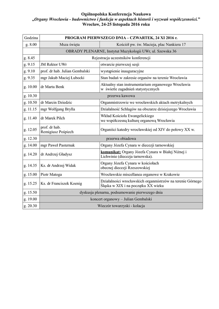 Ogólnopolska Konferencja Naukowa „Organy Wrocławia - budownictwo i funkcja w aspektach historii i wyzwań współczesności.” Wrocław, 24-25 listopada 2016 roku Godzina g. 8.00 PROGRAM PIERWSZEGO DNIA – CZWARTEK, 24 XI 2016 r. Msza święta Kościół pw. św. Macieja, plac Nankiera 17 OBRADY PLENARNE, Instytut Muzykologii UWr, ul. Szewska 36 g. 8.45 Rejestracja uczestników konferencji g. 9.15 JM Rektor UWr otwarcie pierwszej sesji g. 9.10 prof. dr hab. Julian Gembalski wystąpienie inauguracyjne g. 9.35 mgr Jakub Maciej Łubocki Stan badań w zakresie organów na terenie Wrocławia Aktualny stan instrumentarium organowego Wrocławia w świetle zagadnień statystycznych g. 10.00 dr Marta Benk g. 10.30 przerwa kawowa g. 10.50 dr Marcin Dziedzic Organmistrzowie we wrocławskich aktach metrykalnych g. 11.15 mgr Wolfgang Brylla Działalność Schlagów na obszarze dzisiejszego Wrocławia g. 11.40 dr Marek Pilch Wkład Kościoła Ewangelickiego we współczesną kulturę organową Wrocławia g. 12.05 prof. dr hab. Remigiusz Pośpiech Organiści katedry wrocławskiej od XIV do połowy XX w. g. 12.30 przerwa obiadowa g. 14.00 mgr Paweł Pasternak Organy Józefa Cynara w diecezji tarnowskiej g. 14.20 dr Andrzej Gładysz komunikat: Organy Józefa Cynara w Białej Niżnej i Lichwinie (diecezja tarnowska). g. 14.35 Ks. dr Andrzej Widak Organy Józefa Cynara w kościołach obecnej diecezji Rzeszowskiej g. 15.00 Piotr Matoga Wrocławskie miscellanea organowe w Krakowie g. 15.25 Ks. dr Franciszek Koenig Działalności wrocławskich organmistrzów na terenie Górnego Śląska w XIX i na początku XX wieku g. 15.50 dyskusja plenarna, podsumowanie pierwszego dnia g. 19.00 koncert organowy – Julian Gembalski g. 20.30 Wieczór towarzyski - kolacja Ogólnopolska Konferencja Naukowa „Organy Wrocławia - budownictwo i funkcja w aspektach historii i wyzwań współczesności.” Wrocław, 24-25 listopada 2016 roku Godzina g. 8.00 PROGRAM DRUGIEGO DNIA – PIĄTEK , 25 XI 2016 r. Msza święta Kościół pw. św. Macieja, plac Nankiera 17 OBRADY PLENARNE, Instytut Muzykologii UWr, ul. Szewska 36 g. 09.30 Abp Metropolita Wrocławski otwarcie drugiej sesji g. 09.45 dr Andrzej Prasał Wrocławski olbrzym - organy Hali Stulecia g. 10.10 mgr Wolfgang Brylla komunikat: Organy dla wrocławskiej filharmonii g. 10.30 mgr Adrian Rak Organy w kościele Uniwersyteckim we Wrocławiu Ks. dr Piotr Dębski komunikat dot. organów w kościele Uniwersyteckim we Wrocławiu g. 10.55 g. 11.10 przerwa kawowa g. 11.30 Ks. dr Piotr Dębski Organy firmy Gebrueder Rieger w kościele pw. Świętej Rodziny we Wrocławiu g. 11.55 dr Tomasz Głuchowski Organy kolegiaty Krzyża Świętego we Wrocławiu na przestrzeni dziejów. g. 12.20 mgr Tomasz Kmita-Skarsgård Organy luterańskiego kościoła Świętego Krzysztofa we Wrocławiu – było, jest, będzie g. 12.50 przerwa obiadowa g. 14.00 dr Dariusz Galewski Dekoracja i wymowa ideowa barokowych prospektów organowych we Wrocławiu g. 14.25 mgr Ewa Grochowska Twórcy dekoracji malarsko-rzeźbiarskiej organów A. H. Caspariniego w kościele św. Elżbiety we Wrocławiu g. 14.50 dr Krzysztof Urbaniak Koncepcja intonacji organów z warsztatów Eugenio i Adama Horatio Casparinich w świetle przekazów źródłowych g. 15.15 dr Bogdan Andrzej Tabisz Miscellanea muzyczne Karla Friedricha Krigera XVIII/XIX w. g. 15.40 dyskusja plenarna, podsumowanie konferencji g. 18.00 Prezentacja organów Ewangelickiego Instytutu Muzyki Sakralnej we Wrocławiu ul. Wejherowska 28.