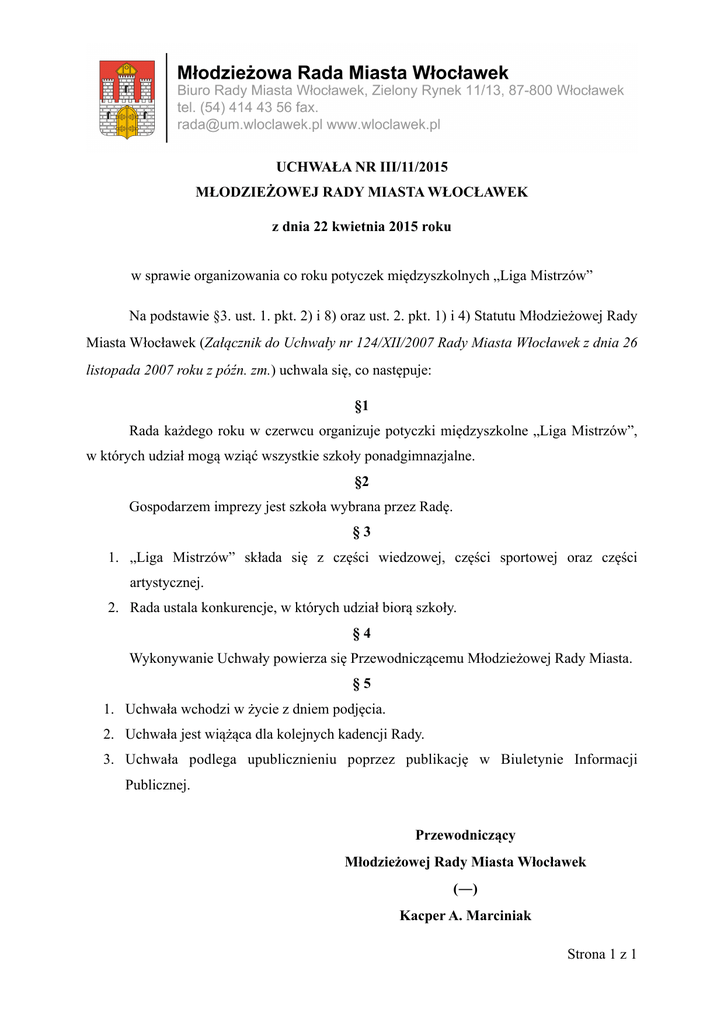 ! UCHWAŁA NR III/11/2015 MŁODZIEŻOWEJ RADY MIASTA WŁOCŁAWEK z dnia 22 kwietnia 2015 roku w sprawie organizowania co roku potyczek międzyszkolnych „Liga Mistrzów” Na podstawie §3. ust. 1. pkt. 2) i 8) oraz ust. 2. pkt. 1) i 4) Statutu Młodzieżowej Rady Miasta Włocławek (Załącznik do Uchwały nr 124/XII/2007 Rady Miasta Włocławek z dnia 26 listopada 2007 roku z późn. zm.) uchwala się, co następuje: §1 Rada każdego roku w czerwcu organizuje potyczki międzyszkolne „Liga Mistrzów”, w których udział mogą wziąć wszystkie szkoły ponadgimnazjalne. §2 Gospodarzem imprezy jest szkoła wybrana przez Radę. §3 1. „Liga Mistrzów” składa się z części wiedzowej, części sportowej oraz części artystycznej. 2. Rada ustala konkurencje, w których udział biorą szkoły. §4 Wykonywanie Uchwały powierza się Przewodniczącemu Młodzieżowej Rady Miasta. §5 1. Uchwała wchodzi w życie z dniem podjęcia. 2. Uchwała jest wiążąca dla kolejnych kadencji Rady. 3. Uchwała podlega upublicznieniu poprzez publikację w Biuletynie Informacji Publicznej. Przewodniczący Młodzieżowej Rady Miasta Włocławek (―) Kacper A. Marciniak Strona 1' z 1'