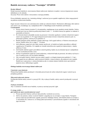 Budzik sterowany radiowo "Nostalgia" 10740520 Drodzy Klienci! Dzięki naszemu budzikowi, sterowanemu falami radiowymi, będziecie wszędzie i zawsze dysponować czasem dokładnym co do sekundy. Życzymy Wam wiele radości z korzystania z naszego produktu. Proszę dokładnie zapoznać się z instrukcją obsługi i zachować ją na wypadek wątpliwości, które mogą pojawić się podczas użytkowania budzika. Zegar zaczyna wskazywać czas automatycznie, krótko po założeniu baterii. Mechanizm odbierający fale radiowe sam ustawi czas, kontaktując się z nadajnikiem DCF w Mainflingen (koło Frankfurtu nad Menem). Uruchomienie • Proszę włożyć baterię (rozmiar C), do pojemnika, znajdującego się po spodniej stronie budzika. Należy uważać przy tym na właściwą polaryzację baterii (znak + i – na baterii muszą się zgadzać ze znakami w pojemniku na baterie). • Po włożeniu baterii sekundnik zacznie się poruszać w kierunku zgodnym z ruchem wskazówek zegara i ustawi się na godzinie 12. W ciągu kolejnych trzech minut również wskazówka minutowa jak i ta, pokazująca godziny, ustawią się na godzinie 12. • Budzik podejmie próbę odebrania sygnału radiowego. Jeśli sygnał radiowy w Państwa otoczeniu jest mocny, budzik ustawi się w ciągu 3 – 10 minut. • Jeśli odbierany sygnał jest zbyt słaby istnieje możliwość, że budzik nie będzie prawidłowo odbierał sygnału przez 24 godziny. Ze względu na warunki atmosferyczne sygnał jest najmocniejszy między północą a 4 rano. • Jeśli budzik odebrał sygnał i prawidłowo ustawił godzinę, będzie się raz dziennie łączył z nadajnikiem w celu ewentualnej korekty czasu. • Jeśli po 24 godzinach sygnał nie został znaleziony, wskazówki będą się poruszać, ale należy się liczyć z tym, że pokazywany czas nie będzie dokładny. • Aby oszczędzić baterie, budzik zaczyna szukać sygnał o co drugiej nieparzystej godzinie (1, 3 itp.). • Jeśli sygnał nie jest odbierany, należy postawić budzik w innym miejscu, aby poprawić moc sygnału. Budzik jest wyposażony w antenę kierunkową tak, że zmiana miejsca budzika może spowodować poprawę mocy odbieranego sygnału. Obsługa budzika sterowanego falami radiowymi Ustawienie czasu budzenia Wskazówkę budzika należy przekręcić w kierunku przeciwnym do ruchu wskazówek zegara i ustawić ją na pożądanej godzinie. Włączanie/wyłączanie alarmu Przełącznik alarmu należy ustawić w pozycji ON. Aby wyłączyć budzik, należy ustawić przełącznik w pozycji OFF. Funkcja oświetlenia Aby w ciemności oświetlić tarcze budzika, wystarczy nacisnąć przycisk Light. Co mogę zrobić….. gdy budzik nie może zsynchronizować czasu? • Proszę sprawdzić baterię i jeśli jest taka potrzeba, wymienić ja na nową. • Jeśli to nie pomoże, należy wystawić budzik w pogodną noc na zewnątrz i wyjąc baterie. Następnie proszę rozpocząć poszukiwanie sygnału, ponownie wkładając baterię. Jeśli budzik działa na zewnątrz a w mieszkaniu nie, oznacza to, że istnieją jakieś przeszkody w przechodzeniu sygnału w mieszkaniu lub jego otoczeniu. 1 aby poprawić odbiór sygnału? • Jeśli korzystacie Państwo z budzika w budynku z betonowymi lub metalowymi ścianami, jakość odbioru sygnału można poprawić stawiając budzik przy oknie, z odsłoniętymi zasłonami bądź żaluzjami. • Nie należy stawiać budzika w pobliżu urządzeń elektronicznych, takich jak telewizor, kuchenka mikrofalowa, głośniki, komputer lub faks. • Odbiór sygnału może być zakłócony przez wiele czynników naturalnych i sztucznych. Np. przez wysokie budynki, lotnisko, góry lub doliny, urządzenia elektryczne, jak np. kable elektryczne do prądu o wysokim napięciu, sygnalizację świetlną, neony. Do zakłócenia odbioru sygnału mogą też doprowadzić złe warunki pogodowe. Konserwacja i pielęgnacja • Baterię należy wymieniać raz na rok, lub wtedy, gdy odbiór sygnału radiowego jest słaby lub budzik w ogóle nie odbiera sygnału. • Budzik należy przechowywać w suchym i czystym miejscu. Do odkurzania należy używać miękkiej szmatki. • Do czyszczenia budzika nie wolno używać żrących środków czyszczących i chemikaliów. • Jeśli budzik nie jest używanym należy zawsze wyjąć z niego baterię. Przycisk do manualnego wyszukiwania sygnału Proszę przytrzymać wciśnięty przycisk przez 5 sekund. Następnie proszę go zwolnić, aby wywołać natychmiastowe wyszukiwanie sygnału. Przycisk SET Aby ręcznie ustawić godzinę, proszę przytrzymać wciśnięty przycisk przez 5 sekund. Po ok. 5 sekundach wskazówki zaczną się poruszać. Proszę zwolnić przycisk, gdy tylko zostanie ustawiona właściwa godzina. Przycisk RESET Wyłącznie do użytku producenta. Nie należy przyciskać tego przycisku, ponieważ może to doprowadzić do uszkodzenia budzika. Pokrętło do ustawiania czasu budzenia Aby ustawić godzinę budzenia, należy je przekręcać w kierunku zgodnym z ruchem wskazówek zegara. Pojemnik na baterie Na 1 baterię 1,5 V, rozmiar C. Alarm włącz/wyłącz. 2