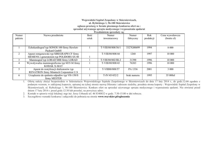 Numer pakietu 1 2 3 4 5 6 Nazwa przedmiotu Wojewódzki Szpital Zespolony w Skierniewicach, ul. Rybickiego 1, 96-100 Skierniewice ogłasza przetarg w formie pisemnego konkursu ofert na : sprzedaż używanego sprzętu medycznego i wyposażenia spalarni Przedmiotem sprzedaży są: Ilość Numer Numer Rok sztuk inwentarzowy fabryczny produkcji Cena wywoławcza (brutto zł) Echokardiograf typ SONOS 100 firmy Hewlett1 T-VIII/80/808/56/1 3327G00699 1994 8 000 Packard GmbH Aparat rentgenowski typ SIREGRAPH CF firmy T-VIII/80/808/44 1260 1997 10 000 SIEMENS z generatorem typ POLIDORS SX 80 1 Mammograf typ LORAD MIII firmy LORAD 1 T-VIII/80/802/III-2 31390 1996 10 000 Wywoływarka mammograficzna typ M35-M firmy 1 T-VIII/80/808/43 76383 1996 10 000 KODAK X-MAT Aparat do reutylizacji dializatorów typ 1 T-VIII80/808/57 PA 1336 2001 3 000 RENATRON firmy Minntech Corporation U.S Urządzenie do spalania odpadów typ VH-150/S 1 T-IV/45/452/2 brak numeru 1995 35 000zł firmy MESTER 1. Ofertę należy złożyć bezpośrednio w Sekretariacie Wojewódzkiego Szpitala Zespolonego w Skierniewicach do dnia 17 luty 2014 r., do godz.12:00 zgodnie z podanym wzorem, w zaklejonej kopercie, opisanej na tylnej stronie nazwą Oferenta i adresem siedziby, przednia strona koperty : Wojewódzki Szpital Zespolony w Skierniewicach, ul. Rybickiego 1, 96-100 Skierniewice. Konkurs ofert na sprzedaż używanego sprzętu medycznego i wyposażenia spalarni. Nie otwierać przed dniem 17 luty 2014 r. przed godz.12:30 lub przesłać, na powyższy adres. 2. Kontakt w sprawie wizji lokalnej: mgr inż. Jerzy Urbanek tel. 46 8340832 w godz. 7:30-15:00 w dni robocze. 3. Szczegółowe warunki konkursu i załączniki do pobrania na stronie www.wsz-skier.pl/ogloszenia