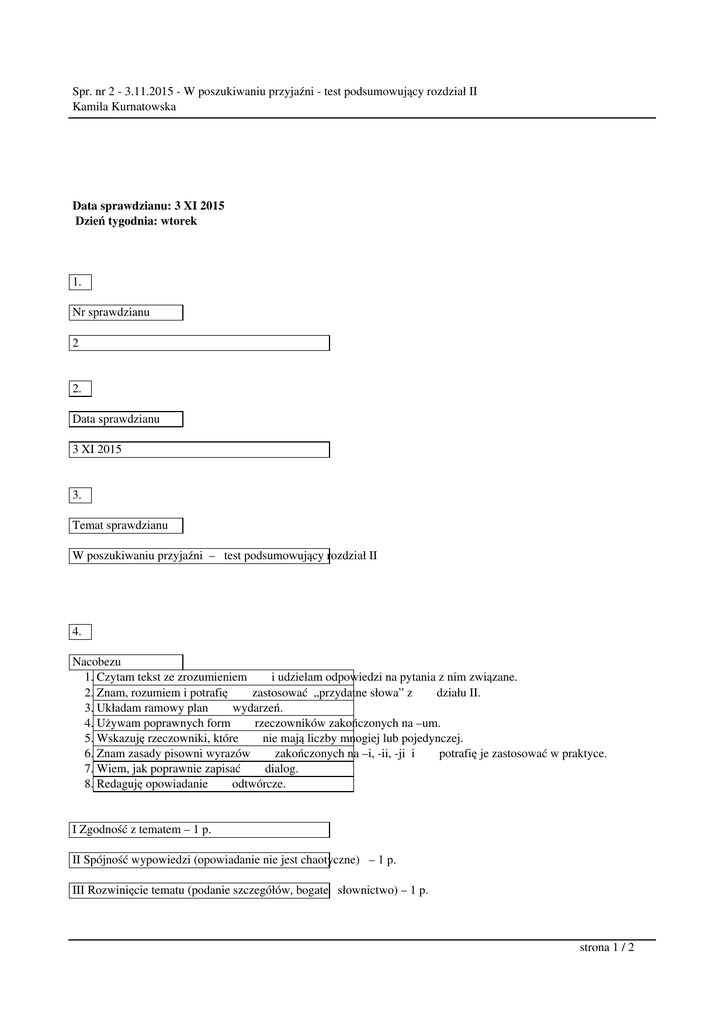 Spr. nr 2 - 3.11.2015 - W poszukiwaniu przyjaźni - test podsumowujący rozdział II Kamila Kurnatowska Data sprawdzianu: 3 XI 2015 Dzień tygodnia: wtorek 1. Nr sprawdzianu 2 2. Data sprawdzianu 3 XI 2015 3. Temat sprawdzianu W poszukiwaniu przyjaźni – test podsumowujący rozdział II 4. Nacobezu 1. Czytam tekst ze zrozumieniem i udzielam odpowiedzi na pytania z nim związane. 2. Znam, rozumiem i potrafię zastosować „przydatne słowa” z działu II. 3. Układam ramowy plan wydarzeń. 4. Używam poprawnych form rzeczowników zakończonych na –um. 5. Wskazuję rzeczowniki, które nie mają liczby mnogiej lub pojedynczej. 6. Znam zasady pisowni wyrazów zakończonych na –i, -ii, -ji i potrafię je zastosować w praktyce. 7. Wiem, jak poprawnie zapisać dialog. 8. Redaguję opowiadanie odtwórcze. I Zgodność z tematem – 1 p. II Spójność wypowiedzi (opowiadanie nie jest chaotyczne) – 1 p. III Rozwinięcie tematu (podanie szczegółów, bogate słownictwo) – 1 p. strona 1 / 2 Spr. nr 2 - 3.11.2015 - W poszukiwaniu przyjaźni - test podsumowujący rozdział II Kamila Kurnatowska IV Poprawność językowa (dopuszczalne dwa błędy) – 1 p. V Nadanie tytułu opowiadaniu – 1 p. VI Poprawność ortograficzna – 1 p. (dopuszczalne 2 błędy) VII Poprawność interpunkcyjna – 1 p. (dopuszczalne dwa błędy) 5. Przydatne materiały i pomoce do nauki Podręcznik i zeszyt ćwiczeń. Notatki w zeszycie przedmiotowym. 6. Strony internetowe z materiałem do sprawdzianu (tu poćwicz) Inne wskazówki nauczyciela: Czytajcie uważnie pytania i polecenia. Życzę Wam powodzenia! strona 2 / 2