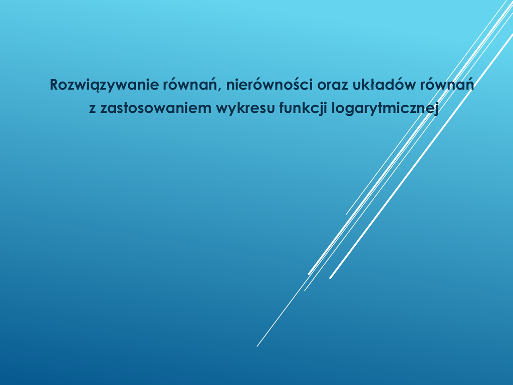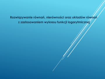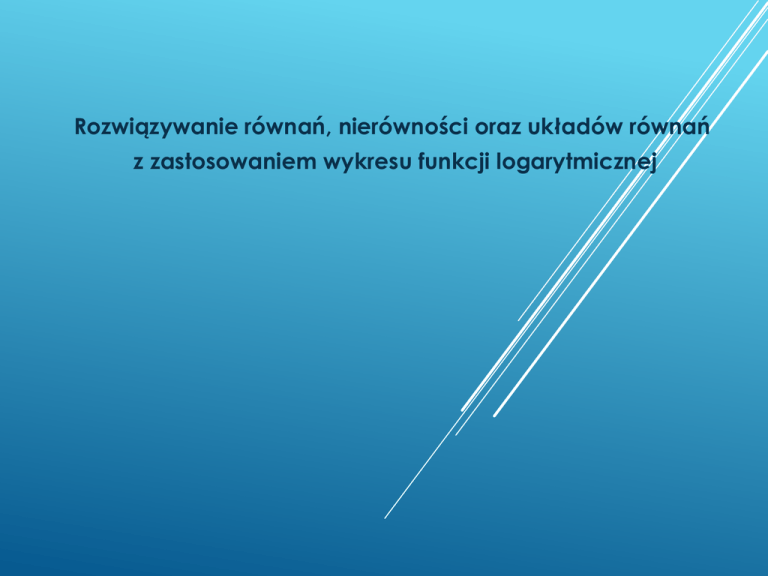 Rozwiązywanie równań, nierówności oraz układów równań z zastosowaniem wykresu funkcji logarytmicznej Cele. Uczeń: potrafi przekształcać wykresy funkcji logarytmicznych (SOX, SOY, S(0,0), przesunięcie równoległe o dany wektor); potrafi graficznie rozwiązywać równania, nierówności oraz układy równań z zastosowaniem wykresów funkcji logarytmicznych; Przykład 1 Zadanie 1.124 Naszkicuj wykres funkcji 𝑓(𝑥) = −𝑙𝑜𝑔3 (𝑥 + 2). a) Podaj dziedzinę funkcji/. b) Oblicz wartość funkcji 𝑓 dla argumentu 25. c) Sprawdź, czy do wykresu funkcji/należy punkt 𝐴 = 2, 𝑙𝑜𝑔3 1 − 2 2 Zadanie 1.124 Naszkicuj wykres funkcji 𝑓(𝑥) = −𝑙𝑜𝑔3 (𝑥 + 2). Zadanie 1.125 Naszkicuj wykres funkcji 𝑓(𝑥) = 𝑙𝑜𝑔1 (𝑥 + 3) − 1. 3 a) Podaj dziedzinę funkcji 𝑓 b) Oblicz współrzędne punktu wspólnego wykresu funkcji 𝑓 i osi OY. c) Oblicz wartość funkcji dla argumentu 6. Odczytaj wykresu, dla jakich argumentów wartości funkcji/są większe od −3. Zadanie 1.126 Na poniższym rysunku przedstawiono wykres funkcji 𝑦 = 𝑔(𝑥), który powstał w wyniku przesunięcia równoległego wykresu funkcji logarytmicznej 𝑓(𝑥) = 𝑙𝑜𝑔2 𝑥 o wektor a) Napisz wzór funkcji g. b) Upewnij się, wykonując obliczenia, że punkty 𝐴(2, −3), 𝐵(3, −2), 𝐶(5, −1) oraz 𝐷(9, 0) należą do wykresu funkcji g, a następnie odczytaj z wykresu: * dla jakich argumentów funkcja g przyjmuje wartości z przedziału (−3, −1) * dla jakich argumentów wartości funkcji g są mniejsze od −2 * dla jakich argumentów wartości funkcji g są dodatnie. → = [1, −3]. 𝑢 Zadanie 1.135 Rozwiąż graficznie równanie a) 𝑙𝑜𝑔2 𝑥 − 1 = 4 − 𝑥 Zadanie 1.136 Rozwiąż graficznie nierówność 𝑎) 𝑙𝑜𝑔2 𝑥 − 2 − 1 ≥ 4𝑥 − 𝑥 2
