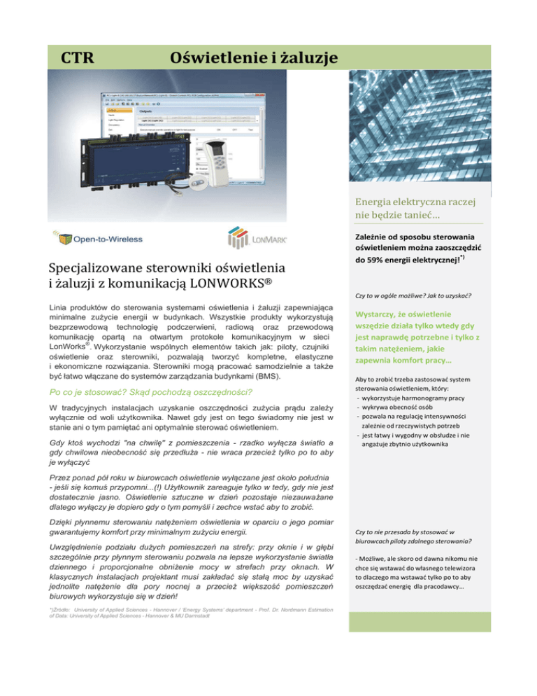 CTR Oświetlenie i żaluzje Energia elektryczna raczej nie będzie tanieć… Specjalizowane sterowniki oświetlenia i żaluzji z komunikacją LONWORKS® Linia produktów do sterowania systemami oświetlenia i żaluzji zapewniająca minimalne zużycie energii w budynkach. Wszystkie produkty wykorzystują bezprzewodową technologię podczerwieni, radiową oraz przewodową komunikację opartą na otwartym protokole komunikacyjnym w sieci LonWorks®. Wykorzystanie wspólnych elementów takich jak: piloty, czujniki oświetlenie oraz sterowniki, pozwalają tworzyć kompletne, elastyczne i ekonomiczne rozwiązania. Sterowniki mogą pracować samodzielnie a także być łatwo włączane do systemów zarządzania budynkami (BMS). Po co je stosować? Skąd pochodzą oszczędności? W tradycyjnych instalacjach uzyskanie oszczędności zużycia prądu zależy wyłącznie od woli użytkownika. Nawet gdy jest on tego świadomy nie jest w stanie ani o tym pamiętać ani optymalnie sterować oświetleniem. Gdy ktoś wychodzi "na chwilę" z pomieszczenia - rzadko wyłącza światło a gdy chwilowa nieobecność się przedłuża - nie wraca przecież tylko po to aby je wyłączyć Zależnie od sposobu sterowania oświetleniem można zaoszczędzić do 59% energii elektrycznej!*) Czy to w ogóle możliwe? Jak to uzyskać? Wystarczy, że oświetlenie wszędzie działa tylko wtedy gdy jest naprawdę potrzebne i tylko z takim natężeniem, jakie zapewnia komfort pracy… Aby to zrobić trzeba zastosować system sterowania oświetleniem, który: ‐ wykorzystuje harmonogramy pracy ‐ wykrywa obecność osób ‐ pozwala na regulację intensywności zależnie od rzeczywistych potrzeb ‐ jest łatwy i wygodny w obsłudze i nie angażuje zbytnio użytkownika Przez ponad pół roku w biurowcach oświetlenie wyłączane jest około południa - jeśli się komuś przypomni...(!) Użytkownik zareaguje tylko w tedy, gdy nie jest dostatecznie jasno. Oświetlenie sztuczne w dzień pozostaje niezauważane dlatego wyłączy je dopiero gdy o tym pomyśli i zechce wstać aby to zrobić. Dzięki płynnemu sterowaniu natężeniem oświetlenia w oparciu o jego pomiar gwarantujemy komfort przy minimalnym zużyciu energii. Uwzględnienie podziału dużych pomieszczeń na strefy: przy oknie i w głębi szczególnie przy płynnym sterowaniu pozwala na lepsze wykorzystanie światła dziennego i proporcjonalne obniżenie mocy w strefach przy oknach. W klasycznych instalacjach projektant musi zakładać się stałą moc by uzyskać jednolite natężenie dla pory nocnej a przecież większość pomieszczeń biurowych wykorzystuje się w dzień! *)Źródło: University of Applied Sciences - Hannover / ‘Energy Systems’ department - Prof. Dr. Nordmann Estimation of Data: University of Applied Sciences - Hannover & MU Darmstadt Czy to nie przesada by stosować w biurowcach piloty zdalnego sterowania? ‐ Możliwe, ale skoro od dawna nikomu nie chce się wstawać do własnego telewizora to dlaczego ma wstawać tylko po to aby oszczędzać energię dla pracodawcy… CTR Sterowniki oświetlenia Sterowniki oświetlenia i żaluzji Typ sterownika Sterowanie Złącza Zasilanie Ilość ster. cyfrowe RJ9 zintegrowanych Adresowanie Adresowanie do obwodów stateczników grupowe indywidualne akcesoriów Zmienne Lon dla żaluzji i HVAC Funkcje i aplikacje Monitorowanie Regulacja Sterowanie Projekty Indywidualny Stan pracy nateżenia stan pracy grupy światła statecznika stateczników Ilość Napięcie od typu Open obsługiwanych obecności space pomieszczeń Sterowniki oświetlenia CTR-4L ON/OFF 4 4 CTR-8L ON/OFF 8 4 CTR-4LD Ściemnianie 1‐10VDC 4 4 CTR-8LD Ściemnianie 1‐10VDC 8 4 CTR-8LDALI DALI 16 stateczników 8 4 CTR-DALI-LR8 DALI 64 stateczniki 8 4 √ √ √ (auto) √ (ręczne) CTR-DALI-LR16 DALI 64 stateczniki 16 4 √ √ (ręczne) √ (auto) √ (ręczne) √ (auto lub ręczne) √ √ √ √ √ √ √ √ √ √ √ √ √ √ √ √ √ √ √ 230V √ √ √ √ 230V √ 4 230V 4 230V 4 230V 4 230V 4 230V Sterowniki żaluzji CTR-4S230 Otwórz/zamknij/kąt 4 4 CTR-8S230 Otwórz/zamknij/kąt 8 4 CTR-4S24 Otwórz/zamknij/kąt 4 4 CTR-8S24 Otwórz/zamknij/kąt 8 4 √ √ √ √ √ √ √ √ 4 230V 4 230V 4 24V 4 24V Pomocnicze urządzenia Moduł ITR WMS-PB-8DI Sieciowy interfejs LON. Posiada 4 cyfrowe porty RJ9 dla akcesriów (odbiorniki, czujniki) Moduł 8 wejść konfogurowalnych do rozszerzenia sterownika o obsługę zestyków (np. dla sterowania poprzez przyciski) podłaczany złączem cyfrowym RJ9 Jako urzadzenia sterujące (odbiorniki, piloty, czuniki) mogą być stosowane wsystkie akcesoria podłączane do sterowników portem cyfrowym RJ stosowne przy systemie IRC - RCB, RCL 230V ‐ CTR – Przykłady zastosowań • Sterowanie oświetleniem z podziałem na dwie strefy: przy oknach i przy korytarzu. • Załączanie on/off lub sterowanie intensywnością zależnie od poziomu natężenia oświetlenia i stanu zajętości pomieszczeń. • Monitoring stanu każdej oprawy oświetleniowej CTR‐8L‐DALI Sterowanie 4 pomieszczeń (2 grupy świateł w każdym z nich) CTR‐DALI‐LR16 Sterowania 2 pomieszczeń typu „open space” (2 grupy świateł w każdym z nich)