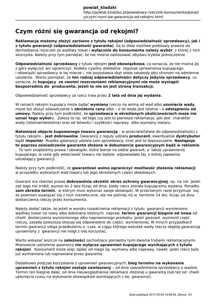 powiat_klodzki http://powiat.klodzko.pl/powiatowy-rzecznik-konsumenta/porad y/czym-rozni-sie-gwarancja-od-rekojmi.html Czym różni się gwarancja od rękojmi? Reklamację możemy złożyć zarówno z tytułu rękojmi (odpowiedzialność sprzedawcy), jak i z tytułu gwarancji (odpowiedzialność gwaranta). Są to dwie możliwe podstawy prawne do dochodzenia roszczeń za wadliwy towar i wyłącznie do konsumenta należy wybór, z której z nich skorzysta. Należy przy tym pamiętać, że nie można zastosować obydwu trybów jednocześnie. Odpowiedzialność sprzedawcy z tytułu rękojmi jest obowiązkowa, co oznacza, że nie można jej z góry wyłączyć ani ograniczyć. Kodeks cywilny dokładnie reguluje uprawnienia kupującego i obowiązki sprzedawcy w tej mierze i nie pozostawia zbyt wiele swobody obu stronom na odmienne ustalenia. Warto pamiętać, że ten rodzaj odpowiedzialności dotyczy jedynie sprzedawcy, co oznacza, że kupujący ze swoimi roszczeniami reklamacyjnymi nie może wystąpić bezpośrednio do producenta, jeżeli to nie on jest stroną transakcji. Odpowiedzialność sprzedawcy za rzecz trwa przez 2 lata od dnia jej wydania. W ramach rękojmi kupujący może żądać wymiany rzeczy na wolną od wad albo usunięcia wady, może też złożyć oświadczenie o obniżeniu ceny albo – o ile wada jest istotna – o odstąpieniu od umowy. Należy przy tym podkreślić, że sprzedawca w określonych okolicznościach może nie uznać tego wyboru. Zależy to np. od tego czy jest to pierwsza reklamacja, jaki jest charakter wady (istotna/nieistotna) oraz od łatwości i szybkości naprawy albo wymiany towaru. Natomiast objęcie kupowanego towaru gwarancją – w przeciwieństwie do odpowiedzialności z tytułu rękojmi – jest dobrowolne. Gwarancji z reguły udziela producent, ewentualnie dystrybutor bądź importer. Rzadko gwarancji udziela sam sprzedawca, choć jest to dopuszczalne. Następuje to poprzez oświadczenie gwaranta złożone w dokumencie gwarancyjnym bądź w reklamie . To tam znajdziemy prawa i obowiązki, które bierze na siebie gwarant, a także uprawnienia kupującego, w razie gdy właściwość towaru nie będzie odpowiadała tej, o której zapewnia udzielający gwarancji. Należy przy tym podkreślić, że gwarantowi wolno ograniczyć możliwość złożenia reklamacji w przypadku wybranych wad towaru lub jego określonych części składowych. Gwarant ma również prawo dobrowolnie określić okres ochrony gwarancyjnej, np. na rok. Jeżeli zaś tego nie zrobił, wynosi on 2 lata licząc od dnia, kiedy rzecz została kupującemu wydana. Ponadto sam określa termin, w którym musi wykonać swoje obowiązki. W przeciwnym razie przyjmuje się, że powinien wywiązać się z nich niezwłocznie, ale nie później niż w terminie 14 dni, licząc od dnia dostarczenia rzeczy przez konsumenta. Należy dodać także, że jeżeli w wyniku rozpatrzenia reklamacji z tytułu gwarancji wymieniono wadliwy towar na nowy albo dokonano istotnych napraw, termin gwarancji biegnie od nowa od chwili dostarczenia wymienionego albo naprawionego produktu. Jeżeli gwarant wymienił część rzeczy, zasadę powyższą stosuje się odpowiednio do części wymienionej. W innych przypadkach termin gwarancji ulega przedłużeniu o czas, w ciągu którego wskutek wady rzeczy objętej gwarancją uprawniony z gwarancji nie mógł z niej korzystać. Warto wskazać jeszcze na zależności zachodzące pomiędzy tymi dwoma trybami reklamacyjnymi. Mianowicie udzielenie gwarancji nie wyłącza uprawnień kupującego wynikających z tytułu rękojmi. Konsument może więc żądać od niego np. wymiany albo naprawy, nawet jeżeli rzecz była już wymieniona lub naprawiana przez gwaranta. Dodatkowo podczas korzystania z uprawnień gwarancyjnych, bieg terminu na wykonanie uprawnień z tytułu rękojmi zostaje zawieszony – od dnia zawiadomienia sprzedawcy o wadzie. Termin ten biegnie dalej od dnia nieuwzględnienia reklamacji złożonej u gwaranta (lub też od chwili upłynięcia czasu na wykonanie obowiązków wynikających z tej gwarancji). Data publikacji 2017-03-04 14:56:54, Strona: 1/2 powiat_klodzki http://powiat.klodzko.pl/powiatowy-rzecznik-konsumenta/porad y/czym-rozni-sie-gwarancja-od-rekojmi.html Źródło: www.uokik.gov.pl Data publikacji 2017-03-04 14:56:54, Strona: 2/2