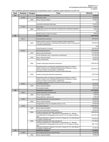 Załącznik nr 3 do Zarządzenia Burmistrza Miasta Lubań nr 5/2010 Plan wydatków jednostki budżetowej Urząd Miasta Lubań w zakresie zadań własnych na 2010 rok Dział Rozdział Treść Paragraf 010 01008 4300 Wartość Rolnictwo i łowiectwo 73 000,00 Melioracje wodne 70 000,00 Zakup usług pozostałych 70 000,00 czyszczenie młynówek rzeki Kwisy 70 000,00 0,00 01030 2850 Izby rolnicze 3 000,00 Wpłaty gmin na rzecz izb rolniczych w wysokości 2% uzyskanych wpływów z podatku rolnego 3 000,00 Skladka roczna na rzecz izb rolnych Transport i łączność 600 60014 6300 0,00 3 000,00 4 087 024,00 Drogi publiczne powiatowe 300 000,00 Dotacja celowa na pomoc finansową udzielaną między jednostkami samorządu terytorialnego na dofinansowanie własnych zadań inwestycyjnych i zakupów inwestycyjnych 300 000,00 Droga Powiatowa ul.Łużycka 300 000,00 0,00 60016 Drogi publiczne gminne 4270 4300 6058 6059 Zakup usług remontowych 513 400,00 remont nawierzchni wraz z utrzymaniem oznakowania 513 400,00 Zakup usług pozostałych 36 600,00 Opłaty za parkometry 36 600,00 Wydatki inwestycyjne jednostek budżetowych 2 559 937,00 Zagospodarowanie i rewitalizacja zdegradowanych terenów w centrum miasta w ramach LPR /ul.Społdzielcza,Ratuszowa Pl.Strazacki i murami obronnymi/ Waska,Tkacka/ Bracka, Spółdzielcza/ Wrocławska,Ratuszowa,Stara,Pl.Lompy do murow obronnych 2 559 937,00 Wydatki inwestycyjne jednostek budżetowych Zagospodarowanie i rewitalizacja zdegradowanych terenów w centrum miasta w ramach LPR /ul.Społdzielcza,Ratuszowa Pl.Strazacki i murami obronnymi/ Waska,Tkacka/ Bracka, Spółdzielcza/ Wrocławska,Ratuszowa,Stara,Pl.Lompy do murow obronnych Pozostała działalność 60095 4300 Zakup usług pozostałych Komunikacja miejska 700 Gospodarka mieszkaniowa 70001 4300 4300 6059 71004 4300 58 075,00 2 347 629,00 5 000,00 Gospodarka gruntami i nieruchomościami 80 000,00 Zakup usług pozostałych 80 000,00 Zakup usług pozostałych Wydatki inwestycyjne jednostek budżetowych renowacja budynków przy ul.Brackiej15 ul. Żymierskiego 4 ul.. Mikołaja 1,2,3,22,24,24a ul. Wrocławskiej 2,4,6,7,8,9,10,11,12 w Lubaniu w ramach LPR renowacja budynków ul. Rynek 4,13,14,16 ul. Tkacka 10,11 ul. Plac Okrzei 7 w Lubaniu w ramach LPR Wydatki inwestycyjne jednostek budżetowych renowacja budynków przy ul.Brackiej15 ul. Żymierskiego 4 ul.. Mikołaja 1,2,3,22,24,24a ul. Wrocławskiej 2,4,6,7,8,9,10,11,12 w Lubaniu w ramach LPR renowacja budynków ul. Rynek 4,13,14,16 ul. Tkacka 10,11 ul. Plac Okrzei 7 w Lubaniu w ramach LPR Działalność usługowa 710 58 075,00 5 000,00 opracowania geodezyjno-kartograficzne 6058 58 075,00 Zakup usług pozostałych Pozostała działalność 4300 619 012,00 5 000,00 Przygotowanie mienia do sprzedaży (wyceny i inne) 70095 619 012,00 Zakłady gospodarki mieszkaniowej Zakup tabliczek z nazwami ulic 70005 3 728 949,00 80 000,00 2 262 629,00 25 000,00 25 000,00 1 506 035,00 1 287 531,00 218 504,00 731 594,00 686 110,00 45 484,00 118 500,00 Plany zagospodarowania przestrzennego 75 000,00 Zakup usług pozostałych 75 000,00 71014 4300 71035 4300 Sporządzenie planów zagospodarowania przestrzennego miasta Lubań 75 000,00 Opracowania geodezyjne i kartograficzne 40 000,00 Zakup usług pozostałych 40 000,00 opracowania geodezyjno-kartograficzne 40 000,00 Cmentarze 3 500,00 Zakup usług pozostałych 3 500,00 Utrzymanie cmentarzy 720 72095 89 686,00 Pozostała działalność 89 686,00 4118 Składki na ubezpieczenia społeczne 4119 Inowacyjny system informacji w celu wspierania działalności przedsiębiorstw na pograniczu polsko-czeskim Składki na ubezpieczenia społeczne Inowacyjny system informacji w celu wspierania działalności przedsiębiorstw na pograniczu polsko-czeskim 4178 4179 4218 3 500,00 Informatyka Wynagrodzenia bezosobowe Inowacyjny system informacji w celu wspierania działalności przedsiębiorstw na pograniczu polsko-czeskim Wynagrodzenia bezosobowe Inowacyjny system informacji w celu wspierania działalności przedsiębiorstw na pograniczu polsko-czeskim Zakup materiałów i wyposażenia Inowacyjny system informacji w celu wspierania działalności przedsiębiorstw na pograniczu polsko-czeskim 8 572,00 8 572,00 1 513,00 1 513,00 43 125,00 43 125,00 7 610,00 7 610,00 5 699,00 5 699,00 Zakup materiałów i wyposażenia 1 006,00 Inowacyjny system informacji w celu wspierania działalności przedsiębiorstw na pograniczu polsko-czeskim 1 006,00 4308 Zakup usług pozostałych 1 865,00 4309 Inowacyjny system informacji w celu wspierania działalności przedsiębiorstw na pograniczu polsko-czeskim Zakup usług pozostałych Inowacyjny system informacji w celu wspierania działalności przedsiębiorstw na pograniczu polsko-czeskim 4219 4368 Opłaty z tytułu zakupu usług telekomunikacyjnych telefonii komórkowej 4369 Inowacyjny system informacji w celu wspierania działalności przedsiębiorstw na pograniczu polsko-czeskim Opłaty z tytułu zakupu usług telekomunikacyjnych telefonii komórkowej Inowacyjny system informacji w celu wspierania działalności przedsiębiorstw na pograniczu polsko-czeskim 4388 Zakup usług obejmujacych tłumaczenia 4389 Inowacyjny system informacji w celu wspierania działalności przedsiębiorstw na pograniczu polsko-czeskim Zakup usług obejmujacych tłumaczenia Inowacyjny system informacji w celu wspierania działalności przedsiębiorstw na pograniczu polsko-czeskim 4428 4429 750 1 865,00 329,00 329,00 2 903,00 2 903,00 512,00 512,00 11 270,00 11 270,00 1 989,00 1 989,00 Podróże służbowe zagraniczne 2 799,00 Inowacyjny system informacji w celu wspierania działalności przedsiębiorstw na pograniczu polsko-czeskim 2 799,00 Podróże służbowe zagraniczne 494,00 Inowacyjny system informacji w celu wspierania działalności przedsiębiorstw na pograniczu polsko-czeskim 494,00 Administracja publiczna 7 064 442,00 Rady gmin (miast i miast na prawach powiatu) 317 860,00 3030 Różne wydatki na rzecz osób fizycznych 255 660,00 4