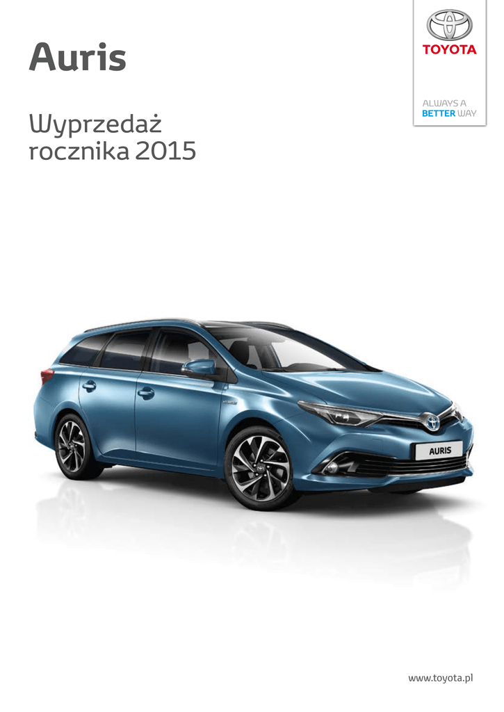 Auris Wyprzedaż rocznika 2015 www.toyota.pl Oferta specjalna! Bogate wyposażenie w standardzie, niezwykły komfort jazdy, niezawodne silniki i bezpieczeństwo na najwyższym poziomie – to wszystko i wiele więcej znajdziesz w Toyocie Auris. Tylko teraz ostatnie modele z rocznika 2015 są dostępne w niezwykle atrakcyjnych cenach. CENNIK BRUTTO Zapraszamy do salonów w celu odbycia jazdy próbnej oraz weryfikacji dostępności samochodów. Cennik obowiązuje od 1 kwietnia 2016 r. RABAT DO 13 500 zł SILNIK 1.33 99 KM 1,6 132 KM 1,2 T 116 KM WERSJA WYPOSAŻENIA CENA PO RABACIE CENA KATALOGOWA ACTIVE WYPRZEDANE 56 900 zł 64 900 zł PREMIUM WYPRZEDANE 63 400 zł 68 400 zł COMFORT WYPRZEDANE 66 900 zł 72 900 zł ACTIVE WYPRZEDANE 63 400 zł 68 400 zł COMFORT + PARK 68 900 zł 78 400 zł COMFORT + STYLE + PARK 71 400 zł 82 900 zł COMFORT + STYLE + PARK 71 400 zł 84 900 zł 74 900 zł 83 900 zł 86 900 zł 96 400 zł ACTIVE 1,8 Hybrid 136 KM COMFORT + STYLE + PARK RABAT DO 13 500 zł SILNIK 1.33 99 KM 1,6 132 KM 1,2 T 116 KM WERSJA WYPOSAŻENIA CENA PO RABACIE CENA KATALOGOWA ACTIVE WYPRZEDANE 59 900 zł 67 900 zł PREMIUM WYPRZEDANE 67 400 zł 72 400 zł COMFORT WYPRZEDANE 60 900 zł 76 900 zł ACTIVE WYPRZEDANE 66 400 zł 71 400 zł 72 900 zł 82 400 zł COMFORT + PARK COMFORT + STYLE + PARK 75 400 zł 86 900 zł COMFORT + STYLE + PARK 75 400 zł 88 900 zł WYPOSAŻENIE DODATKOWE SKÓRZANE SIEDZENIA LAMPY PRZECIWMGIELNE 1 285 zł (cena brutto za komplet lamp) 4 700 zł (cena brutto) Tapicerka skórzana z elementami syntetycznymi. Cena nie zawiera kosztów montażu. Lampy do modeli z napędem konwencjonalnym. Brak kompatybilności z pakietem Safety w wersji 1,4 D-4D. KOMPLETNE KOŁA ZIMOWE 3 950 zł 5 900 zł 16" felgi aluminiowe, opony Nokian WR D3 17" felgi aluminiowe, opony Nokian WR D4 2 200 zł 2 500 zł 15" felgi stalowe, opony Fulda Kristall Control HP 16" felgi stalowe, opony Fulda Kristall Control HP Ceny kompletu kół brutto. Koła są wyposażone w fabryczny system monitorowania ciśnienia. WYPOSAŻENIE ACTIVE PREMIUM COMFORT PRESTIGE BEZPIECZEŃSTWO 7 poduszek powietrznych ABS + EBD + BA System stabilizacji toru jazdy i kontroli trakcji VSC + TRC HAC (system wspomagający pokonywanie podjazdów) ISOFIX na skrajnych tylnych miejscach i wyłącznik poduszki pasażera Sygnalizacja niezapiętych pasów na przednich siedzeniach Immobilizer Zestaw naprawczy Światła do jazdy dziennej typu LED Lampy przeciwmgielne Układ wczesnego reagowania w razie ryzyka zderzenia (PCS) Układ rozpoznawania znaków drogowych (RSA) SAFETY Układ ostrzegania o niezamierzonej zmianie pasa ruchu (LDA) SAFETY SAFETY / TECH Automatyczne światła drogowe (AHB) Pełne lampy w technologii LED STYLE Czujnik ciśnienia w oponach Tempomat Wewnętrzne lusterko elektrochromatyczne TECH Czujnik zmierzchu i deszczu WYGLĄD ZEWNĘTRZNY Felgi stalowe, opony 195/65/R15 (dotyczy wersji z silnikami konwencjonalnymi) Felgi aluminiowe, opony 195/65/R15 (dotyczy wersji hybrydowej) Felgi stalowe, opony 205/55/R16 (dotyczy wersji z silnikami konwencjonalnymi) Felgi aluminiowe, opony 205/55/R16 (dotyczy wersji hybrydowej) Felgi aluminiowe, opony 205/55/R16 Felgi aluminiowe, opony 225/45/R17 (wszystkie silniki oprócz 1,4 D-4D) STYLE EXECUTIVE Felgi aluminiowe, opony 215/45/R17 (dotyczy wersji 1,4 D-4D) STYLE EXECUTIVE Lakierowane klamki i lusterka zewnętrzne Kierunkowskazy w lusterkach Tylny spojler Chromowana listwa w dolnym przednim grillu Chromowane listwy wokół świateł przeciwmgielnych Chromowana listwa w tylnym dyfuzorze Przyciemniane szyby tylne STYLE Relingi dachowe srebrne (tylko Touring Sports) Chromowana listwa na dolnej krawędzi okien Dach panoramiczny SkyView z elektryczną roletą SKYVIEW SKYVIEW ACTIVE PREMIUM COMFORT PRESTIGE KOMFORT Elektrycznie regulowane i podgrzewane lusterka zewnętrzne Wspomaganie kierownicy i regulacja w dwóch płaszczyznach Światła z systemem opóźnionego wyłączania „Follow me home” Komputer pokładowy Centralny zamek sterowany pilotem Elektrycznie regulowane szyby przednie Centralny wyświetlacz TFT 4,2" między zegarami (dotyczy wersji z silnikami konwencjonalnymi) SAFETY Centralny wyświetlacz TFT 4,2" między zegarami (dotyczy wersji hybrydowej) Klimatyzacja automatyczna jednostrefowa Klimatyzacja automatyczna dwustrefowa Skórzana kierownica Skórzana gałka dźwigni zmiany biegów (nie dotyczy wersji hybrydowej) Podwójna podłoga bagażnika Elektrycznie regulowane szyby tylne Elektrycznie składane lusterka TECH Roleta bagażnika z możliwością ustawienia w dwóch położeniach (tylko Touring Sports) Uruchamianie samochodu przyciskiem START (dotyczy wersji z silnikami konwencjonalnymi) Uruchamianie samochodu przyciskiem START (dotyczy wersji hybrydowej) 2 000 zł/ Czujniki parkowania przednie i tylne 500 zł 2 000 zł/ 500 zł System automatycznego parkowania (SIPA) System „Inteligentny kluczyk” Siatka oddzielająca przestrzeń bagażową od pasażerskiej (tylko Touring Sports) 99 zł 99 zł 99 zł 99 zł FOTELE Dzielona (60/40) oraz składana tylna kanapa Regulacja wysokości fotela kierowcy Tapicerka materiałowa Podłokietnik przedni stały Podłokietnik przedni ruchomy Regulacja wysokości fotela pasażera Podłokietnik tylny z miejscami na napoje Podgrzewane fotele przednie z podparciem lędźwiowym fotela kierowcy Fotele sportowe Tapicerka materiałowa + skórzane boczki Skórzane siedzenia Oparcia tylnej kanapy składane z bagażnika (tylko Touring Sports) AUDIO Radio RDS + CD + MP3 + 4 głośniki + Bluetooth System multimedialny Toyota Touch 2 z funkcją Bluetooth i kamerą cofania Radio RDS + CD + MP3 + 6 głośników Przyciski na kierownicy do sterowania wyświetlaczem Antena dachowa typu „płetwa rekina” Port USB/Aux-in Przyciski na kierownicy do sterowania systemem audio Przyciski na kierownicy do sterowania telefonem EXECUTIVE DANE TECHNICZNE 1,6 132 KM 6 MT / Multidrive S 1,2 T 116 KM 6 MT / Multidrive S 1,8 Hybrid 136 KM E-CVT Ś