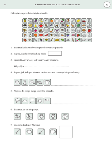 55 26. DWADZIEŚCIA PYTAŃ – CZYLI TWORZYMY KOLEKCJE Odczytaj, co przedstawiają te obrazki. 1. Zaznacz kółkiem obrazki przedstawiające pojazdy. 2. Zapisz, na ilu obrazkach są ptaki. 3. Sprawdź, czy więcej jest warzyw, czy owadów. Więcej jest . . . . . . . . . . . . . . . . . . . . . . . . . . . . . . . . . . . . . . . . . . . . . 4. Zapisz, jak jednym słowem można nazwać te wszystkie przedmioty. ............................................. 5. Napisz, do czego mogą służyć te obrazki. ............................................. 6. Zaznacz, co tu nie pasuje. 7. Czego tu brakuje? Narysuj. A 56 26. DWADZIEŚCIA PYTAŃ – CZYLI TWORZYMY KOLEKCJE Odczytaj, co przedstawiają te obrazki. 1. Zaznacz kółeczkiem obrazki przedstawiające zwierzęta, które żyją w wodzie. 2. Zapisz, na ilu obrazkach są owoce egzotyczne. 3. Zapisz, czy więcej jest owadów, które umieją latać, czy zwierząt, które żyją w wodzie. Więcej jest . . . . . . . . . . . . . . . . . . . . . . . . . . . . . . . . . . . . . . . . . . . . . 4. Napisz, jak jednym słowem można nazwać te wszystkie przedmioty. ............................................. 5. W sklepie półki, gdzie znajdują się towary, oznaczono obrazkami. Połącz linią nazwy towarów i ich oznaczenia. gospodarstwo domowe słodycze pieczywo warzywa obuwie 6. Zaznacz, co tu nie pasuje. B 57 C 26. DWADZIEŚCIA PYTAŃ – CZYLI TWORZYMY KOLEKCJE Odczytaj, co przedstawiają te obrazki. 1. a) Utwórz dwie kolekcje: t Czerwonym kółeczkiem zaznacz wszystkie ptaki. t Niebieskim kółeczkiem zaznacz zwierzęta, które żyją w wodzie. b) Napisz, jak można nazwać kolekcję zwierząt, które oznaczone są jednocześnie czerwonym i niebieskim kółeczkiem. ........................................................................................... 2. Obok wypisano niektóre liczby mniejsze od 30. Napisz, jaką mają jeszcze inną wspólną cechę. 5 10 15 20 25 ........................................................................................... 3. Wypisz wszystkie liczby większe 50, ale mniejsze od 100, które mają tę samą cechę, co liczby z zadania 2. ........................................................................................... Zapisz, ile jest wśród nich liczb, których cyfrą jedności jest 0. Jaką inną wspólną cechę mają liczby zakończone cyfrą 0? ........................................................................................... 4. Wśród niżej narysowanych figur jedna nie pasuje do pozostałych. Skreśl ją i wyjaśnij, dlaczego nie pasuje. ...........................................................................................