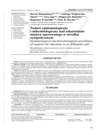 O r t o p e d i a Traumatologia Rehabilitacja © MEDSPORTPRESS, 2006; 6(6); Vol. 8, 639-645 Dorota Romaniszyn1(B,C,D,E,F), Jadwiga WójkowskaMach1(A,C,D,E), Ewa Jaje2(B), Ma³gorzata Bulanda1(A,G), Bogus³aw Frañczuk2(B,D), Piotr B. Heczko1(A,D) Author’s Contribution A – Study Design B – Data Collection C – Statistical Analysis D – Data Interpretation E – Manuscript Preparation F – Literature Search G – Funds Collection Nadzór epidemiologiczny i mikrobiologiczny nad zaka¿eniami miejsca operowanego w oœrodku ortopedycznym 2 Epidemiological and microbiological surveillance of surgical site infections in an orthopedic unit ibu -d istr STRESZCZENIE pe rs on al us eo nly Wstêp. W pracy przedstawiono wyniki analizy epidemiologicznej i mikrobiologicznej zaka¿eñ miejsca operowanego (ZMO) u pacjentów poddawanych zabiegom operacyjnym w oddziale urazowo-ortopedycznym. Materia³ i metody. W roku 2004 przeprowadzono 1 095 zabiegów operacyjnych. Zespó³ kontroli zaka¿eñ szpitalnych zidentyfikowa³ 31 przypadków ZMO. Zaka¿enia kwalifikowano wed³ug definicji i kryteriów programu NNIS. Lekowra¿liwoœæ bakterii uznanych za czynnik etiologiczny ZMO badano metod¹ dyfuzyjno-kr¹¿kow¹, zgodnie z zaleceniami National Committee for Clinical Laboratory Standards. Wyniki. Stwierdzono zachorowalnoœæ ZMO wynosz¹c¹ 2,6 na 100 zabiegów, dominowa³y zaka¿enia powierzchowne 65%. Rejestracja po-wypisowa objê³a 29% przypadków, w tym 2 pacjentów wymaga³o ponownej hospitalizacji. Wartoœæ œrodkowa (mediana) d³ugoœci pobytu pacjentów z zaka¿eniem ZMO to 40 dni. Wœród czynników etiologicznych wszystkich form klinicznych ZMO wykazano dominuj¹cy udzia³ ziarenkowców Gram-dodatnich (65,4%). Wnioski. Ka¿dy z rozpoznanych przypadków ZMO poddawano diagnostyce mikrobiologicznej w celu identyfikacji czynnika etiologicznego i okreœlenia jego lekowra¿liwoœci. Zgodnie z oczekiwaniami wœród wyizolowanej flory stwierdzono znacz¹c¹ przewagê bakterii G (+), liczn¹ grupê reprezentowa³y równie¿ pa³eczki G (). Uzyskane dane potwierdzaj¹ koniecznoœæ dalszej œcis³ej wspó³pracy Zespo³u Kontroli Zaka¿eñ Szpitalnych z laboratorium mikrobiologicznym. Analiza danych dotycz¹cych wiod¹cych czynników etiologicznych ZMO oraz ich wra¿liwoœci na leki powinna umo¿liwiæ opracowanie w³asnych standardów profilaktyki oko³ooperacyjnej i terapii empirycznej do stosowania na badanym oddziale. SUMMARY is c op y is for Background. This article summarizes the results of epidemiological and microbiological analyses of surgical site infections (SSI) in patients operated in trauma and orthopedic units. Material and methods. In 2004, 1,095 surgical treatments were carried out in the study population, and 31 SSIs were identified. The infections were classified according to the definitions and criteria of the NNIS. The medication susceptibility of the bacteria found to be an SSI etiological factor was tested using the circular diffusion method, according to the specifications of the National Committee for Clinical Laboratory Standards. Results. An SSI incidence of 2.6% was found. Superficial infections constituted a majority (65%). Post-discharge follow-up covered 29% of cases, including 2 patients who required repeated hospitalization. The median duration of SSI patients' hospital stay was 40 days. Among the etiological factors in SSI, a dominant role was played by Gram-positive cocci (65.4%). Conclusions. As expected, a prevalence of G (+) bacteria was found among isolated bacterial flora, although numerous occurrences of G (-) cocci were also identified. Our data confirm the necessity for continued close cooperation between the Hospital Infection Control Team and the microbiological laboratory. The analysis of data pertaining to the leading SSI etiological factors, as well as their medication susceptibility, should enable the development of in-house standards for surgical infection prophylaxis and empirical therapy to be used in the ward. Liczba s³ów/Word count: 2982 Tabele/Tables: 3 Adres do korespondencji / Address for correspondence mgr Dorota Romaniszyn, Katedra Mikrobiologii CMUJ 31-121 Kraków, ul. Czysta 18, tel. (0-12) 633-60-33, fax. (0-12) 423-39-24 e-mail: [email protected] Th This copy is for personal use only - distribution prohibited. This copy is for personal use only - distribution prohibited. - S³owa kluczowe: endoprotezoplastyka stawów, zaka¿enia szpitalne, czynniki etiologiczne Key words: arthroplasty of joints, nosocomial infections, aetiological factors Ryciny/Figures: 4 Piœmiennictwo/References: 23 Otrzymano / Received Zaakceptowano / Accepted 04.02.2006 r. 12.11.2006 r. - This copy is for personal use only - distribution prohibited. Katedra Mikrobiologii Collegium Medicum UJ, Kraków Krakowskie Centrum Rehabilitacji, Kraków tio np roh ibit 1 ed . Zaanga¿owanie Autorów A – Przygotowanie projektu badawczego B – Zbieranie danych C – Analiza statystyczna D – Interpretacja danych E – Przygotowanie manuskryptu F – Opracowanie piœmiennictwa G – Pozyskanie funduszy - This copy is for personal use only - distribution prohibited. - ARTYKU£ ORYGINALNY / ORIGINAL ARTICLE 639 ed . ibu -d istr nly Na 1 095 przeprowadzonych w roku 2004 zabiegów operacyjnych, 94,8% wykonano w polu mikrobiologicznie czystym b¹dŸ czysto-ska¿onym, œredni wiek pacjentów: 68 lat, wœród pacjentów dominowa³y kobiety. Œrednia d³ugoœæ zabiegu (równa medianie) wynios³a 1 godz 20 min, ponad standardowy czas zabiegu: 1 godz. 45 min. W trybie nag³ym przeprowadzono 9,3% operacji, ponad 12% pacjentów operowanych by³o z powodu urazu w obrêbie narz¹du ruchu. Najwiêcej zabiegów wykonano w zakresie endoprotezoplasyki stawu biodrowego, wszystkie zabiegi z zastosowaniem wszczepu stanowi³y 53% przeprowadzonych operacji. Stwierdzono zachorowalnoœæ skumulowan¹ ZMO wynosz¹c¹ 2,6%. Wœród przypadków ZMO dominowa³y przypadki zwi¹zane z endoprotezoplastyk