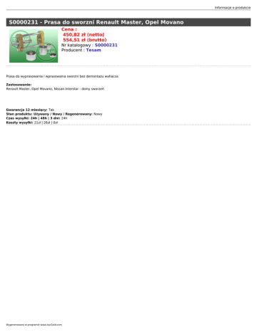 Informacje o produkcie S0000231 - Prasa do sworzni Renault Master, Opel Movano Cena : 450,82 zł (netto) 554,51 zł (brutto) Nr katalogowy : S0000231 Producent : Tesam Prasa do wyprasowania i wprasowania sworzni bez demontażu wahacza Zastosowanie: Renault Master, Opel Movano, Nissan Interstar - dolny sworzeń Gwarancja 12 miesięcy: Tak Stan produktu: Używany / Nowy / Regenerowany: Nowy Czas wysyłki: 24h | 48h | 3 dni: 24h Koszty wysyłki: 21zł | 26zł | 0zł Wygenerowano w programie www.oscGold.com