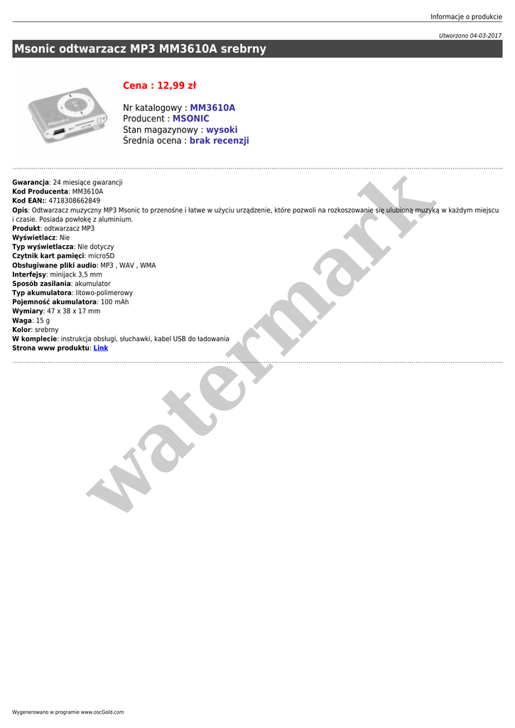 Informacje o produkcie Utworzono 04-03-2017 Msonic odtwarzacz MP3 MM3610A srebrny Cena : 12,99 zł Nr katalogowy : MM3610A Producent : MSONIC Stan magazynowy : wysoki Średnia ocena : brak recenzji w at er m ar k Gwarancja: 24 miesiące gwarancji Kod Producenta: MM3610A Kod EAN:: 4718308662849 Opis: Odtwarzacz muzyczny MP3 Msonic to przenośne i łatwe w użyciu urządzenie, które pozwoli na rozkoszowanie się ulubioną muzyką w każdym miejscu i czasie. Posiada powłokę z aluminium. Produkt: odtwarzacz MP3 Wyświetlacz: Nie Typ wyświetlacza: Nie dotyczy Czytnik kart pamięci: microSD Obsługiwane pliki audio: MP3 , WAV , WMA Interfejsy: minijack 3,5 mm Sposób zasilania: akumulator Typ akumulatora: litowo-polimerowy Pojemność akumulatora: 100 mAh Wymiary: 47 x 38 x 17 mm Waga: 15 g Kolor: srebrny W komplecie: instrukcja obsługi, słuchawki, kabel USB do ładowania Strona www produktu: Link Wygenerowano w programie www.oscGold.com