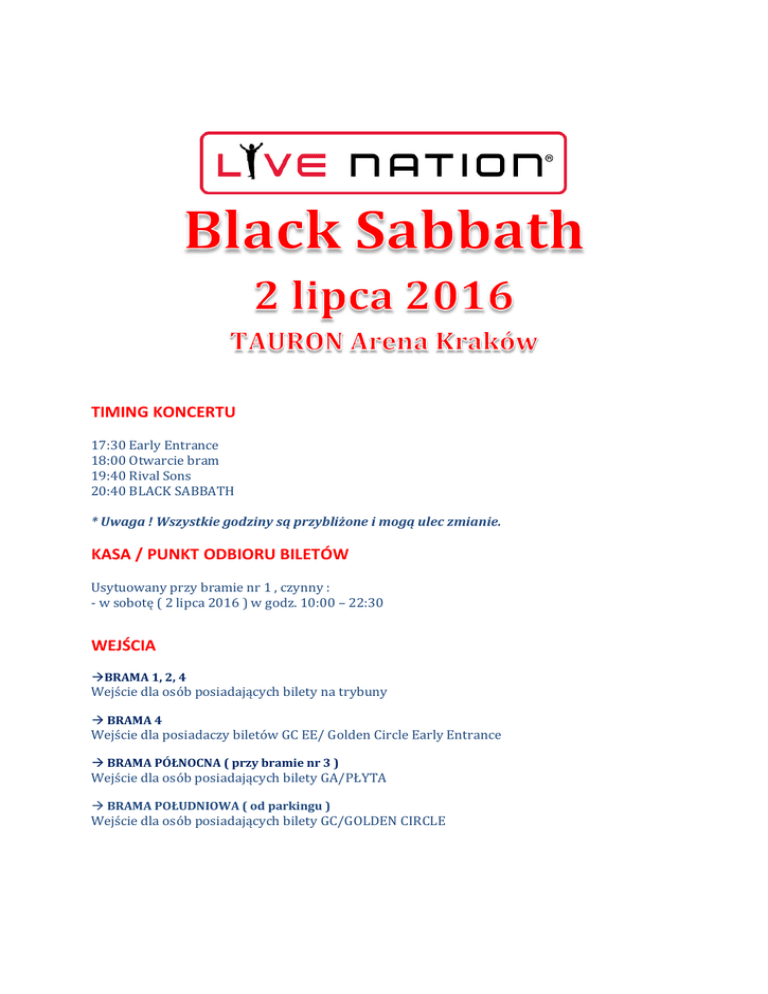 TIMING KONCERTU 17:30 Early Entrance 18:00 Otwarcie bram 19:40 Rival Sons 20:40 BLACK SABBATH * Uwaga ! Wszystkie godziny są przybliżone i mogą ulec zmianie. KASA / PUNKT ODBIORU BILETÓW Usytuowany przy bramie nr 1 , czynny : - w sobotę ( 2 lipca 2016 ) w godz. 10:00 – 22:30 WEJŚCIA àBRAMA 1, 2, 4 Wejście dla osób posiadających bilety na trybuny à BRAMA 4 Wejście dla posiadaczy biletów GC EE/ Golden Circle Early Entrance à BRAMA PÓŁNOCNA ( przy bramie nr 3 ) Wejście dla osób posiadających bilety GA/PŁYTA à BRAMA POŁUDNIOWA ( od parkingu ) Wejście dla osób posiadających bilety GC/GOLDEN CIRCLE OSOBY NIEPEŁNOSPRAWNE Wejście dla osób niepełnosprawnych poruszających się na wózkach inwalidzkich brama nr 1 PARKING Informację nt parkingu dostępne TUTAJ *Uwaga ! Liczba miejsc ograniczona . ZAKAZ WNOSZENIA / PRZEDMIOTY ZABRONIONE - broń, przedmioty pirotechniczne, race, petardy, spray, farba - parasolki z ostrym zakończeniem, kaski - napoje w puszkach, butelkach szklanych, butelkach plastikowych pow. 0.5l, - alkohol, narkotyki - materiały o treściach rasistowskich, ulotki, materiały reklamowe - wuwuzele i trąbki - transparenty i flagi o wymiarach większych niż 1,5 x 2m, kije, drzewce ostro zakończone - wskaźniki laserowe - buty o metalowych zakończeniach, łańcuchy, ozdoby z kolcami oraz inne przedmioty mogące stanowić zagrożenie - aparaty fotograficzne z wymienną optyką, kamery, laptopy, Ipady, tablety, selfie stick PRZEDMIOTY DOZWOLONE - lornetki – każda wielkość, - butelki plastikowe 0.5l z odkręconym korkiem - wszystkie rodzaje telefonów - aparaty kompaktowe Na terenie TAURON Areny Kraków dostępny będzie także depozyt, w którym można pozostawić rzeczy niedozwolone podczas koncertu (płatny 50 zł ) REGULAMIN IMPREZY Dostępny na www.livenation.pl oraz przy wejściach na terenie imprezy WIĘCEJ INFORMACJI POD NR TELEFONU + 48 022 646 06 49 lub [email protected] . Pozdrawiamy i życzymy niezapomnianych wrażeń ! TIMING 17:30 Early Entry 18:00 Doors 19:40 Rival Sons 20:40 BLACK SABBATH * Note! All times are approximate and subject to change. BOX OFFICE/ TICKET COLLECTION POINT: Located at Gate No. 1, open: - On Saturday (July 2, 2016) 10:00 - 22:30 ENTRANCE àGATE 1, 2, 4 Entrance for tribunes ticket holders à GATE 4 Entrance for GC EE/ GOLDEN CIRCLE EARLY ENTRANCE à NORTH GATE ( by gate 3 ) Entrance for GA/PŁYTA ticket holders à SOUNTH GATE (by PARKING ) Entrance for GC/GOLDEN CIRCLE ticket holders DISABLED Wheelchair access through gates No. 1 PARKING Parking information HERE * Note! The number of car parking spaces is limited. PROHIBITED ITEMS - Weapons, pyrotechnics, rockets, firecrackers, spray paint - Umbrellas with a sharp point, helmets - Drink cans, glass bottles, plastic bottles over 0.5l, - Alcohol, drugs - Racist materials, leaflets, advertising materials - Vuvuzelas and trumpets - Banners and flags of a size greater than 1 meter, sticks, sharp items - Laser pointers - Shoes with metal ends, chains, studded ornaments and other items that could pose a threat - professional type cameras with detachable lens, laptops, iPads, tablets, selfie stick ITEMS ALLOWED - any size of binoculars - 0.5l plastic bottle with cap unscrewed - All types of phones - Compact Cameras Deposit will be available for you to leave and collect after the show any prohibited items ( paid 50 zł ) TERMS & CONDITIONS check -> www.livenation.pl MORE INFORMATION + 48 022 646 06 49 or [email protected] ENJOY THE SHOW!
