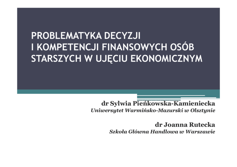 PROBLEMATYKA DECYZJI I KOMPETENCJI FINANSOWYCH OSÓB STARSZYCH W UJĘCIU EKONOMICZNYM dr Sylwia Pieńkowska-Kamieniecka Uniwersytet Warmińsko-Mazurski w Olsztynie dr Joanna Rutecka Szkoła Główna Handlowa w Warszawie • Celem artykułu jest analiza poziomu wiedzy finansowej i kompetencji finansowych osób starszych oraz zwrócenie uwagi na wybrane aspekty towarzyszące podejmowaniu przez nie decyzji inwestycyjnych. Kompetencje finansowe • Świadomość i wiedza finansowa na temat produktów i instytucji finansowych, jak również zdolności finansowe, rozumiane jako umiejętność planowania finansowego i zarządzania posiadanymi środkami pieniężnymi. Wiek minimalizujący błędy w decyzjach finansowych Wiek najwyższych kompetencji Błąd standardowy 55,9 4,2 53,3 5,2 45,8 50,3 49,6 7,9 6,0 5,0 56,0 8,0 Oprocentowanie kart kredytowych dla małych firm Opłata za opóźnienie spłaty kredytu na karcie kredytowej 61,8 7,9 51,9 4,9 Opłata za przekroczenie limitu na karcie kredytowej Opłata za wypłatę gotówki z karty kredytowej Średnia z powyższych badanych przypadków 54,0 54,8 53,3 5,0 4,9 4,3 Wyszczególnienie Oprocentowanie kredytu zabezpieczonego na nieruchomości Oprocentowanie linii kredytowej zabezpieczonej na nieruchomości Tzw. moment „eureka” Oprocentowanie kart kredytowych Oprocentowanie kredytów samochodowych Oprocentowanie kredytu hipotecznego na zakup nieruchomości Źródło: Agarwal S., Driscoll J.C., Gabaix X., Laibson D.I., 2008, The Age of Reason: Financial Decisions over the Lifecycle, „NBER Working Paper”, National Bureau of Economic Research, No. 13191, s. 26; Stańko D., 2013, Seniorzy w Polsce – perspektywa ekonomiczna, w: Osoby starsze na rynku usług finansowych. Analiza i zalecenia, Biuletyn RPO „Zasada równego traktowania – prawo i praktyka”, nr 4, Warszawa, s. 26. Poziom kompetencji finansowych osób starszych w odniesieniu do poszczególnych obszarów finansowych (w % poprawnie udzielonych odpowiedzi) Wiek Ogółem 60-69 lat 70-79 lat 80 lat i więcej 59,12 45,43 31,30 Podstawowa wiedza finansowa 59,18 44,62 32,79 Pożyczki i kredyty Inwestycje Ubezpieczenia 60,52 46,72 31,49 53,02 39,05 23,57 63,77 51,32 37,36 Źródło: opracowanie własne na podstawie Finke M.S., Howe J., Huston S.J., 2011, Old Age and the Decline in Financial Literacy, file:///C:/Users/USER/Downloads/SSRN-id1948627.pdf. Własna ocena kompetencji finansowych i obiektywna w zależności od wieku wśród osób w wieku 60-88 lat Pewność trafności wyboru Kompetencje finansowe i pewność (w %) Kompetencje finansowe Wiek (w latach) Źródło: S. Finke, J. Howe, S.J. Huston, Old Age and the Decline in Financial Literacy, August 2011, file:///C:/Users/USER/Downloads/SSRN-id1948627.pdf, s. 29. Poziom wiedzy ekonomicznej Polaków w zależności od wieku Średnia poprawnych odpowiedzi Wiek Odchylenie struktury demograficznej grupy od struktury próby według posiadanej wiedzy (w %) liczba w% niska średnia wysoka do 34 lat 8,7 43,5 -5 +2% +3% 35-54 lata 9,2 46,0 -12% +4 +8% 55 lat i więcej 6,3 31,5 +17% -5% -11% Źródło: opracowanie własne na podstawie Fundacja Kronenberga, 2009, Stan wiedzy finansowej Polaków, raport Fundacji Kronenberga przy Citi Handlowy, Dom Badawczy Maison, s. 118-119. • Emeryci i renciści w Polsce wydają największą część swojego dochodu rozporządzalnego (93,2% i 84,9% w 2012r.; średnia 82,2%). Przeciętne miesięczne dochody całkowite i rozporządzalne osób pracujących i emerytów w 2012 r (w zł) Źródło: opracowanie własne na podstawie Zakład Ubezpieczeń Społecznych, 2013, Ważniejsze informacje z zakresu ubezpieczeń społecznych. 2012, Warszawa oraz Główny Urząd Statystyczny, 2013, Budżety gospodarstw domowych w 2012 r., Główny Urząd Statystyczny, Warszawa. Najlepsze według Polaków sposoby oszczędzania na emeryturę Źródło: CBOS, 2010, Polacy o dodatkowym oszczędzaniu na emeryturę, komunikat nr BS/77/2010. Wnioski 1. Kompetencje finansowe spadają wraz z wiekiem. 2. Rosnący poziom skomplikowania produktów finansowych dedykowanym osobom starszym powoduje, iż tylko nieliczne jednostki są w stanie przeanalizować dostępną ofertę i wybrać propozycję najlepiej odpowiadającą ich potrzebom. 3. Produkt skierowany do rosnącej rzeszy emerytów powinien być produktem prostym, przejrzystym i tanim. 4. Osoby starsze w przyszłości będą bardzo dużym rynkiem dla instytucji finansowych. Summary • Financial competence of older adults has become one of the most significant problems in the ageing world. • People aged 65+ represent a huge group of consumers and potential investors on the financial markets. But financial decisions they take often do not meet their needs due to the fact that financial literacy decreases with age. • Lower analitical abilities of the old and fast development of financial products are usually not balanced by aquired experience resulting in nonoptimal decision-making. • oldest citizens (people aged 60 and over) have frequently problems with assessment and comparison of financial vehicles offered by numerous institutions. • Being aware of the shortage of their own financial knowledge and diminishing cognitive abilities they frequently choose products they are familiar with from the previous stages of their life. Poziom wiedzy finansowej oraz znajomość możliwości oszczędzania i inwestowania na rynku finansowym mam bardzo dobrą orientację w tej dziedzinie; 3% mam pewną orientację, wiedział(a)bym, jak zainwestować pieniądze; 18% trudno powiedzieć; 1% nie mam orientacji w sprawach finansowych; 44% mam słabą orientację w tej dziedzinie; 34% Źródło: opracowanie własne na podstawie CBOS, 2012, Polak na rynku finansowym, komunikat nr BS/152/2012.