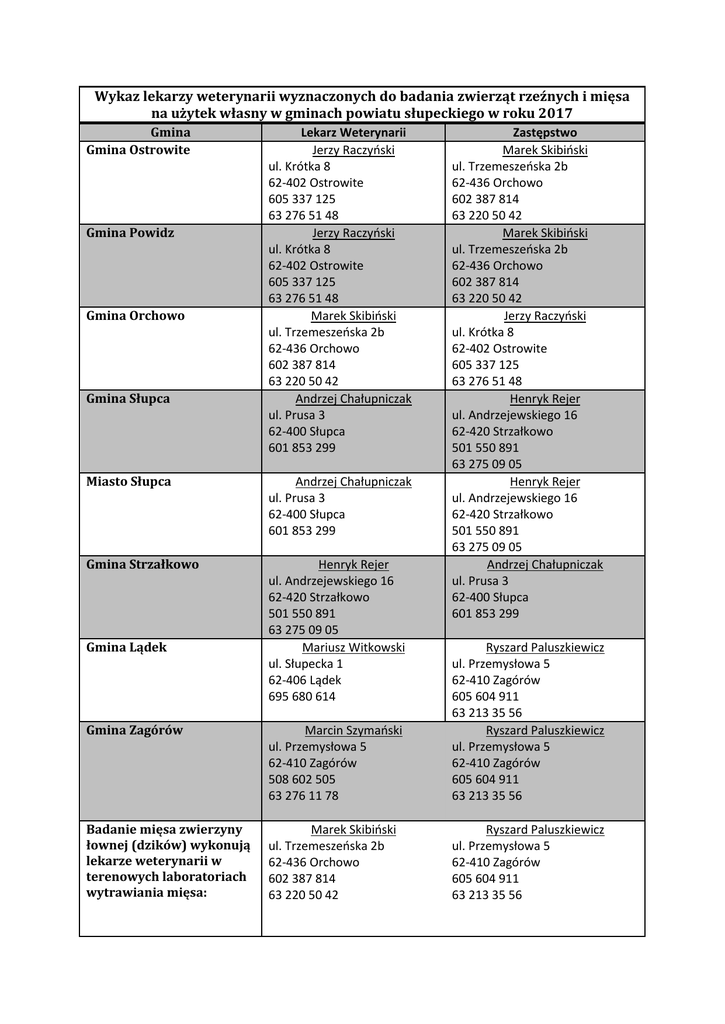 Wykaz lekarzy weterynarii wyznaczonych do badania zwierząt rzeźnych i mięsa na użytek własny w gminach powiatu słupeckiego w roku 2017 Gmina Gmina Ostrowite Gmina Powidz Gmina Orchowo Gmina Słupca Lekarz Weterynarii Jerzy Raczyński ul. Krótka 8 62-402 Ostrowite 605 337 125 63 276 51 48 Jerzy Raczyński ul. Krótka 8 62-402 Ostrowite 605 337 125 63 276 51 48 Marek Skibiński ul. Trzemeszeńska 2b 62-436 Orchowo 602 387 814 63 220 50 42 Andrzej Chałupniczak ul. Prusa 3 62-400 Słupca 601 853 299 Miasto Słupca Andrzej Chałupniczak ul. Prusa 3 62-400 Słupca 601 853 299 Gmina Strzałkowo Henryk Rejer ul. Andrzejewskiego 16 62-420 Strzałkowo 501 550 891 63 275 09 05 Mariusz Witkowski ul. Słupecka 1 62-406 Lądek 695 680 614 Gmina Lądek Zastępstwo Marek Skibiński ul. Trzemeszeńska 2b 62-436 Orchowo 602 387 814 63 220 50 42 Marek Skibiński ul. Trzemeszeńska 2b 62-436 Orchowo 602 387 814 63 220 50 42 Jerzy Raczyński ul. Krótka 8 62-402 Ostrowite 605 337 125 63 276 51 48 Henryk Rejer ul. Andrzejewskiego 16 62-420 Strzałkowo 501 550 891 63 275 09 05 Henryk Rejer ul. Andrzejewskiego 16 62-420 Strzałkowo 501 550 891 63 275 09 05 Andrzej Chałupniczak ul. Prusa 3 62-400 Słupca 601 853 299 Gmina Zagórów Marcin Szymański ul. Przemysłowa 5 62-410 Zagórów 508 602 505 63 276 11 78 Ryszard Paluszkiewicz ul. Przemysłowa 5 62-410 Zagórów 605 604 911 63 213 35 56 Ryszard Paluszkiewicz ul. Przemysłowa 5 62-410 Zagórów 605 604 911 63 213 35 56 Badanie mięsa zwierzyny łownej (dzików) wykonują lekarze weterynarii w terenowych laboratoriach wytrawiania mięsa: Marek Skibiński ul. Trzemeszeńska 2b 62-436 Orchowo 602 387 814 63 220 50 42 Ryszard Paluszkiewicz ul. Przemysłowa 5 62-410 Zagórów 605 604 911 63 213 35 56