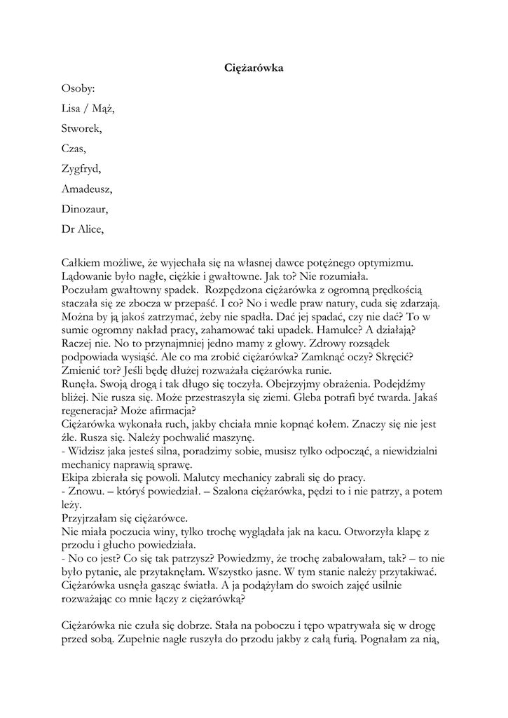 Ciężarówka Osoby: Lisa / Mąż, Stworek, Czas, Zygfryd, Amadeusz, Dinozaur, Dr Alice, Całkiem możliwe, że wyjechała się na własnej dawce potężnego optymizmu. Lądowanie było nagłe, ciężkie i gwałtowne. Jak to? Nie rozumiała. Poczułam gwałtowny spadek. Rozpędzona ciężarówka z ogromną prędkością staczała się ze zbocza w przepaść. I co? No i wedle praw natury, cuda się zdarzają. Można by ją jakoś zatrzymać, żeby nie spadła. Dać jej spadać, czy nie dać? To w sumie ogromny nakład pracy, zahamować taki upadek. Hamulce? A działają? Raczej nie. No to przynajmniej jedno mamy z głowy. Zdrowy rozsądek podpowiada wysiąść. Ale co ma zrobić ciężarówka? Zamknąć oczy? Skręcić? Zmienić tor? Jeśli będę dłużej rozważała ciężarówka runie. Runęła. Swoją drogą i tak długo się toczyła. Obejrzyjmy obrażenia. Podejdźmy bliżej. Nie rusza się. Może przestraszyła się ziemi. Gleba potrafi być twarda. Jakaś regeneracja? Może afirmacja? Ciężarówka wykonała ruch, jakby chciała mnie kopnąć kołem. Znaczy się nie jest źle. Rusza się. Należy pochwalić maszynę. - Widzisz jaka jesteś silna, poradzimy sobie, musisz tylko odpocząć, a niewidzialni mechanicy naprawią sprawę. Ekipa zbierała się powoli. Malutcy mechanicy zabrali się do pracy. - Znowu. – któryś powiedział. – Szalona ciężarówka, pędzi to i nie patrzy, a potem leży. Przyjrzałam się ciężarówce. Nie miała poczucia winy, tylko trochę wyglądała jak na kacu. Otworzyła klapę z przodu i głucho powiedziała. - No co jest? Co się tak patrzysz? Powiedzmy, że trochę zabalowałam, tak? – to nie było pytanie, ale przytaknęłam. Wszystko jasne. W tym stanie należy przytakiwać. Ciężarówka usnęła gasząc światła. A ja podążyłam do swoich zajęć usilnie rozważając co mnie łączy z ciężarówką? Ciężarówka nie czuła się dobrze. Stała na poboczu i tępo wpatrywała się w drogę przed sobą. Zupełnie nagle ruszyła do przodu jakby z całą furią. Pognałam za nią, ale już było za późno. Odbijała się od pobocza do pobocza jak pijana. Całkiem zwariowała, pomyślałam. I co teraz? W końcu głucho uderzyła o drzewo i zamarła. Pozornie nic jej się nie stało. Nawet obrażeń nie miała żadnych. Ostrożnie podeszłam bliżej. Jak ona to robiła? Musi być szalona. - Uspokój się, bo cię zamkną i nie będziesz miała drogi. – powiedziałam. Zupełnie jakby na te słowa ciężarówka zawarczała, spięła się w sobie i ruszyła do przodu z górki. O Boże na krechę. Wariatka. Pobiegłam za nią. Wcale nie musiałam gonić szalonej ciężarówki, ale jakoś tak czułam się odpowiedzialna, zatem biegłam co sił. Jak już dobiegłam, ciężarówka stała nieruchomo, czyli podobnie jak przed chwilą. Uznałam, że muszę się liczyć ze zdecydowanie małą przewidywalnością pojazdu. - Cześć. – powiedziała ciężarówka, jakby właśnie mnie zauważyła, a potem uśmiechnęła się. Na szczęście już nie szaleńczo. - Dobrze się czujesz? – ostrożność nie zawadzi. - Cudownie. – zgrzytnęła. - Aha. – przytaknęłam też na wszelki wypadek. – Dobrze cię widzieć. – starałam się podtrzymać konwersację. - Ciebie też. – zgodziła się ze mną. – Dawno tu jesteś? - Nie, dotarłam przed chwilą. – uznałam, że cokolwiek powiem i tak jest bez znaczenia. Liczy się, że w ogóle mnie zauważyła i że rozmawiamy. - Aha. – przytaknęła zaciskając mocniej klapę. - E…. – nie wiedziałam co powiedzieć, ale wiedziałam, że coś należało. – Fajny miałaś dzień? – spytałam głupio. - Fantastyczny. – odparła złowieszczo ciężarówka. - No tak, no tak. - starałam się. – To może się przejdziemy? – zaproponowałam równie głupio. - Możemy. Mogę cię podwieźć. – zaofiarowała się - Hmmm… - nie mogłam odmówić, wyglądała na wrażliwą. – No dobrze, bardzo chętnie. – zdobyłam się na zachwyt. Udawałam, że wsiadam na luzaka. Czy mi się wydawało, czy w powietrzu coś się czaiło. - Co to za zapach? – spytałam niby lekko. - To zapowiedź frajdy. – usłyszałam i powiało grozą. Ciężarówka ruszyła. Jak na moje oko za szybko i znów było z górki. - Gdzie masz hamulce? – spytałam niby wesoło. - Nie mam hamulców. – odpowiedziała słodko – Na tym to polega, zatrzymuję się jak już jest po fakcie, rozumiesz? Jak zadziałają siły wyższe. O Matko! Co teraz? Nie panikować , nakazałam sobie. To jest normalne u niej, ona nie ma hamulców. Nic wielkiego, przecież się zatrzymamy jakoś. - A paliwo masz? – pytanie wydało mi się przytomne. - Mam. – pochwaliła się. – Jeżdżę na gazie. - To widzę. – wyrwało mi się. – A kto cię dopełnia? … tego… - bez sensu chciałam się tłumaczyć, ona zrozumiała. - Siły wyższe. – odparła jakby z oddali, bo już leciała naprzód niby w amoku. - A co to siły wyższe? – robiło mi się niedobrze. - Takie, co ich nie widać, a są. Czujesz? - Czuję. – odparłam na wszelki wypadek. – Czemu to robisz? - Co? - No tak pędzisz co chwila, a potem stajesz. - Nie mam pojęcia. - Nie boli cię jak tak nagle na coś wpadasz? – szukałam desperacko przyczyny. - Boli. – przyznała. - A nie chciałabyś, żeby nie bolało? – wydawało się, że wpadłam na właściwy tor. - No co ty, nie można mieć wszystkiego. – gdyby mogła popatrzyłaby na mnie jak na debilkę. Nagle coś gwałtownie zatrzęsło, rzuciło mną do przodu, ciężarówka odskoczyła jakby wystraszona. - E… z materiałem na pokładzie nie stukam drzewa. – powiedziała ciężarówka. – dobrze z tobą? - Dobrze. – odparłam. Trzęsły mi się tylko ręce, a żołądek przeszedł rewolucję. - To dobrze, wyłaź. – zażądała ciężarówka. - Dlaczego? – poczułam nagły opór przed opuszczeniem pojazdu. - Wyłaź, nie będę się tłumaczyć. - Nie wyjdę. – postanowiłam. - No dobra