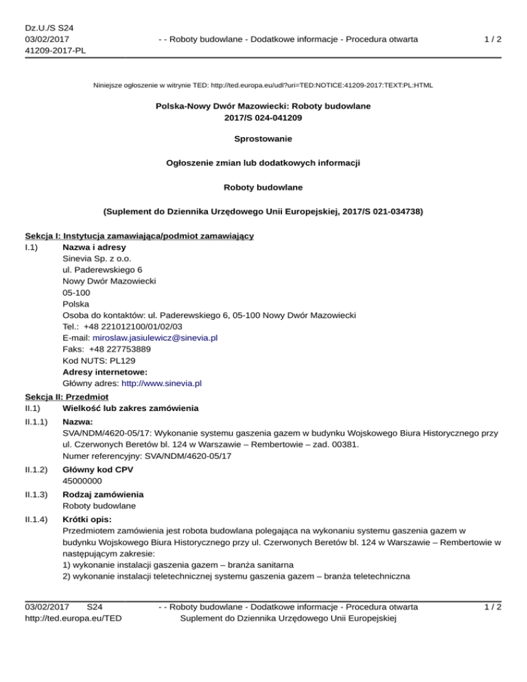 Dz.U./S S24 03/02/2017 41209-2017-PL - - Roboty budowlane - Dodatkowe informacje - Procedura otwarta 1/2 Niniejsze ogłoszenie w witrynie TED: http://ted.europa.eu/udl?uri=TED:NOTICE:41209-2017:TEXT:PL:HTML Polska-Nowy Dwór Mazowiecki: Roboty budowlane 2017/S 024-041209 Sprostowanie Ogłoszenie zmian lub dodatkowych informacji Roboty budowlane (Suplement do Dziennika Urzędowego Unii Europejskiej, 2017/S 021-034738) Sekcja I: Instytucja zamawiająca/podmiot zamawiający I.1) Nazwa i adresy Sinevia Sp. z o.o. ul. Paderewskiego 6 Nowy Dwór Mazowiecki 05-100 Polska Osoba do kontaktów: ul. Paderewskiego 6, 05-100 Nowy Dwór Mazowiecki Tel.: +48 221012100/01/02/03 E-mail: [email protected] Faks: +48 227753889 Kod NUTS: PL129 Adresy internetowe: Główny adres: http://www.sinevia.pl Sekcja II: Przedmiot II.1) Wielkość lub zakres zamówienia II.1.1) Nazwa: SVA/NDM/4620-05/17: Wykonanie systemu gaszenia gazem w budynku Wojskowego Biura Historycznego przy ul. Czerwonych Beretów bl. 124 w Warszawie – Rembertowie – zad. 00381. Numer referencyjny: SVA/NDM/4620-05/17 II.1.2) Główny kod CPV 45000000 II.1.3) Rodzaj zamówienia Roboty budowlane II.1.4) Krótki opis: Przedmiotem zamówienia jest robota budowlana polegająca na wykonaniu systemu gaszenia gazem w budynku Wojskowego Biura Historycznego przy ul. Czerwonych Beretów bl. 124 w Warszawie – Rembertowie w następującym zakresie: 1) wykonanie instalacji gaszenia gazem – branża sanitarna 2) wykonanie instalacji teletechnicznej systemu gaszenia gazem – branża teletechniczna 03/02/2017 S24 http://ted.europa.eu/TED - - Roboty budowlane - Dodatkowe informacje - Procedura otwarta Suplement do Dziennika Urzędowego Unii Europejskiej 1/2 Dz.U./S S24 03/02/2017 41209-2017-PL - - Roboty budowlane - Dodatkowe informacje - Procedura otwarta 2/2 3) przeniesienie urządzeń z tymczasowego pomieszczenia LCN znajdującego się w łączniku do pomieszczenia docelowego zgodnego z dokumentacją projektową, 4) uruchomienie i ponowne programowanie zainstalowanego systemu gaszenia gazem. Sekcja VI: Informacje uzupełniające VI.5) Data wysłania niniejszego ogłoszenia: 01/02/2017 VI.6) Numer pierwotnego ogłoszenia Numer ogłoszenia w Dz.Urz. UE – OJ/S: 2017/S 021-034738 Sekcja VII: Zmiany VII.1) Informacje do zmiany lub dodania VII.1.2) Tekst, który należy poprawić w pierwotnym ogłoszeniu Numer sekcji: III.1.3 Zamiast: Wykonawca spełni warunek jeżeli wykaże, że wykonał w okresie ostatnich 5 lat przed upływem terminu składania ofert, a jeżeli okres prowadzenia działalności jest krótszy – w tym okresie, co najmniej 2 roboty budowlane odpowiadające swoim rodzajem robocie budowlanej stanowiącej przedmiot zamówienia tj. systemu gaszenia gazem o wartości co najmniej 600 000 000 PLN brutto każda wraz z dowodami, że roboty zostały wykonane zgodnie z zasadami sztuki budowlanej i prawidłowo ukończone. Powinno być: Wykonawca spełni warunek jeżeli wykaże, że wykonał w okresie ostatnich pięciu lat przed upływem terminu składania ofert, a jeżeli okres prowadzenia działalności jest krótszy – w tym okresie, co najmniej 2 roboty budowlane odpowiadające swoim rodzajem robocie budowlanej stanowiącej przedmiot zamówienia tj. systemu gaszenia gazem o wartości co najmniej 600 000 PLN brutto każda wraz z dowodami, że roboty zostały wykonane zgodnie z zasadami sztuki budowlanej i prawidłowo ukończone. VII.2) Inne dodatkowe informacje: 03/02/2017 S24 http://ted.europa.eu/TED - - Roboty budowlane - Dodatkowe informacje - Procedura otwarta Suplement do Dziennika Urzędowego Unii Europejskiej 2/2
