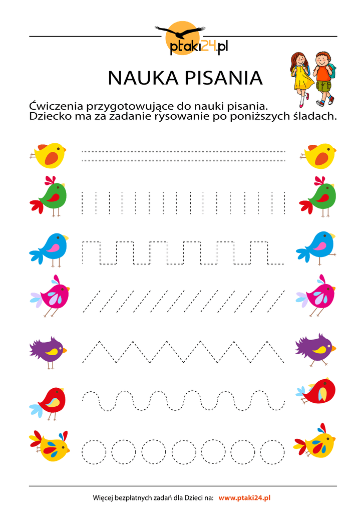 NAUKA PISANIA Ćwiczenia przygotowujące do nauki pisania. Dziecko ma za zadanie rysowanie po poniższych śladach. Więcej bezpłatnych zadań dla Dzieci na: www.ptaki24.pl