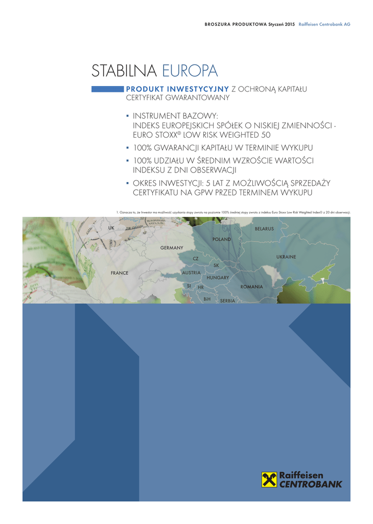 BROSZURA PRODUKTOWA Styczeń 2015 Raiffeisen Centrobank AG STABILNA EUROPA PRODUKT INWEST YCYJNY Z OCHRONĄ KAPITAŁU CERTYFIKAT GWARANTOWANY ▪▪ INSTRUMENT BAZOWY: ▪ INDEKS EUROPEJSKICH SPÓŁEK O NISKIEJ ZMIENNOŚCI -▪ EURO STOXX® LOW RISK WEIGHTED 50 ▪▪ 100% GWARANCJI KAPITAŁU W TERMINIE WYKUPU ▪▪ 100% UDZIAŁU W ŚREDNIM WZROŚCIE WARTOŚCI ▪ INDEKSU Z DNI OBSERWACJI ▪▪ OKRES INWESTYCJI: 5 LAT Z MOŻLIWOŚCIĄ SPRZEDAŻY▪ CERTYFIKATU NA GPW PRZED TERMINEM WYKUPU RUSSIA 1. Oznacza to, że Inwestor ma możliwość uzyskania stopy zwrotu na poziomie 100% średniej stopy zwrotu z indeksu Euro Stoxx Low Risk Weighted Index® z 20 dni obserwacji. UK BELARUS POLAND GERMANY UKRAINE CZ SK AUSTRIA FRANCE SI HUNGARY ROMANIA HR BiH SPAIN ITALY SERBIA M BULGARIA KS MK TURKEY Raiffeisen Centrobank AG Stabilna Europa WZROSTOWY POTENCJAŁ EUROPEJSKICH BLUE CHIPÓW Inwestycja w certyfikat strukturyzowany RCB – Stabilna Europa daje Inwestorowi możliwość uzyskania stopy zwrotu na poziomie 100% średniej stopy zwrotu indeksu z 20 dni obserwacji. W przypadku, gdy średnia stopa zwrotu z indeksu jest ujemna lub zerowa, Inwestor w dniu wykupu otrzymuje zwrot w wysokości 100% zainwestowanego kapitału (wyłączając opłatę subskrypcyjną). Wykup certyfikatów nastąpi w styczniu 2020 r. NAJWAŻNIEJSZE INFORMACJE Emitent Raiffeisen Centrobank AG Gwarant* Raiffeisen Centrobank AG ISIN AT0000A1BSS0 Nazwa skrócona RCGBSH10120 Wartość nominalna 1000 zł Cena emisyjna 1000 zł Opłata subskrypcyjna do 10 zł1 Min. wielkość zapisu 5 certyfikatów Subskrypcja2 08.01. - 27.01.2015 Dzień pierwszej wyceny 28.01.2015 Dzień ostatecznej wyceny 28.01.2020 Dzień wykupu 30.01.2020 Ochrona kapitału 100% ▪ w dniu wykupu Wartość gwarantowana 1000 zł ▪ w dniu wykupu Obserwacja roczna Dni obserwacji28.04.15, 28.07.15, 28.10.15, 28.01.16, 28.04.16, 28.07.16, 28.10.16, 30.01.17, 28.04.17, 28.07.17, 30.10.17, 29.01.18, 30.04.18, 30.07.18, 29.10.18, 28.01.19, 29.04.19, 29.07.19, 28.10.19, 28.01.20 Współczynnik partycypacji 100% Kwota wykupu Inwestor otrzymuje sumę wartości gwarantowanej 1000 zł oraz iloczynu ceny emisyjnej, współczynnika udziału i średniej stopy zwrotu indeksu▪ z 20 dni obserwacji (ponad 100% stanu początkowego indeksu) lub,▪ w przypadku gdy stopa zwrotu indeksu wyniesie poniżej 100% stanu początkowego, wypłatę wartości gwarantowanej równej 1000 zł za każdy Certyfikat (wykup przez Raiffeisen Centrobank AG* w terminie zapadalności). Notowania GPW3 Aktualna cena www.rcb.at * Raiffeisen Centrobank AG należy▪ w 100 % do Raiffeisen Bank▪ International AG – rating RBI:▪ www.rbinternational.com/ir/ratings 1. Możliwość negocjacji opłaty subskrybcyjnej w zależności od wielkości zapisów. 2. Raiffeisen Centrobank AG zastrzega sobie prawo do przedwczesnego zakończenia lub wydłużenia okresu subskrypcji. 3. Intencją Emitenta jest ubieganie się o dopuszczenie Certyfikatów do obrotu na GPW. W najbliższych kwartałach poprawa kondycji światowej gospodarki powinna wpłynąć na rozwój wartości światowych indeksów. Z poprawy koniunktury powinny skorzystać również europejskie akcje, które są wyceniane atrakcyjnie względem ich amerykańskich odpowiedników oraz względem oczekiwanych wyników spółek. ▫▫ Certyfikat gwarantowany Stabilna Europa umożliwia udział we wzrostach notowań indeksu europejskich spółek o najniższej zmienności - EURO STOXX® Low Risk Weighted 50 Index. Jednocześnie produkt posiada wbudowany mechanizm zabezpieczenia ryzyka walutowego . Zasady funkcjonowania Potencjalny zysk dla Inwestora zależny jest od średniego wzrostu wartości indeksu ▪ z 20 dni obserwacji (obserwacja kwartalna). W dniu pierwszej wyceny (28.01.2015r.) określony zostaje kurs początkowy indeksu (kurs zamknięcia). Raz na kwartał – w wyznaczonych dniach obserwacji – weryfikowany jest poziom ceny zamknięcia indeksu, który następnie jest porównywany z jego kursem początkowym w celu wyliczenia procentowej stopy zwrotu. W terminie wykupu wyliczana jest średnia stopa zwrotu indeksu z 20 dni obserwacji. Uśrednienie stóp zwrotu daje Inwestorowi szansę na pozytywną stopę zwrotu, nawet gdy w więcej niż w jednym z dni obserwacji indeks zanotuje spadek ▪ (w porównaniu z poziomem początkowym). Jeśli tak obliczona zmiana jest nieujemna wówczas wypłatę stanowi suma wartości gwarantowanej 1000 zł oraz iloczynu ceny emisyjnej, współczynnika udziału i średniej stopy zwrotu z indeksu z 20 dni obserwacji (powyżej lub na równi kursu indeksu z dnia pierwszej wyceny). W przypadku ujemnej stopy zwrotu indeksu, kapitał Inwestora chroniony jest w 100% ceny emisyjnej Certyfikatu, czyli Inwestor otrzyma 1000 zł za każdy Certyfikat. ▪ W dniu ostatecznej wyceny może wystąpić jeden z dwóch scenariuszy: SCENARIUSZ 1: Średnia stopa zwrotu indeksu z 20 dni obserwacji jest nieujemna Dodatnia średnia stopa zwrotu indeksu z 20 dni obserwacji (powyżej lub na równi kursu indeksu z dnia pierwszej wyceny) jest pomnożona przez współczynnik udziału 100% i cenę emisyjną. Następnie ten zysk wraz z wartością gwarantowaną (1000 zł) wypłacony jest Inwestorowi. Górna granica zysku nie jest ograniczona żadnym limitem. Minimalna kwota po której wykupiony zostanie certyfikat to 1000 zł. www.rcb.at Kapitał jest chroniony wyłącznie w dniu wykupu w wysokości 100% ceny emisyjnej Certyfikatu. Przed terminem wykupu może dojść do wahań wartości rynkowej Certyfikatu poniżej wartości nominalnej, lecz ▪ w dniu wykupu Inwestor otrzyma minimalnie 100% ceny emisyjnej. Gwarantem ochrony jest Raiffeisen Centrobank AG. PRZYKŁADOWY Wykup = Wartość Gwarantowana + 100% średniej stopy zwrotu INDEKSU ŚREDNIA STOPA ZWROTU Z INDEKSU Z 20 DNI OBSERWACJI WARTOŚĆ WYKUPU CERTYFIKATU +50% 50% x 1000 zł + 1000 zł 1500 zł +25% 25% x 1000 zł + 1000 zł 1250 zł +4% 4% x 1000 zł + 1000 zł 1040 zł 0% 1000 zł Price EUR
