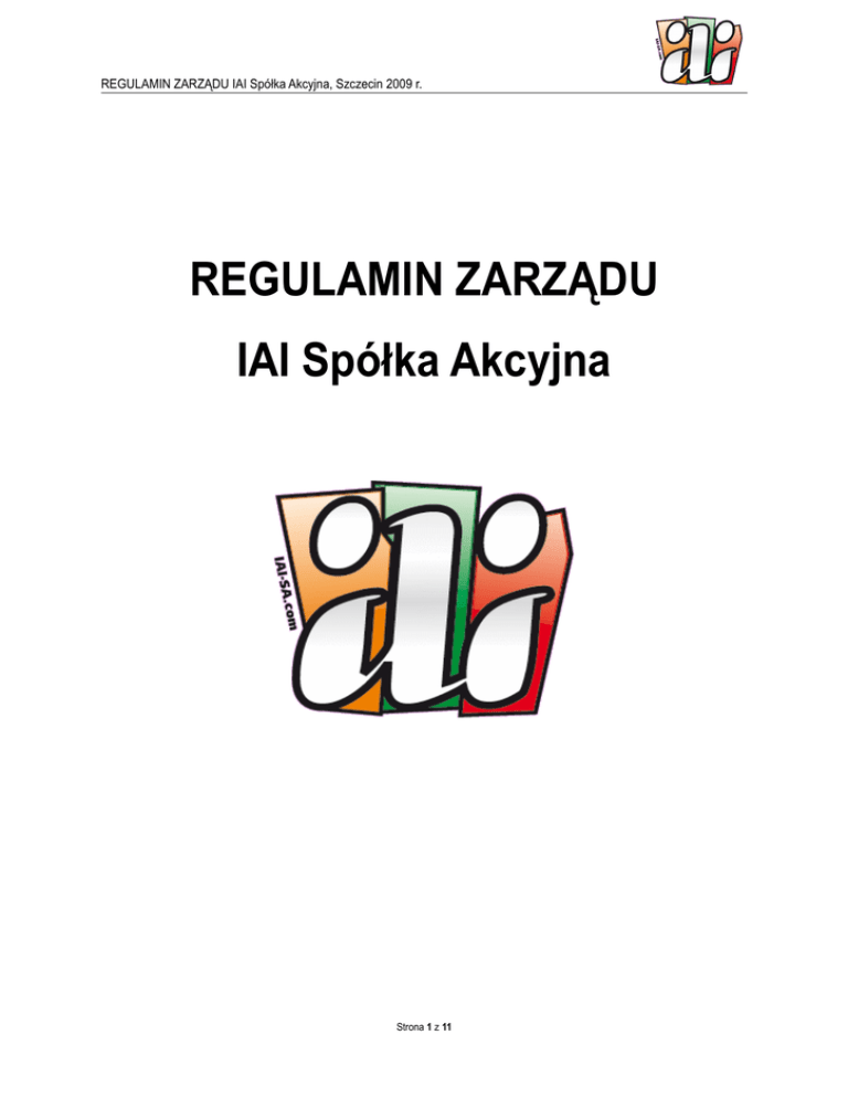 REGULAMIN ZARZĄDU IAI Spółka Akcyjna, Szczecin 2009 r. REGULAMIN ZARZĄDU IAI Spółka Akcyjna Strona 1 z 11 REGULAMIN ZARZĄDU IAI Spółka Akcyjna, Szczecin 2009 r. Szczecin 2009 §1 Postanowienia ogólne 1. Regulamin określa zakres działania Zarządu IAI Spółka Akcyjna („Zarząd”), w szczególności tryb powoływania i odwoływania Członków Zarządu, strukturę Zarządu, jego zadania oraz tryb podejmowania uchwał. 2. Zarząd jest statutowym organem zarządzającym i wykonawczym IAI Spółka Akcyjna („Spółka”) działającym na podstawie przepisów Kodeksu spółek handlowych, Statutu Spółki oraz niniejszego Regulaminu zatwierdzonego przez Walne Zgromadzenie. 3. Członkowie Zarządu odpowiadają za należyte prowadzenie spraw Spółki. Członek Zarządu odpowiada za szkodę wyrządzoną przez swoją działalność sprzeczną z prawem lub Statutem Spółki, chyba że nie ponosi winy. Przy wykonywaniu swoich obowiązków Członkowie Zarządu winni dołożyć należytej staranności, wynikającej z zawodowego charakteru swojej działalności. §2 Struktura Zarządu, jego powołanie i odwołanie 1. Liczbę członków Zarządu, w granicach określonych Statutem, ustala Walne Zgromadzenie. W skład Zarządu wchodzą Prezes, Wiceprezesi i Członkowie Zarządu powołani przez Walne Zgromadzenie w trybie określonym przepisami Statutu. Na wniosek Prezesa Zarządu Walne Zgromadzenie może powierzyć jednemu z Wiceprezesów pełnienie funkcji I Wiceprezesa, o ile wcześniej z tego przywileju nie skorzystali Akcjonariusze-Założyciele. 2. Prawo członków Zarządu do wykonywania czynności zarządu oraz do reprezentowania Spółki powstaje z dniem powołania określonym w uchwale Walnego Zgromadzenia. 3. Uprawnienia członków Zarządu do reprezentowania Spółki nie mogą być ograniczone ze skutkiem prawnym wobec osób trzecich. 4. Walne Zgromadzenie powołuje i odwołuje członków Zarządu, a także ustala ich Wynagrodzenie. Umowy z członkami Zarządu zawiera, zmienia i rozwiązuje Rada Nadzorcza reprezentowana przez Przewodniczącego Rady. 5. Akcjonariuszom-Założycielom przysługuje osobiste uprawnienie do powoływania i odwoływania Członków Zarządu, wraz ze wskazaniem pełnionej funkcji w Zarządzie, przy czym w przypadku Zarządu dwuosobowego Akcjonariuszom-Założycielom działającym łącznie przysługuje prawo powołania jednego Członka Zarządu z jednoczesnym wskazaniem pełnionej przez niego funkcji. Jeżeli Zarząd jest co najmniej trzyosobowy prawo powołania jednego Członka Zarządu z jednoczesnym wskazaniem pełnionej przez niego funkcji przysługuje każdemu Akcjonariuszowi-Założycielowi samodzielnie, z tym że pierwszeństwo powołania Członka Zarządu z jednoczesnym wskazaniem pełnionej przez niego funkcji przysługuje Akcjonariuszowi-Założycielowi – Pawłowi Fornalskiemu. Strona 2 z 11 REGULAMIN ZARZĄDU IAI Spółka Akcyjna, Szczecin 2009 r. 6. Uprawnienie do powoływania i odwoływania Członków Zarządu jest wykonywane w drodze doręczanego Spółce pisemnego oświadczenia o powołaniu lub odwołaniu Członka Zarządu. 7. W przypadku nie skorzystania przez Akcjonariuszy-Założycieli z prawa powołania Członków Zarządu prawo to wraz ze wskazaniem pełnionej funkcji w Zarządzie przysługuje Walnemu Zgromadzeniu. Dotyczy to także powoływania pozostałych Członków Zarządu, nie powołanych przez Akcjonariuszy-Założycieli. W takiej sytuacji wszczynana jest procedura postępowania kwalifikacyjnego na stanowisko Członka Zarządu. 8. W toku jednego postępowania kwalifikacyjnego można wyłaniać jednego lub więcej kandydatów do składu Zarządu. 9. Rada Nadzorcza niezwłocznie zwraca się do Zarządu z żądaniem zwołania Walnego Zgromadzenia w celu powołania Członka Zarządu, a następnie wszczyna postępowanie kwalifikacyjne, określając, w drodze uchwały, w szczególności: 1) stanowisko Członka Zarządu będące przedmiotem postępowania; 2) termin i miejsce przyjmowania zgłoszeń kandydatów; 3) data otwarcia zgłoszeń; 4) termin Walnego Zgromadzenia podczas którego nastąpi głosowanie w sprawie wyboru Członka Zarządu; 5) termin, miejsce i sposób uzyskiwania przez kandydatów informacji o Spółce; 6) termin i miejsce publikacji ogłoszenia o postępowaniu oraz treść tego ogłoszenia; 7) sposób informowania kandydatów o wynikach postępowania. 10. Kandydat składa zgłoszenie zawierające: 1) imię i nazwisko kandydata, 2) datę urodzenia, 3) miejsce zamieszkania, 4) adres do korespondencji i kontakt telefoniczny, 5) życiorys kandydata ze szczególnym uwzględnieniem wykształcenia oraz dotychczasowego przebiegu pracy zawodowej, 6) adres obecnego miejsca pracy. 11. Do zgłoszenia o którym w mowa w § 2 ust. 10 dołącza się w oryginałach lub odpisach, dokumenty potwierdzające kwalifikacje kandydata oraz oświadczenie o: 1) ukończeniu studiów wyższych; 2) co najmniej pięcioletnim stażu pracy na stanowisku dyrektorskim lub kierowniczym; 3) korzystaniu z pełni praw publicznych; 4) posiadaniu pełnej zdolności do czynności prawnych; 5) niepodleganiu określonym w przepisach prawa ograniczeniom lub zakazom zajmowania stanowiska członka zarządu w spółkach handlowych. 12. Rada nadzorcza może w każdym czasie, bez podania przyczyn, zakończyć postępowanie kwalifikacyjne bez wyłaniania kandydatów. Strona 3 z 11 REGULAMIN ZARZĄDU IAI Spółka Akcyjna, Szczecin 2009 r. 13. Termin przyjmowania zgłoszeń nie może być krótszy niż 14 dni od dnia publikacji ogłoszenia o postępowaniu kwalifikacyjnym. 14. Zgłoszenia kandydatów niespełniające wymogów określonych w ogłoszeniu o postępowaniu kwalifikacyjnym oraz złożone po upływie terminu określonego do ich przyjmowania nie podlegają rozpatrzeniu. 15. Dopuszczenie przez Radę Nadzorczą choćby jednego kandydata wystarcza do przeprowadzenia dalszego postępowania kwalifikacyjnego. 16. Wyłonienie najlepszego kandydata następuje w dro