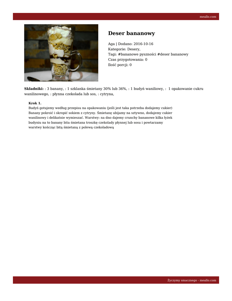 meallo.com Deser bananowy Aga | Dodano: 2016-10-16 Kategorie: Desery, Tagi: #bananowe pyszności #deser bananowy Czas przygotowania: 0 Ilość porcji: 0 Składniki: : 3 banany, : 1 szklanka śmietany 30% lub 36%, : 1 budyń waniliowy, : 1 opakowanie cukru wanilinowego, : płynna czekolada lub sos, : cytryna, Krok 1. Budyń gotujemy według przepisu na opakowaniu (jeśli jest taka potrzeba dodajemy cukier) Banany pokroić i skropić sokiem z cytryny. Śmietanę ubijamy na sztywno, dodajemy cukier wanilinowy i delikatnie wymieszać. Warstwy: na dno dajemy crunchy bananowe kilka łyżek budyniu na to banany bita śmietana troszkę czekolady płynnej lub sosu i powtarzamy warstwy kończąc bitą śmietaną z polewą czekoladową Życzymy smacznego - meallo.com
