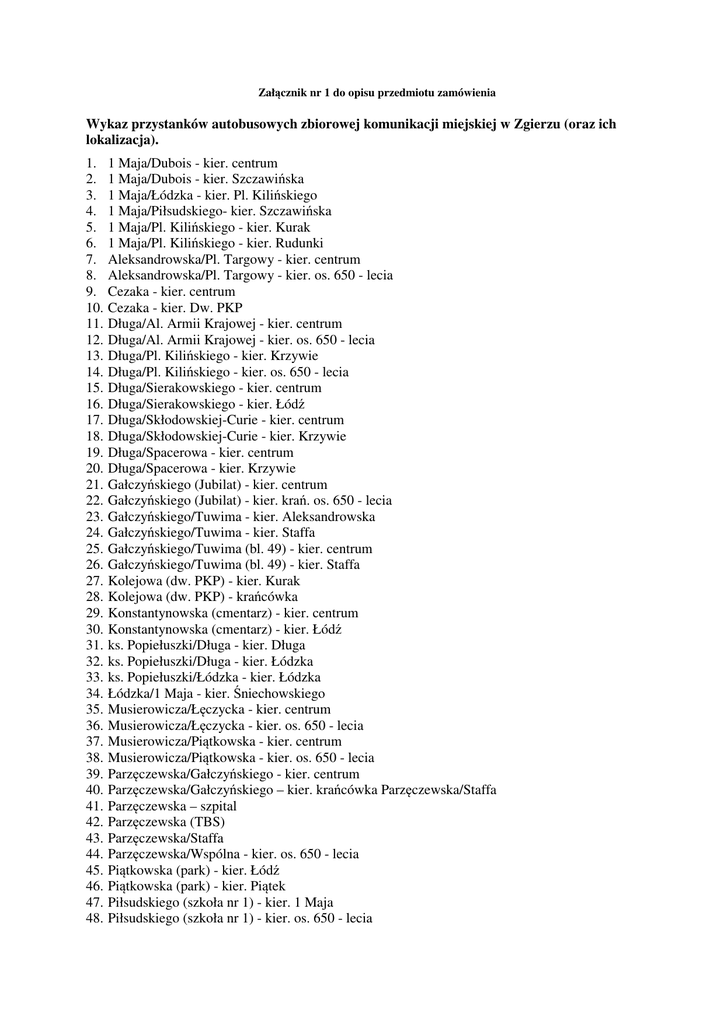 Załącznik nr 1 do opisu przedmiotu zamówienia Wykaz przystanków autobusowych zbiorowej komunikacji miejskiej w Zgierzu (oraz ich lokalizacja). 1. 2. 3. 4. 5. 6. 7. 8. 9. 10. 11. 12. 13. 14. 15. 16. 17. 18. 19. 20. 21. 22. 23. 24. 25. 26. 27. 28. 29. 30. 31. 32. 33. 34. 35. 36. 37. 38. 39. 40. 41. 42. 43. 44. 45. 46. 47. 48. 1 Maja/Dubois - kier. centrum 1 Maja/Dubois - kier. Szczawińska 1 Maja/Łódzka - kier. Pl. Kilińskiego 1 Maja/Piłsudskiego- kier. Szczawińska 1 Maja/Pl. Kilińskiego - kier. Kurak 1 Maja/Pl. Kilińskiego - kier. Rudunki Aleksandrowska/Pl. Targowy - kier. centrum Aleksandrowska/Pl. Targowy - kier. os. 650 - lecia Cezaka - kier. centrum Cezaka - kier. Dw. PKP Długa/Al. Armii Krajowej - kier. centrum Długa/Al. Armii Krajowej - kier. os. 650 - lecia Długa/Pl. Kilińskiego - kier. Krzywie Długa/Pl. Kilińskiego - kier. os. 650 - lecia Długa/Sierakowskiego - kier. centrum Długa/Sierakowskiego - kier. Łódź Długa/Skłodowskiej-Curie - kier. centrum Długa/Skłodowskiej-Curie - kier. Krzywie Długa/Spacerowa - kier. centrum Długa/Spacerowa - kier. Krzywie Gałczyńskiego (Jubilat) - kier. centrum Gałczyńskiego (Jubilat) - kier. krań. os. 650 - lecia Gałczyńskiego/Tuwima - kier. Aleksandrowska Gałczyńskiego/Tuwima - kier. Staffa Gałczyńskiego/Tuwima (bl. 49) - kier. centrum Gałczyńskiego/Tuwima (bl. 49) - kier. Staffa Kolejowa (dw. PKP) - kier. Kurak Kolejowa (dw. PKP) - krańcówka Konstantynowska (cmentarz) - kier. centrum Konstantynowska (cmentarz) - kier. Łódź ks. Popiełuszki/Długa - kier. Długa ks. Popiełuszki/Długa - kier. Łódzka ks. Popiełuszki/Łódzka - kier. Łódzka Łódzka/1 Maja - kier. Śniechowskiego Musierowicza/Łęczycka - kier. centrum Musierowicza/Łęczycka - kier. os. 650 - lecia Musierowicza/Piątkowska - kier. centrum Musierowicza/Piątkowska - kier. os. 650 - lecia Parzęczewska/Gałczyńskiego - kier. centrum Parzęczewska/Gałczyńskiego – kier. krańcówka Parzęczewska/Staffa Parzęczewska – szpital Parzęczewska (TBS) Parzęczewska/Staffa Parzęczewska/Wspólna - kier. os. 650 - lecia Piątkowska (park) - kier. Łódź Piątkowska (park) - kier. Piątek Piłsudskiego (szkoła nr 1) - kier. 1 Maja Piłsudskiego (szkoła nr 1) - kier. os. 650 - lecia 49. 50. 51. 52. 53. 54. 55. 56. 57. 58. 59. 60. 61. 62. 63. 64. 65. 66. 67. 68. 69. 70. 71. 72. 73. 74. 75. 76. 77. Piłsudskiego 36/1 Maja Piłsudskiego 31/Czerwieńskiego Piłsudskiego/Graniczna - kier. Pl. Kilińskiego Piłsudskiego/Graniczna - kier. Szczawińska Piątkowska/Północna - kier. Piątek Powstańców Śląskich (krańcówka) Sieradzka/Łódzka - kier. centrum Staffa (os. 650-lecia) - kier. centrum Staffa (os. 650-lecia) - kier. krańcówka Staffa (przychodnia) - kier. centrum Staffa (przychodnia) - kier. krańcówka Staffa (szkoła) - kier. krańcówka Szczawińska/Dzika - kier. centrum Szczawińska/Dzika - kier. krańcówka Szczawińska/Fijałkowskiego - kier. centrum Szczawińska/Fijałkowskiego - kier. krańcówka Szczawińska/Przemysłowa - kier. centrum Szczawińska/Przemysłowa - kier. krańcówka Szczawińska/Szkudlarska (ZUT) - centrum Szczawińska/Szkudlarska (ZUT) - kier. krańcówka Śniechowskiego/Łódzka - kier. centrum Śniechowskiego/Łódzka - kier. Konstant. Śniechowskiego/Rondo Sybiraków - kier. centrum Śniechowskiego/Rondo Sybiraków - kier. Konstant. Targowa/Pl. Targowy - kier. centrum Tuwima (Sezam) - kier. centrum Tuwima (Sezam) - kier. krańcówka Staffa Tuwima/Boya-Żeleńskiego - kier. centrum Tuwima/Boya-Żeleńskiego - kier. krańcówka Staffa Przystanki tramwajowe: 78. Pl. Kilińskiego - krań. linii 45 79. Stary Rynek - kier. Ozorków 80. Stary Rynek – kier. Łódź 81. Łęczycka/Gałczyńskiego - kier. Ozorków 82. Łęczycka/Gałczyńskiego – kier. Łódź 83. Łęczycka/łaźnia - kier. Łódź 84. Łęczycka/łaźnia – kier. Ozorków 85. Proboszczewice I - kier. Łódź 86. Proboszczewice I – kier. Ozorków 87. Zgierz – przedmieście – kier. Łódź 88. Zgierz – przedmieście – kier. Ozorków 89. Łódzka/Kurak - kier. Łódź 90. Łódzka/Kurak - kier. Ozorków 91. Łódzka/Śniechowskiego - kier. Łódź 92. Łódzka/Śniechowskiego – kier. Zgierz 93. Zgierz – Adelmówek – kier. Łódź 94. Zgierz – Adelmówek – kier. Ozorków 95. Zgierz – Nowa Gdynia – kier. Łódź 96. Zgierz – Nowa Gdynia – kier. Ozorków 97. 1 Maja/3 Maja – kier. Łódź